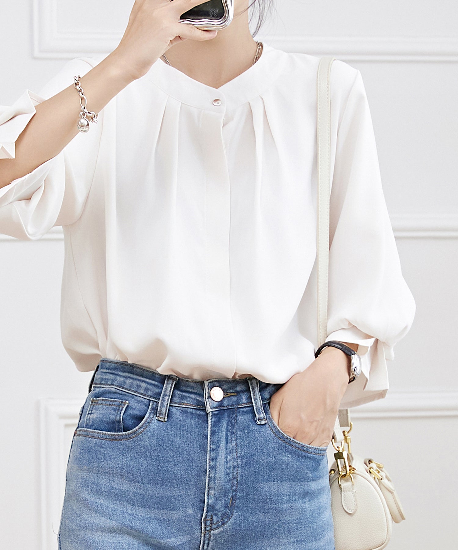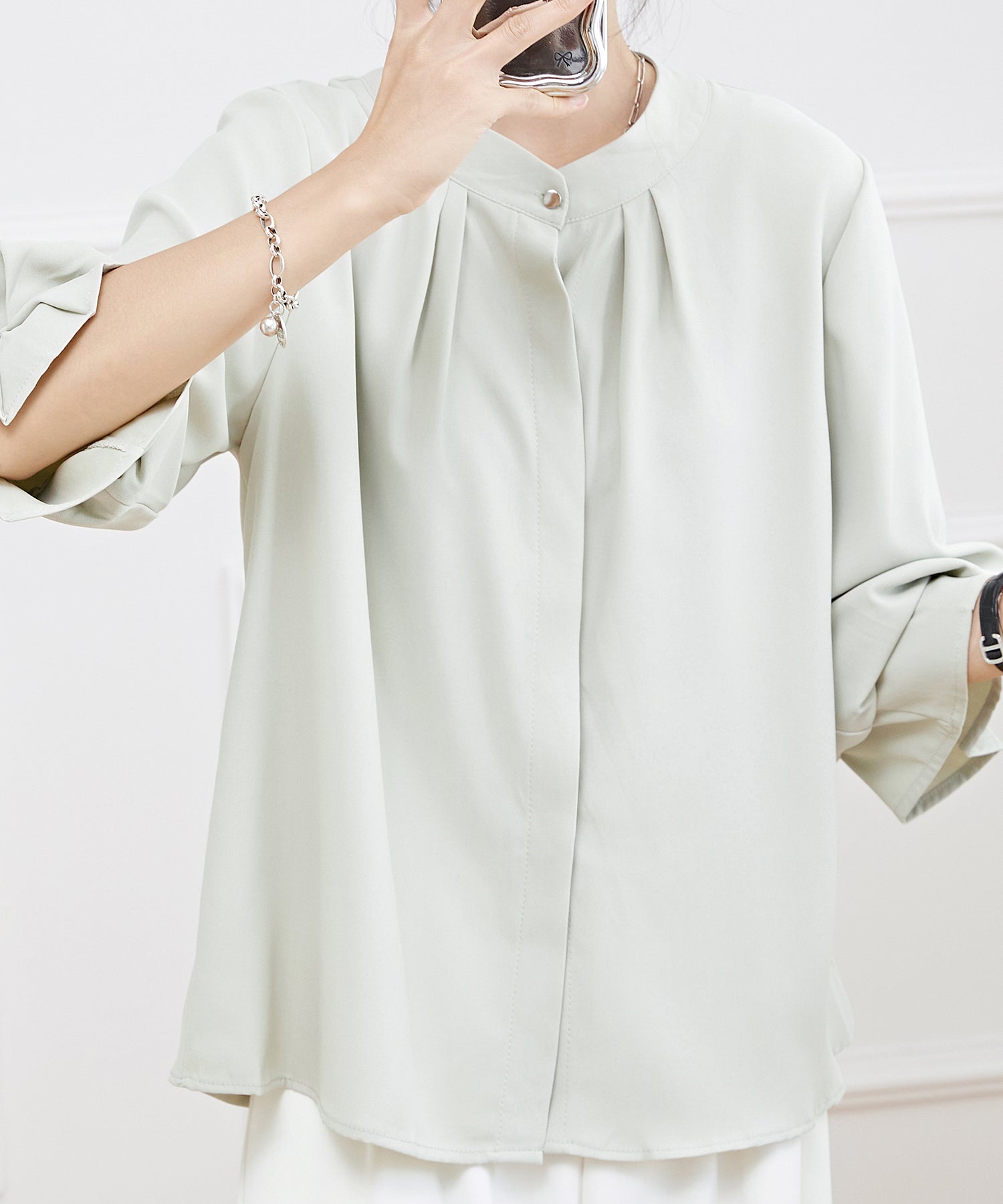 首元は上品なバンドカラー、アクセントには小さめのボタンをセット。