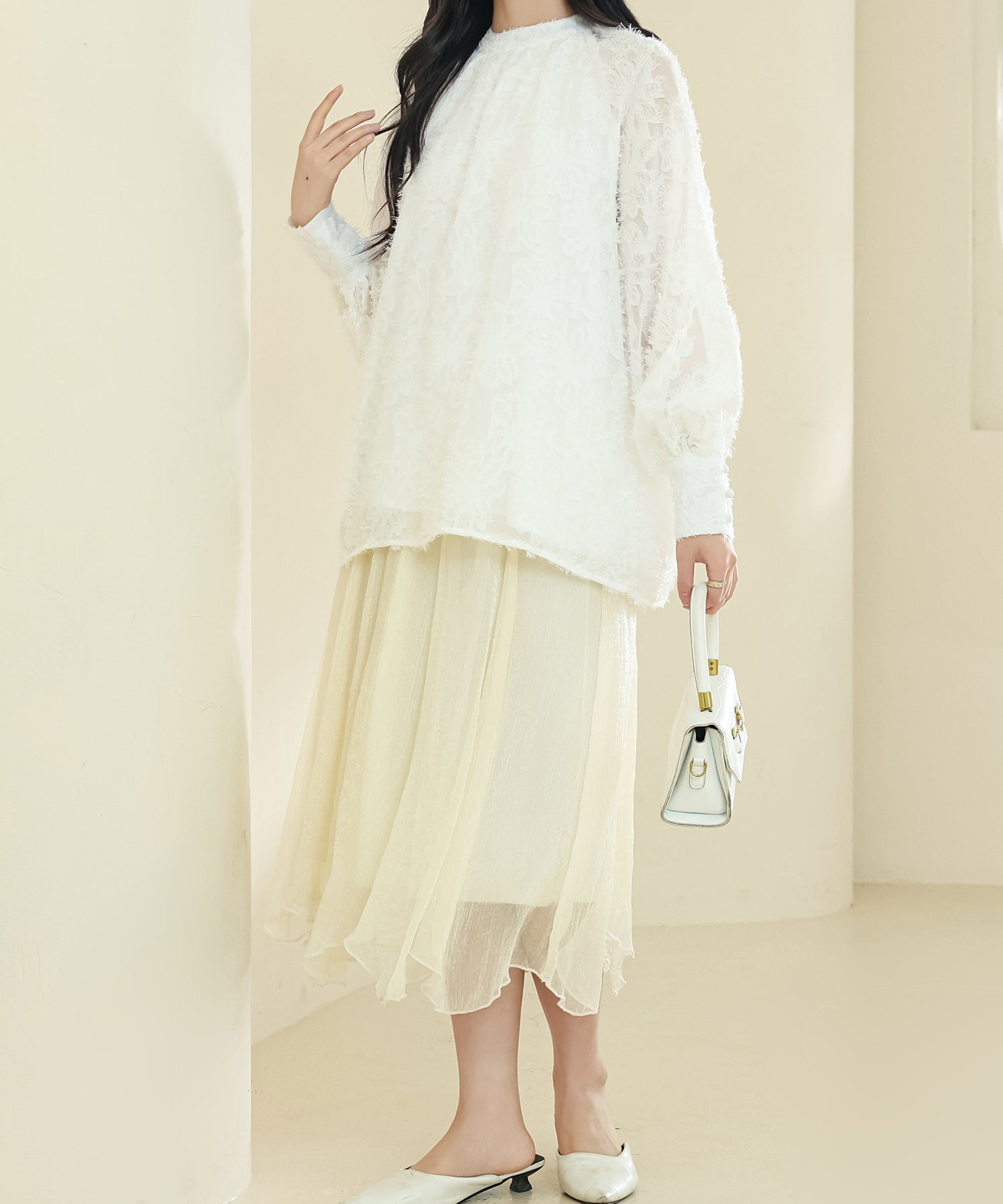 トレンドのシアー生地をベースにした1枚で、季節の変わり目にも使いやすいアイテムに仕上げました。