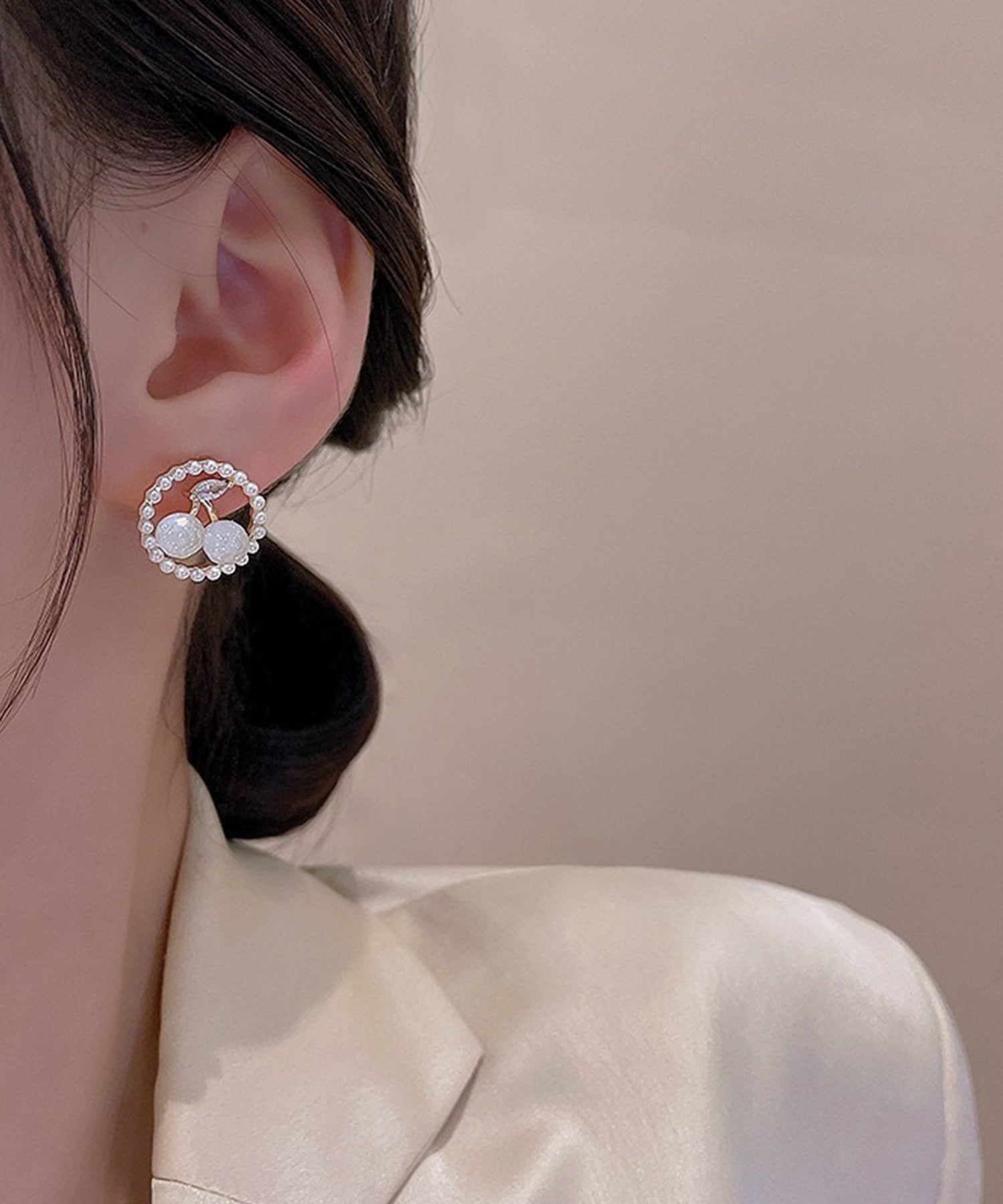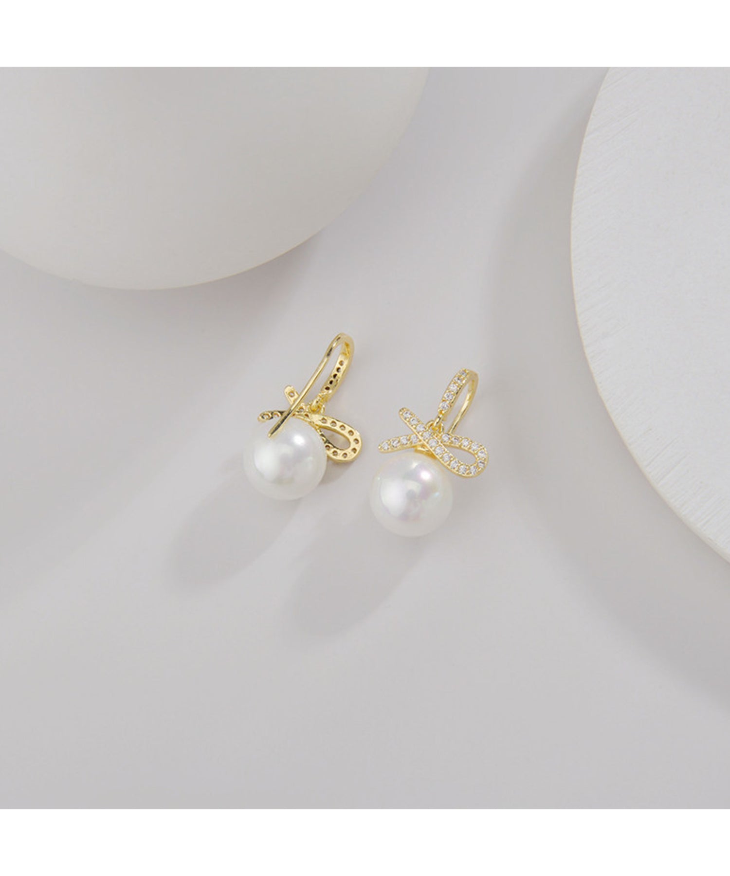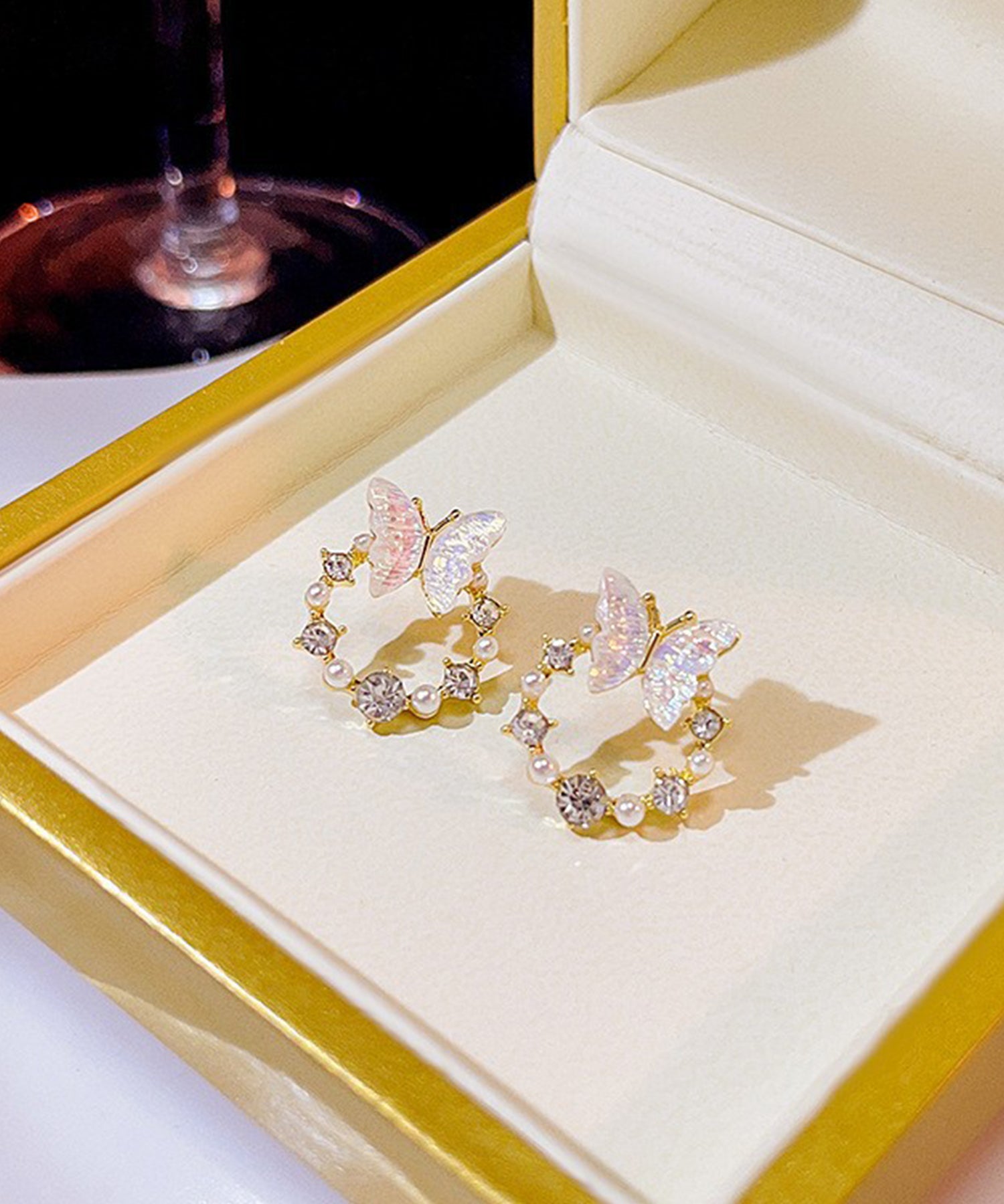 パールやビジュー、バタフライなど、華やかなモチーフを採用しておつくりしたデザインピアス。