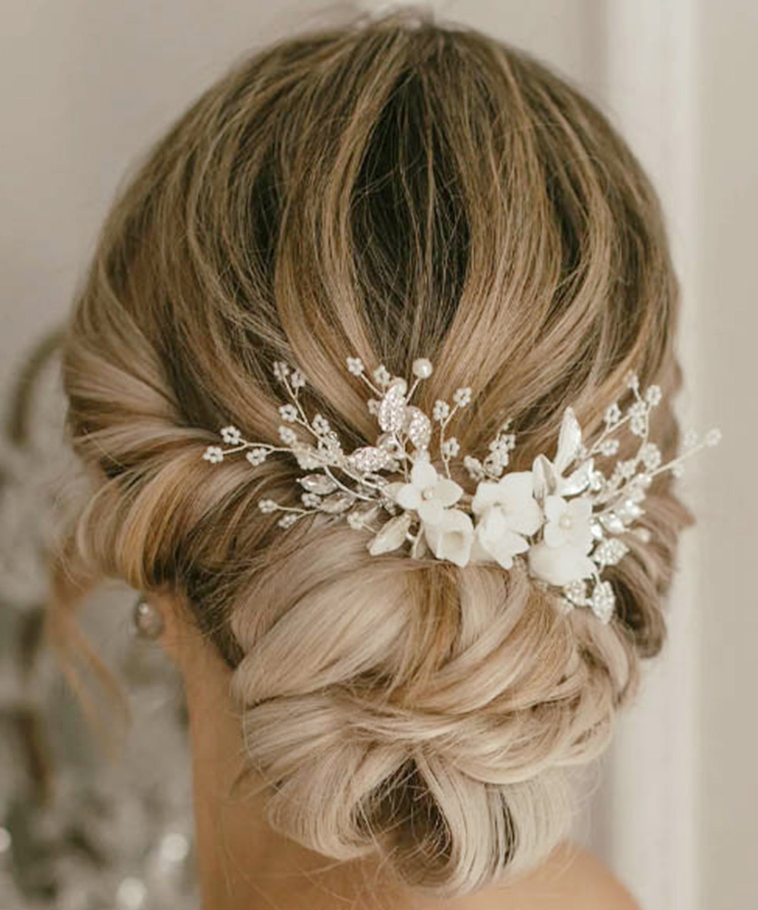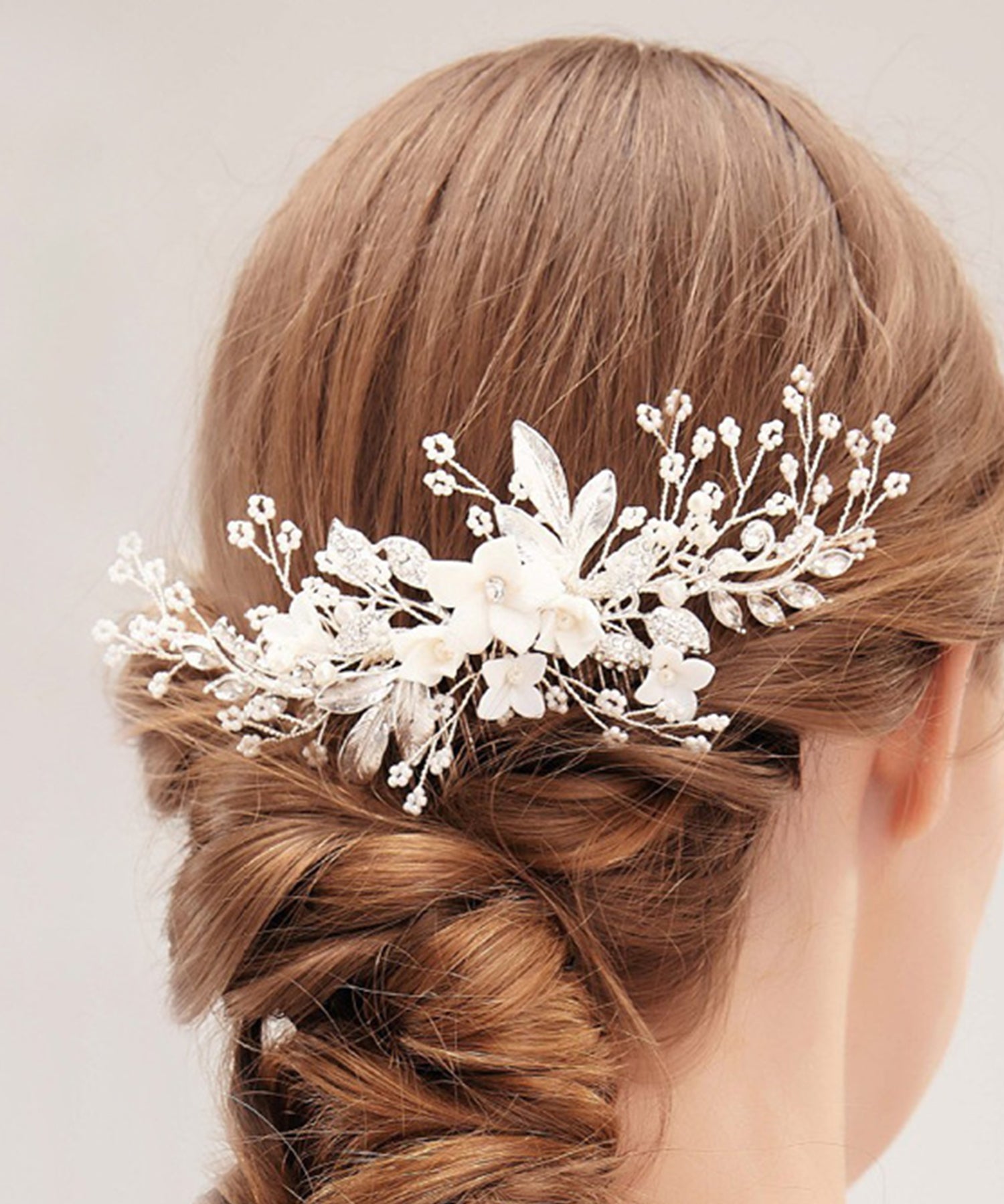 大小サイズ感の異なる繊細な花々が、ヘアアレンジを華やかに演出しします。