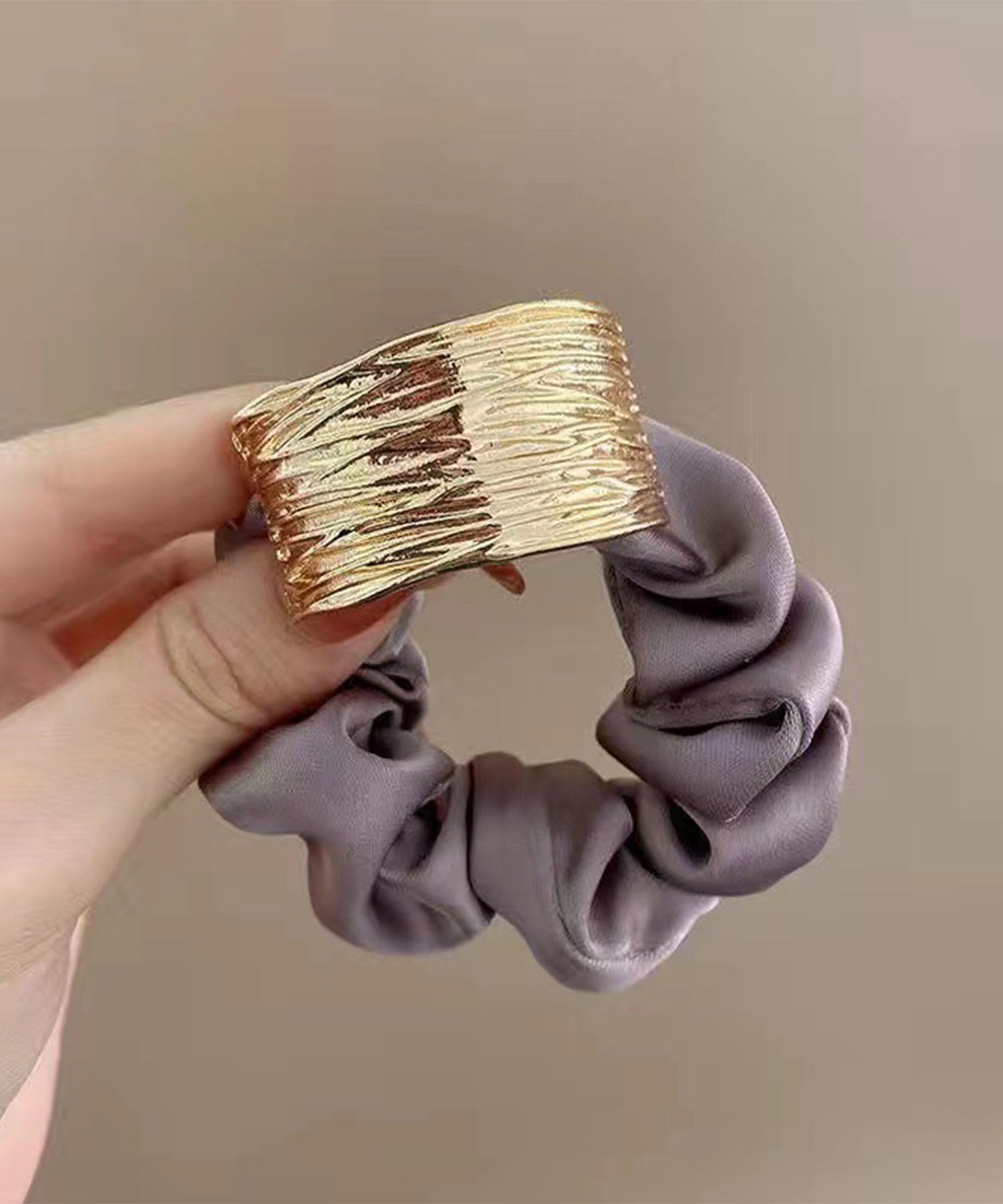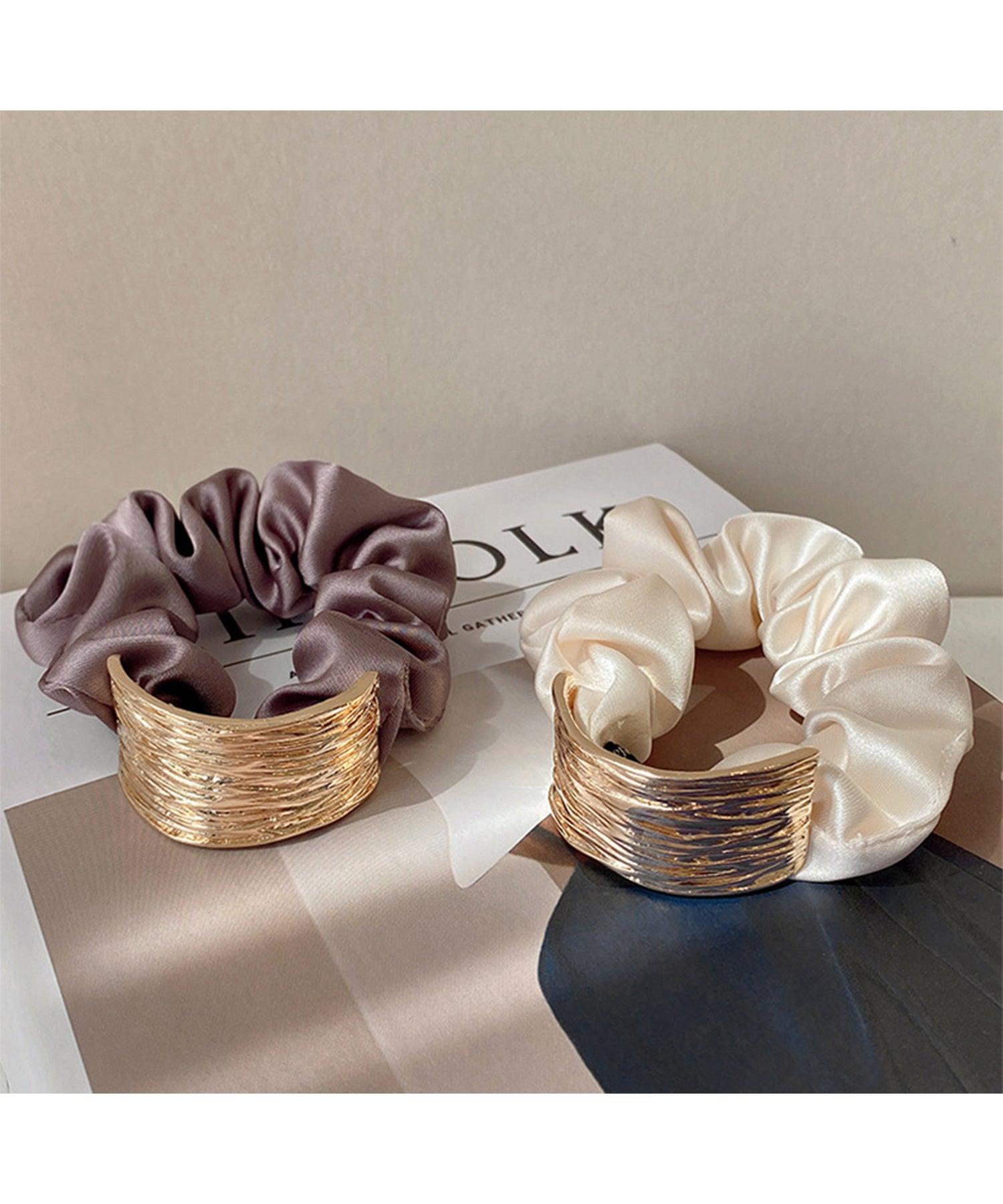 メタリック プレート付き サテン調 シュシュ ゴム