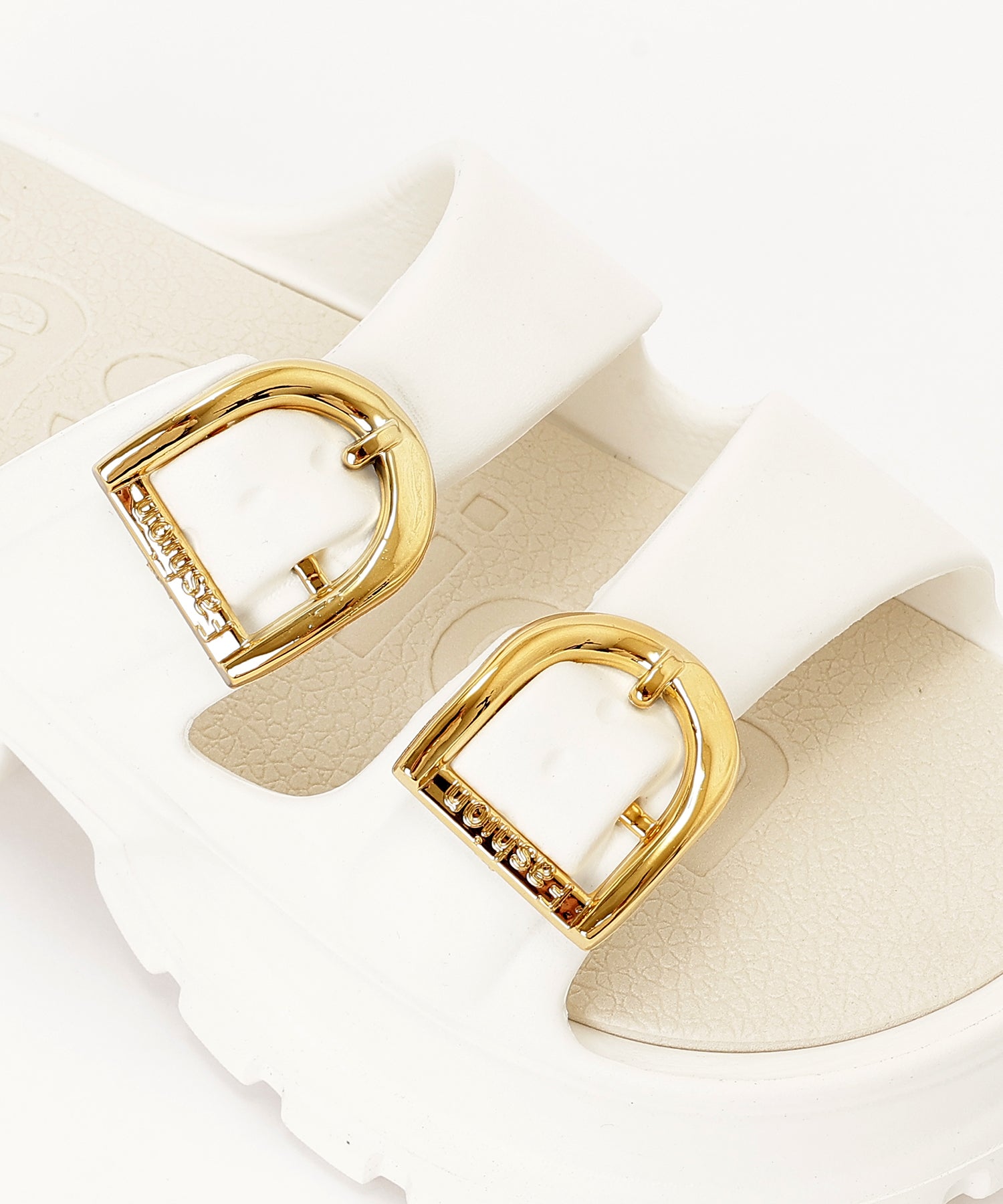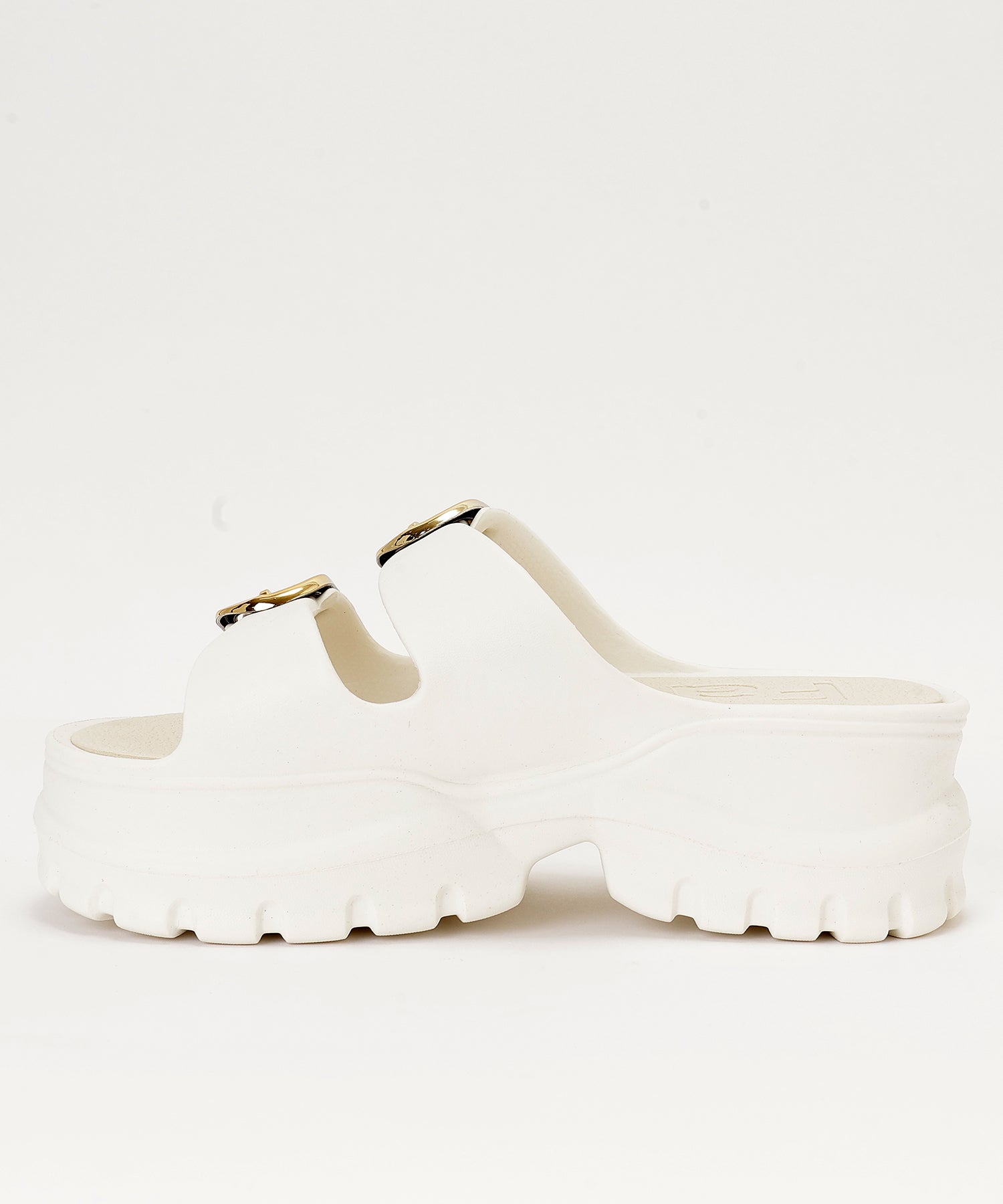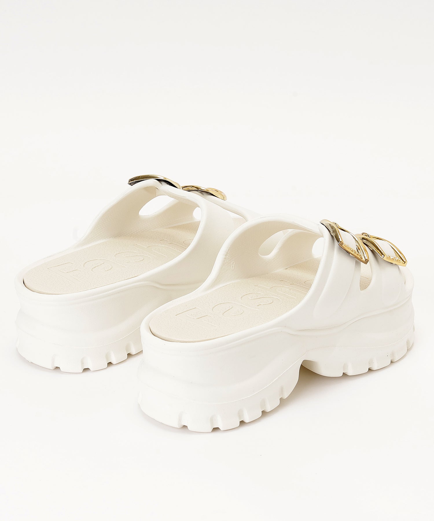 ゴールド使いのベルトデザインが映える厚底サンダル。