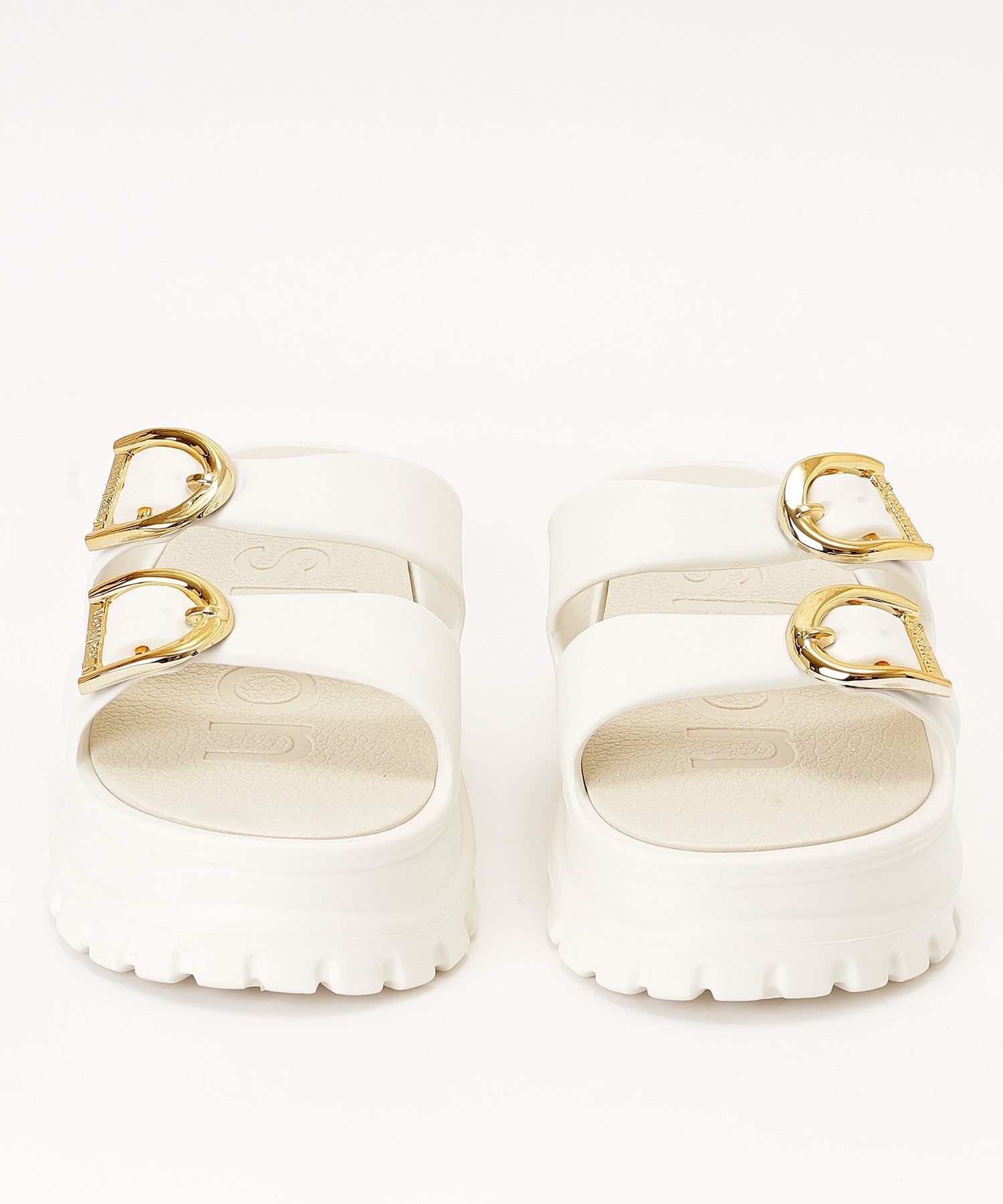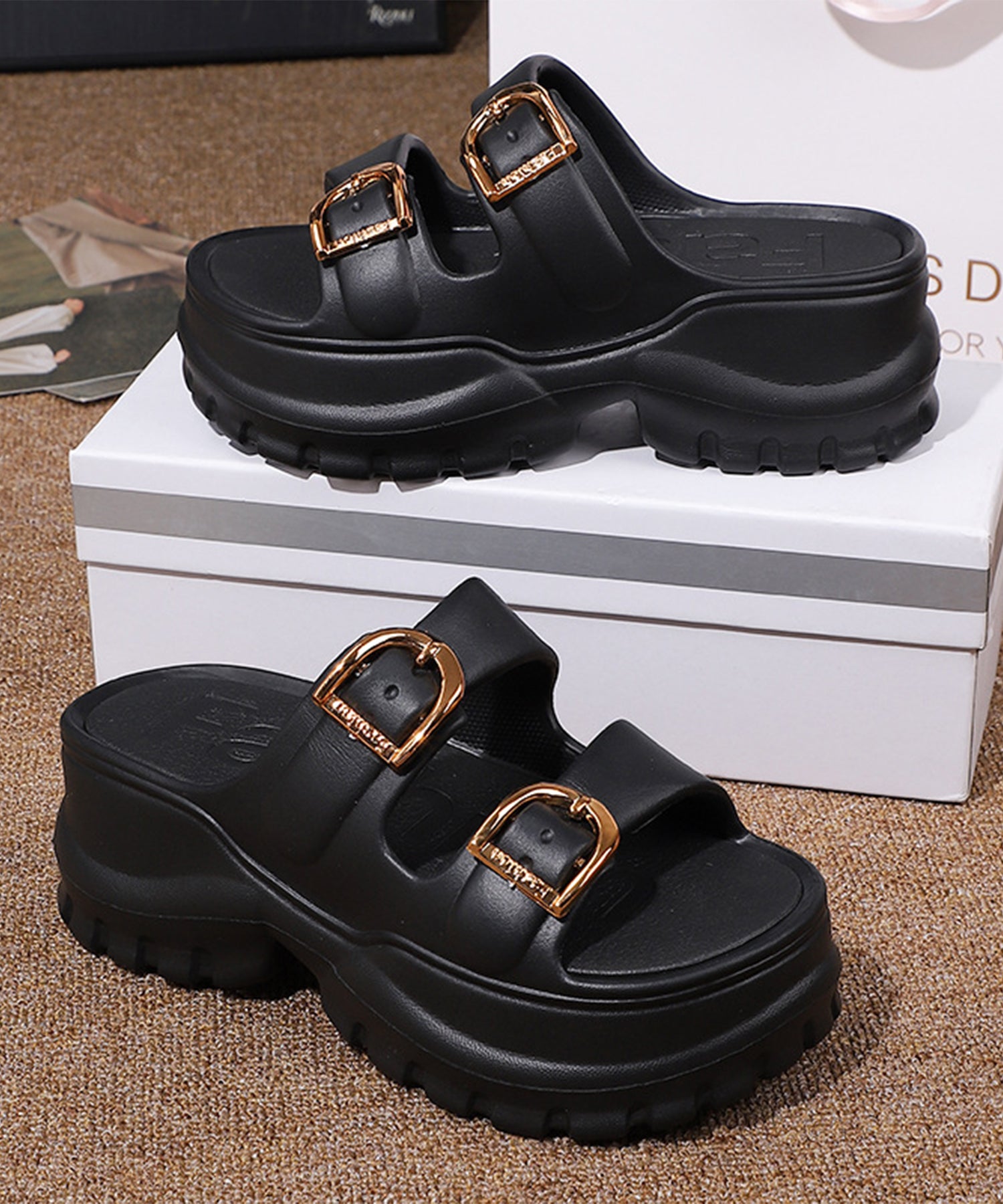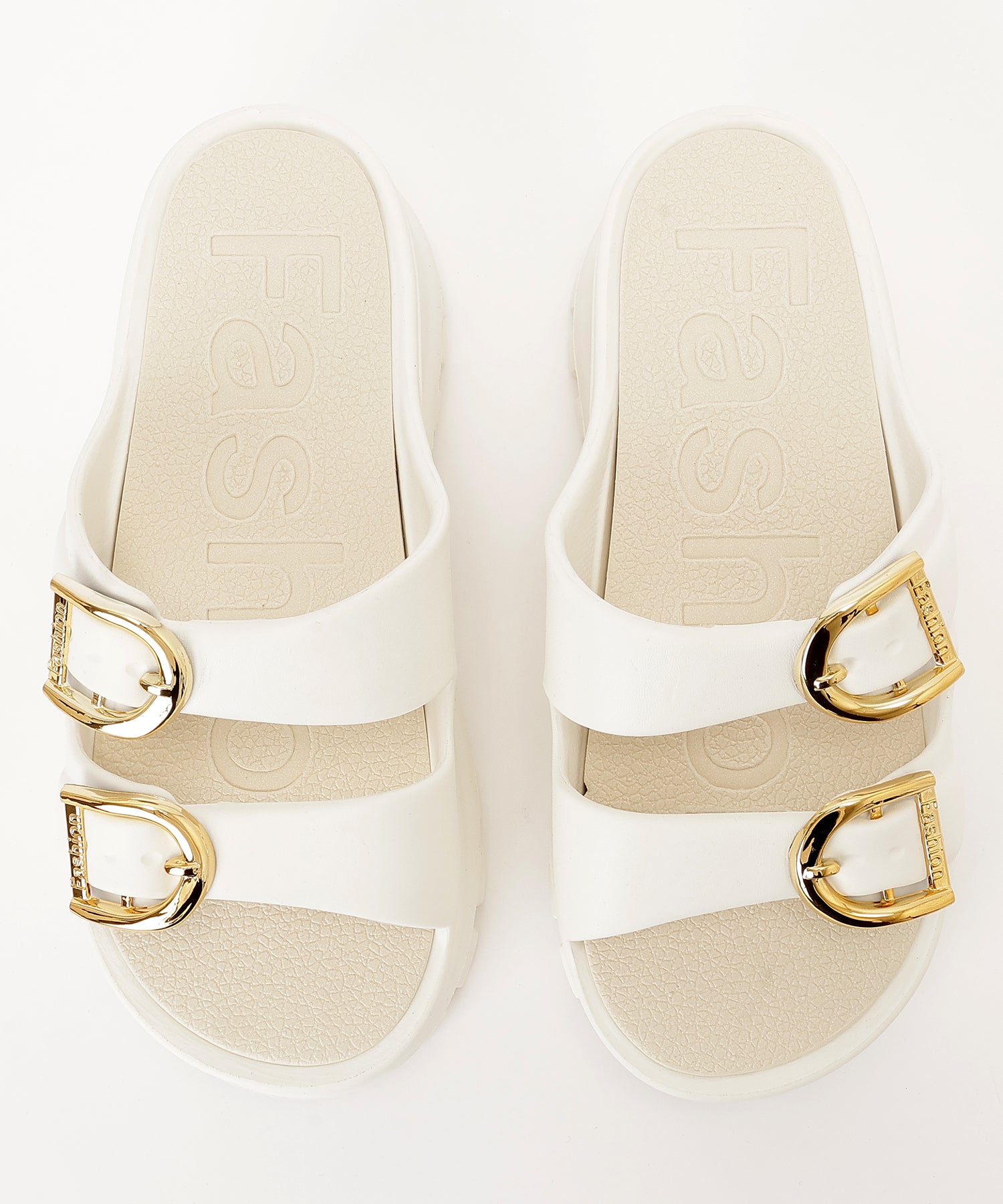ゴールド使いのベルトデザインが映える厚底サンダル。