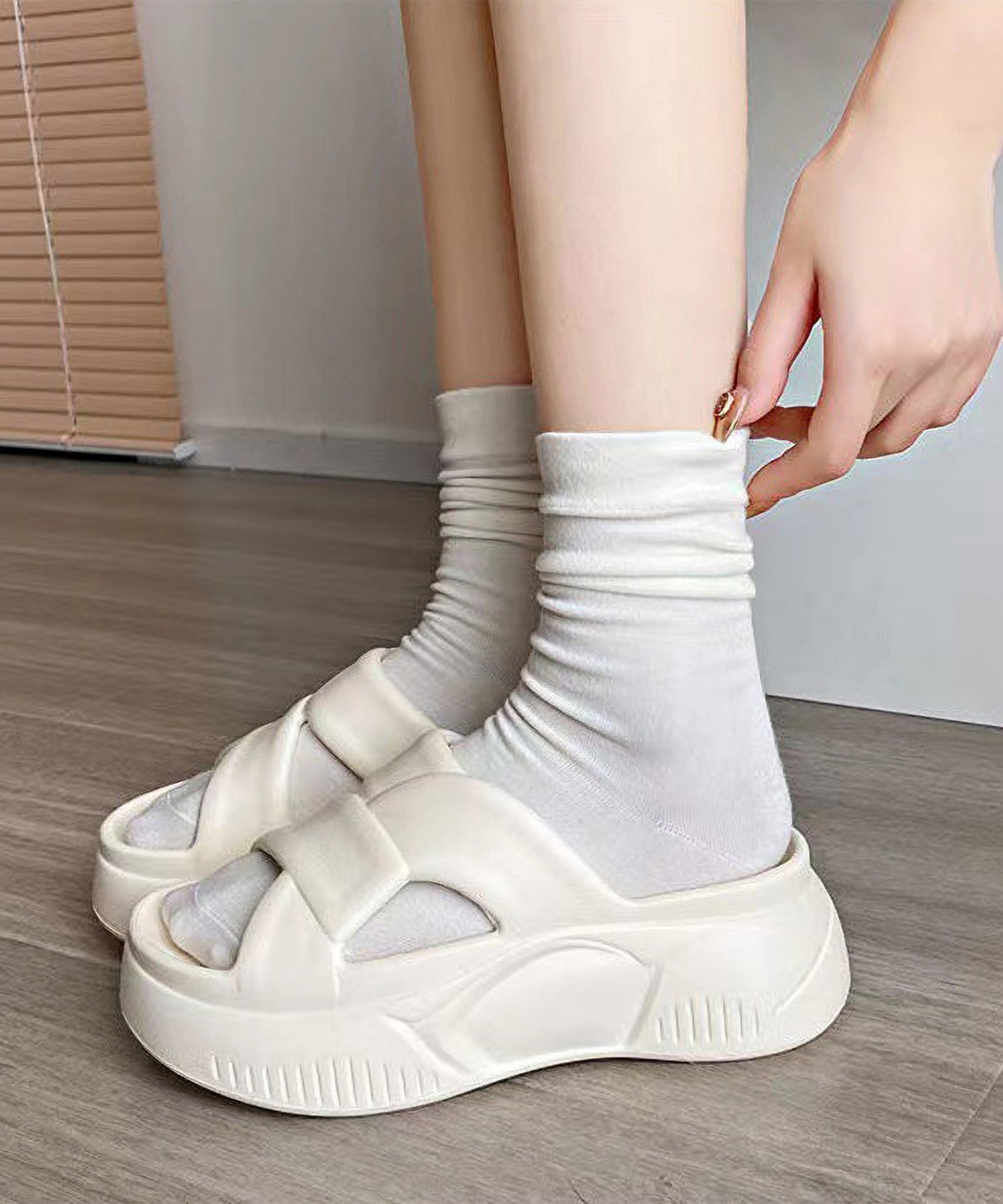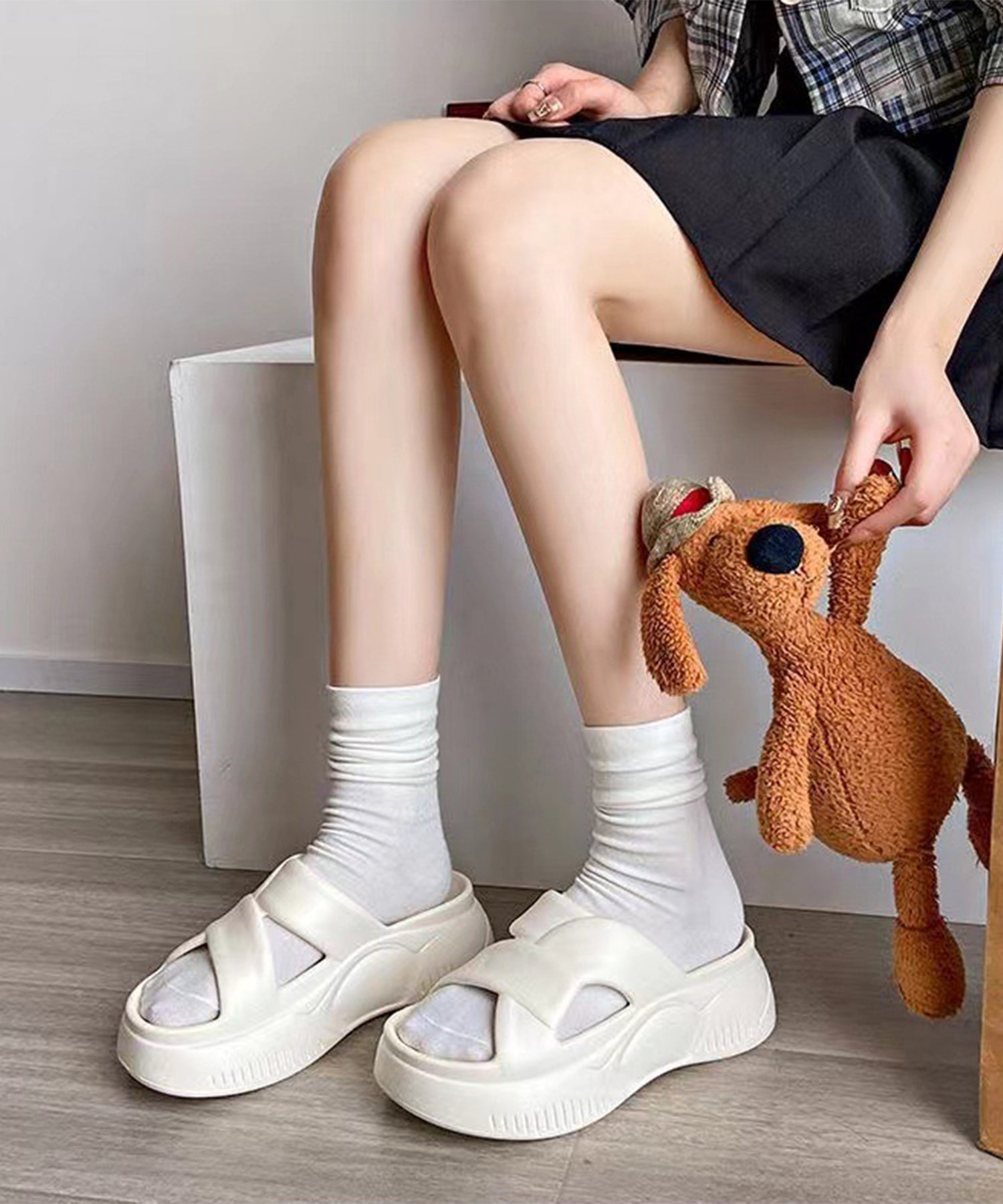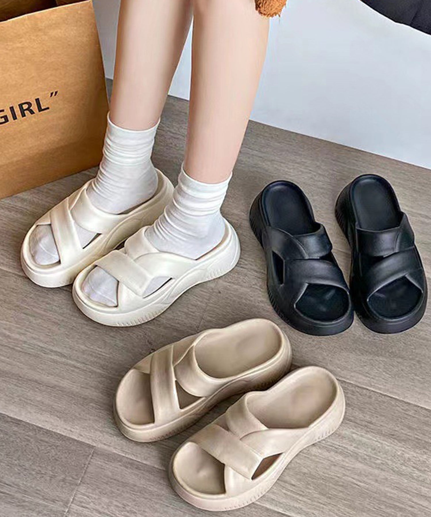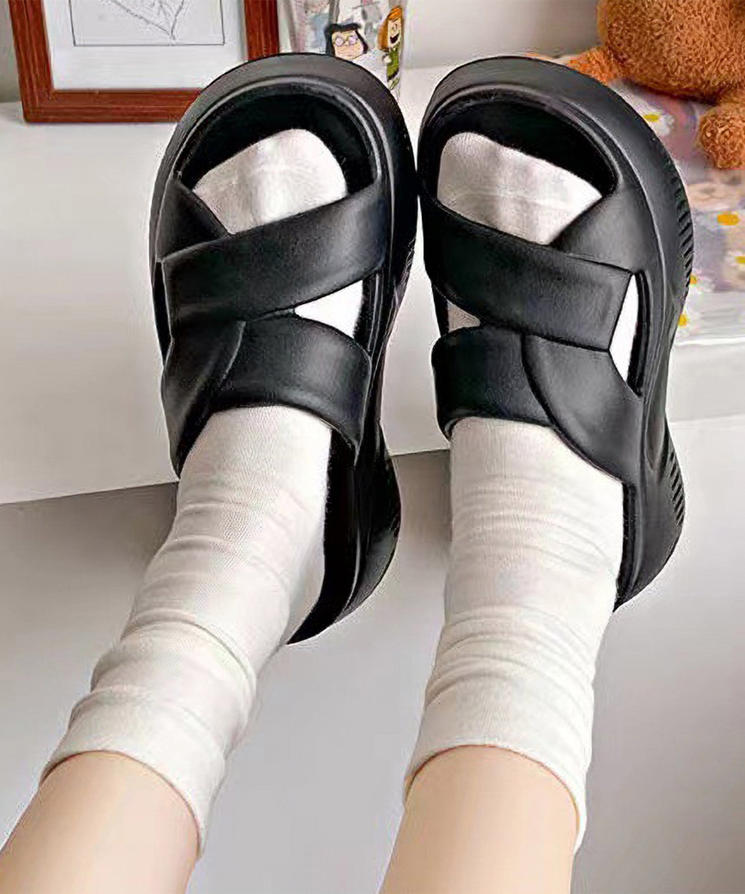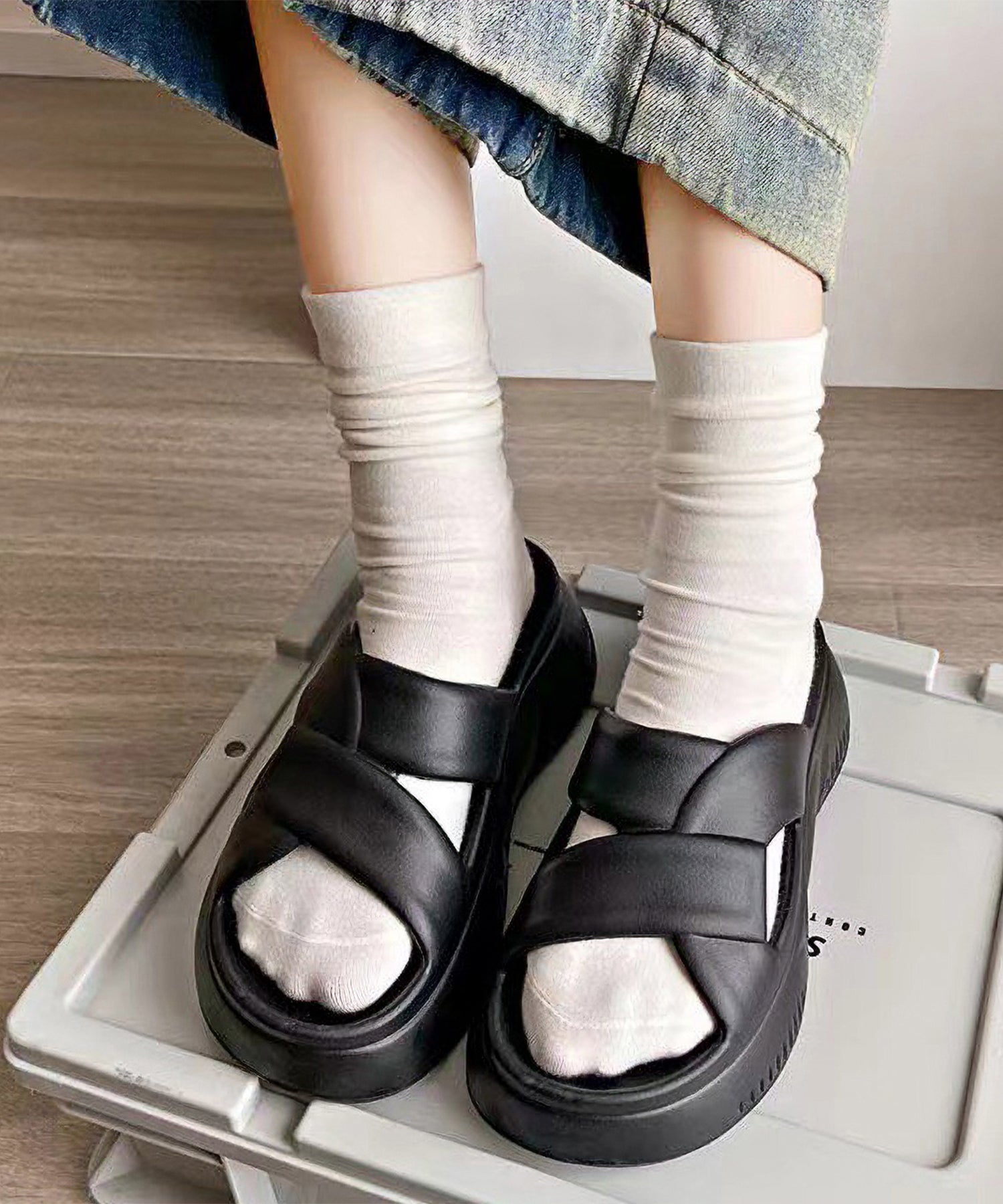 クロスストラップ風のアッパーがおしゃれ見えする厚底サンダル。