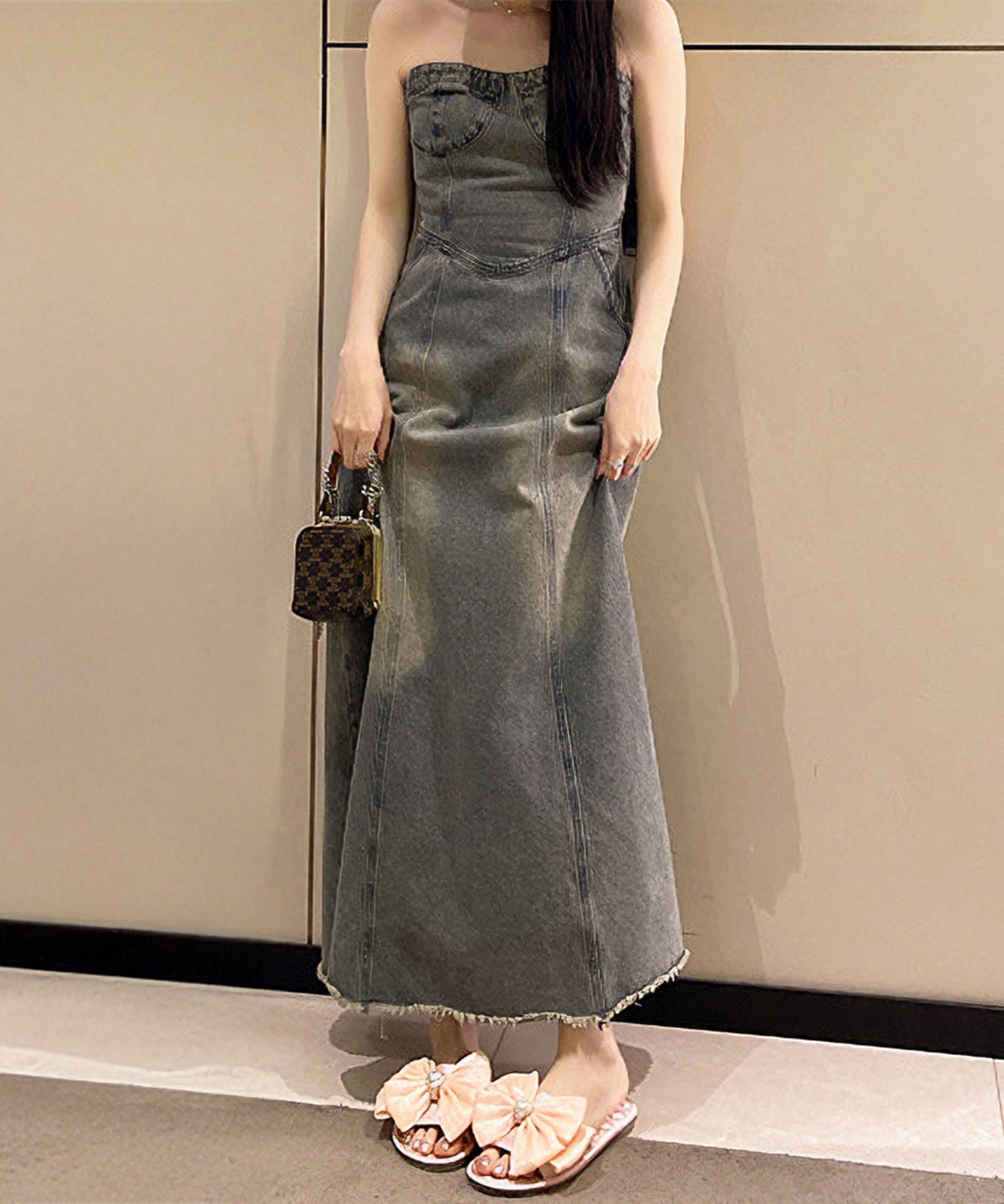 オーガンジー フリル ペプラム レイヤード ロング ドレス