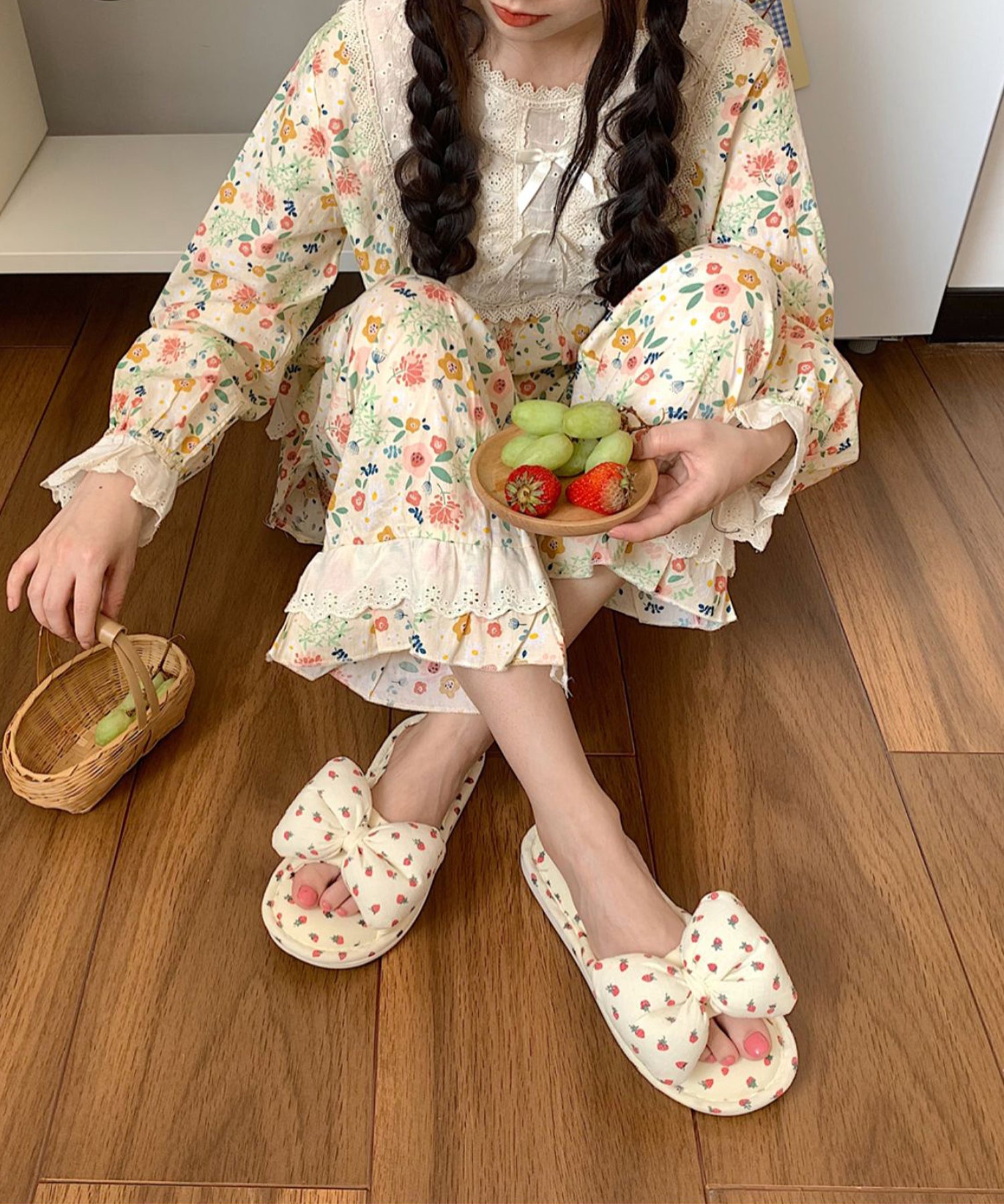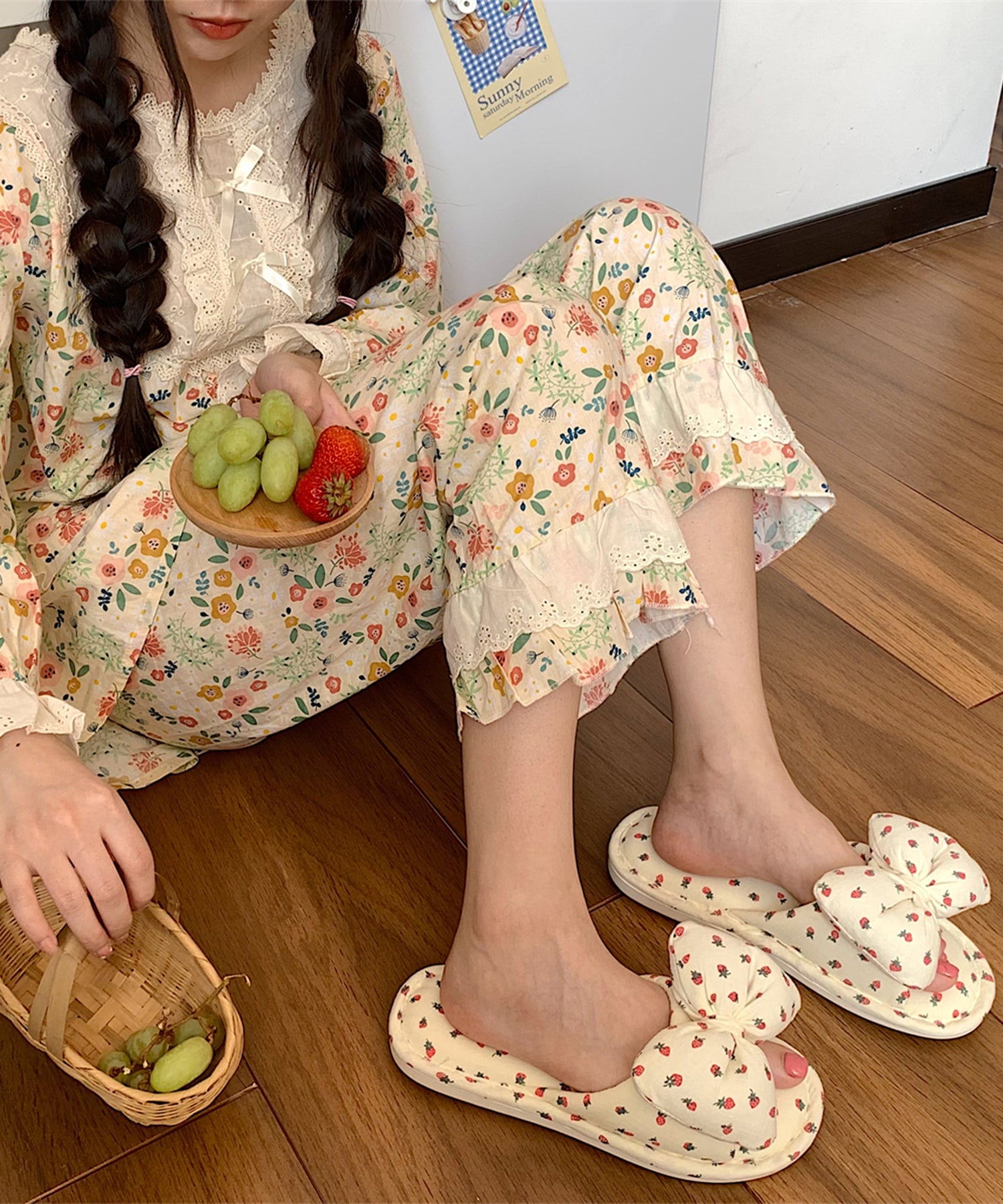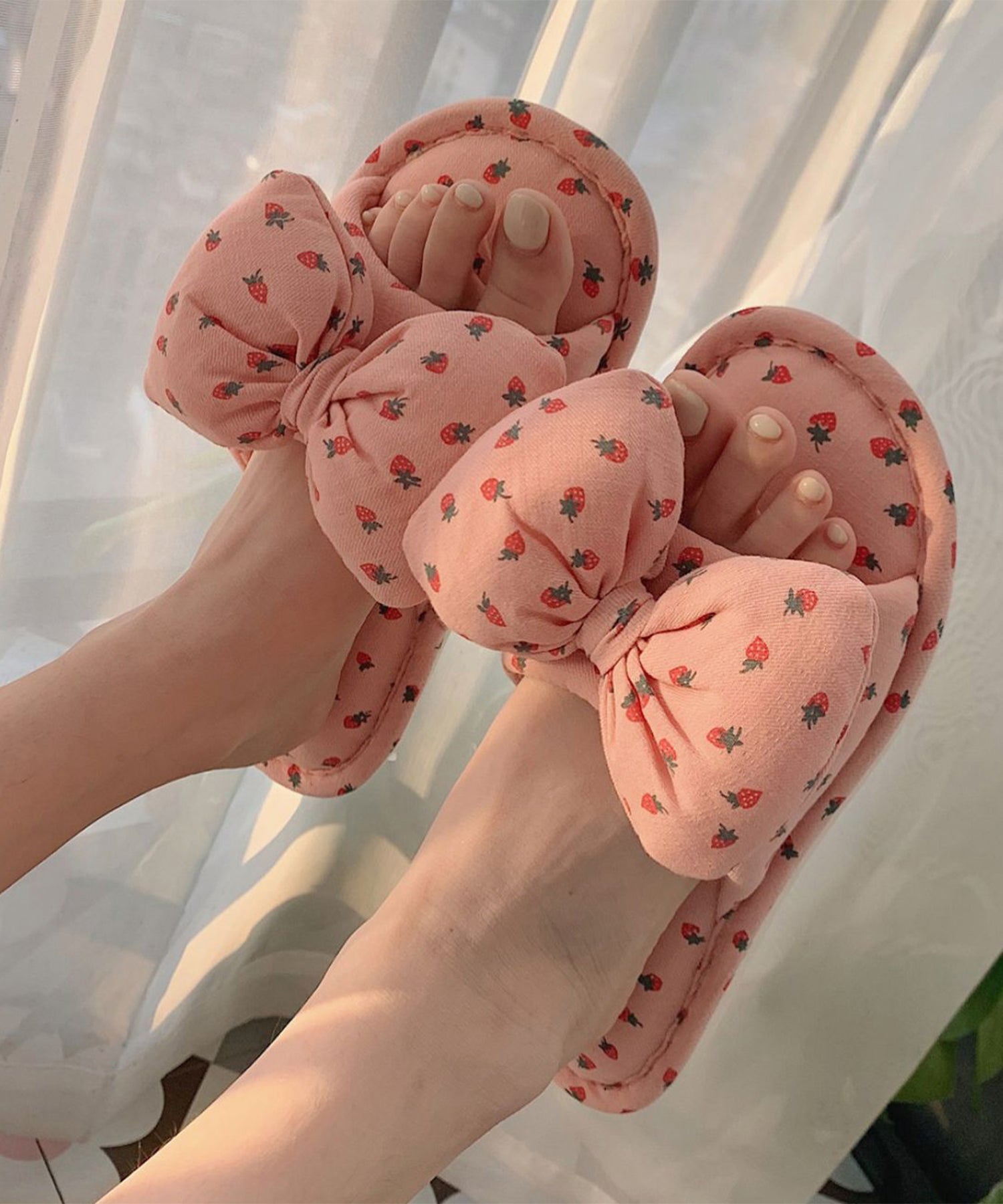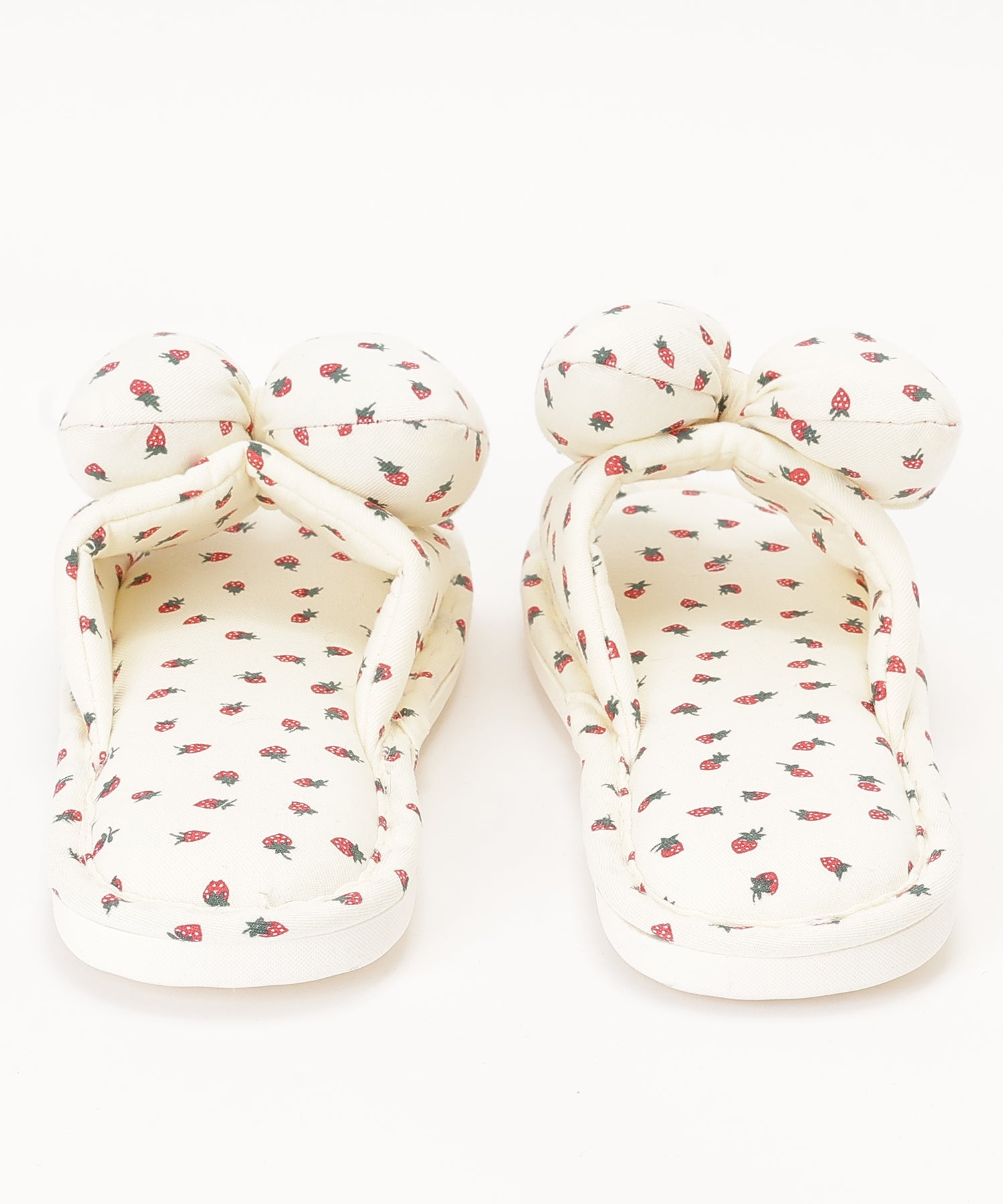 イチゴ柄 リボン オープン フラット スリッパ