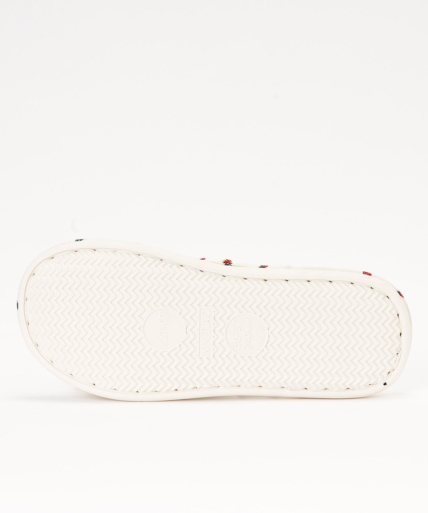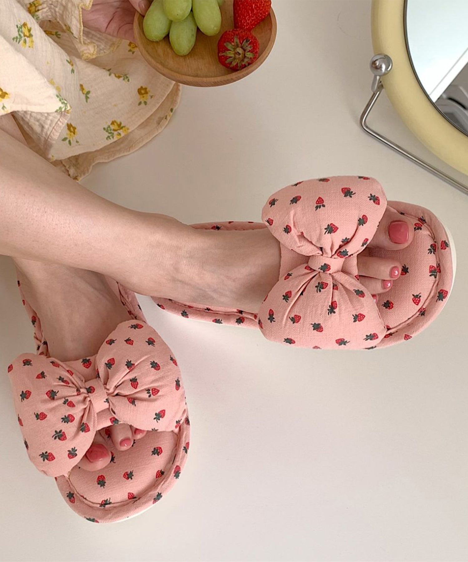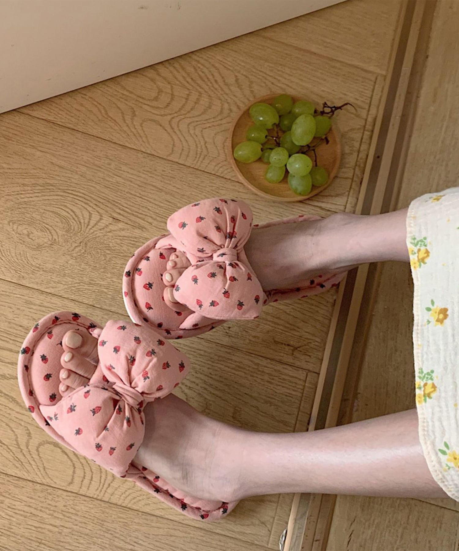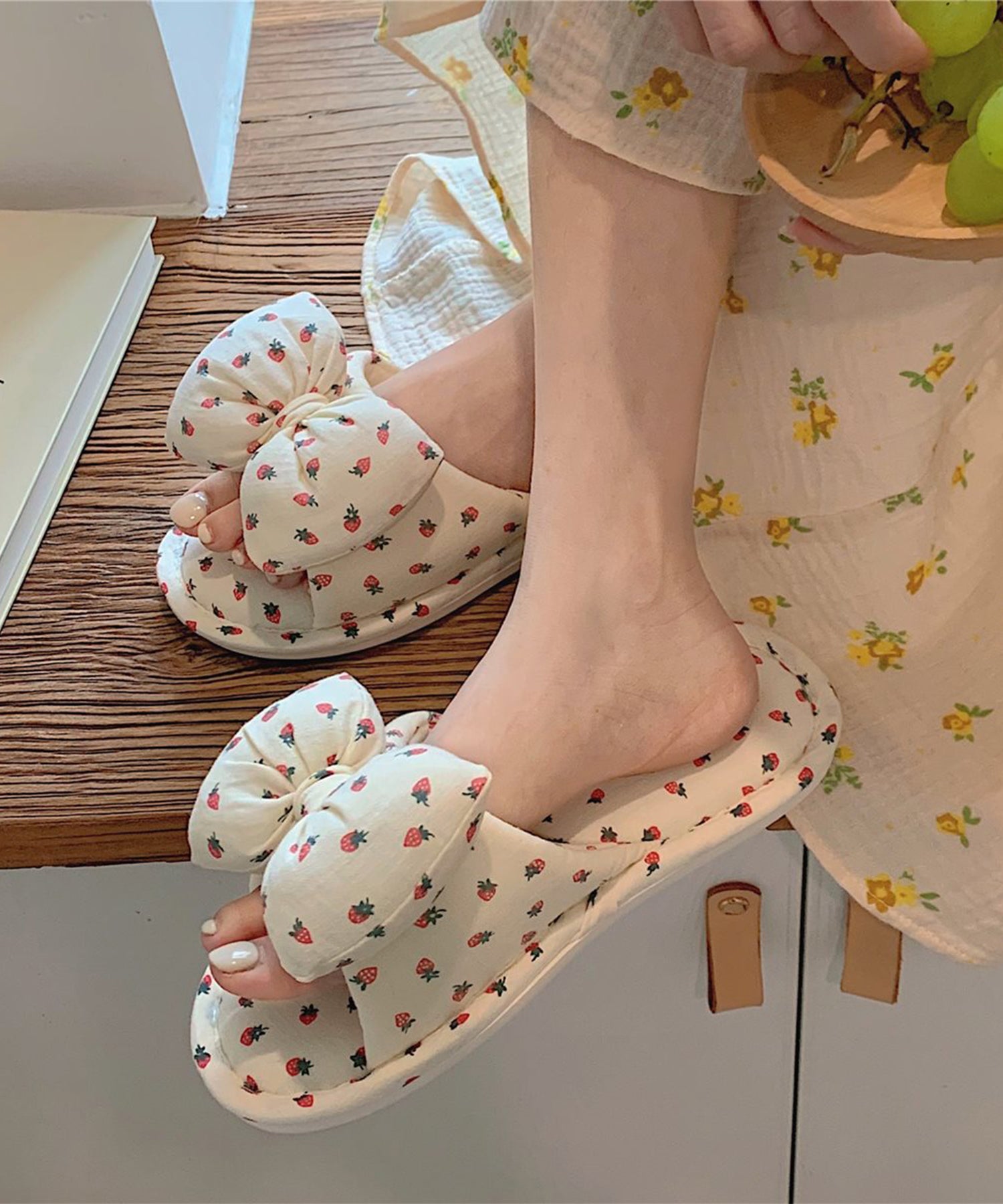 小さなイチゴ柄がキュートなルームスリッパ。