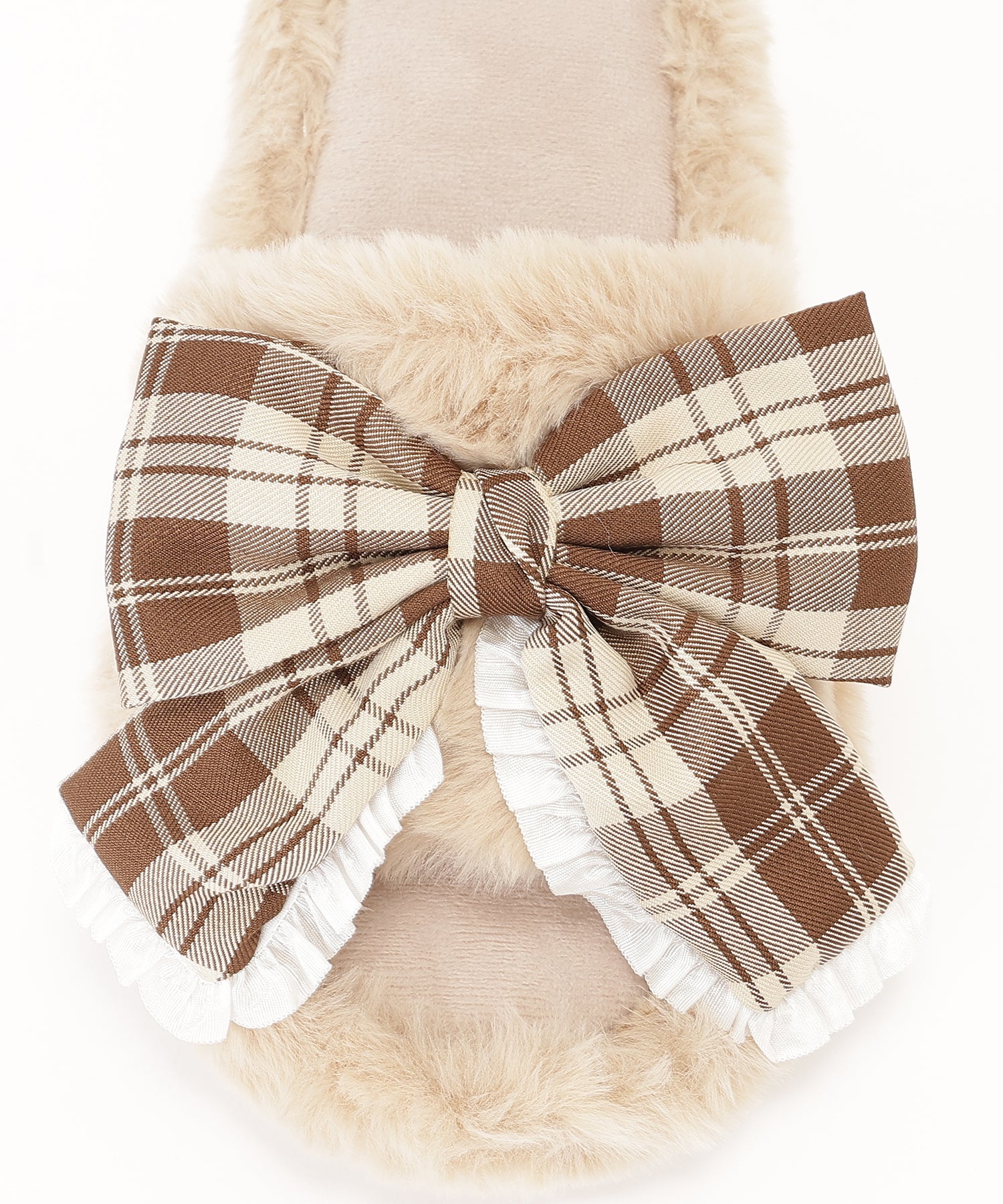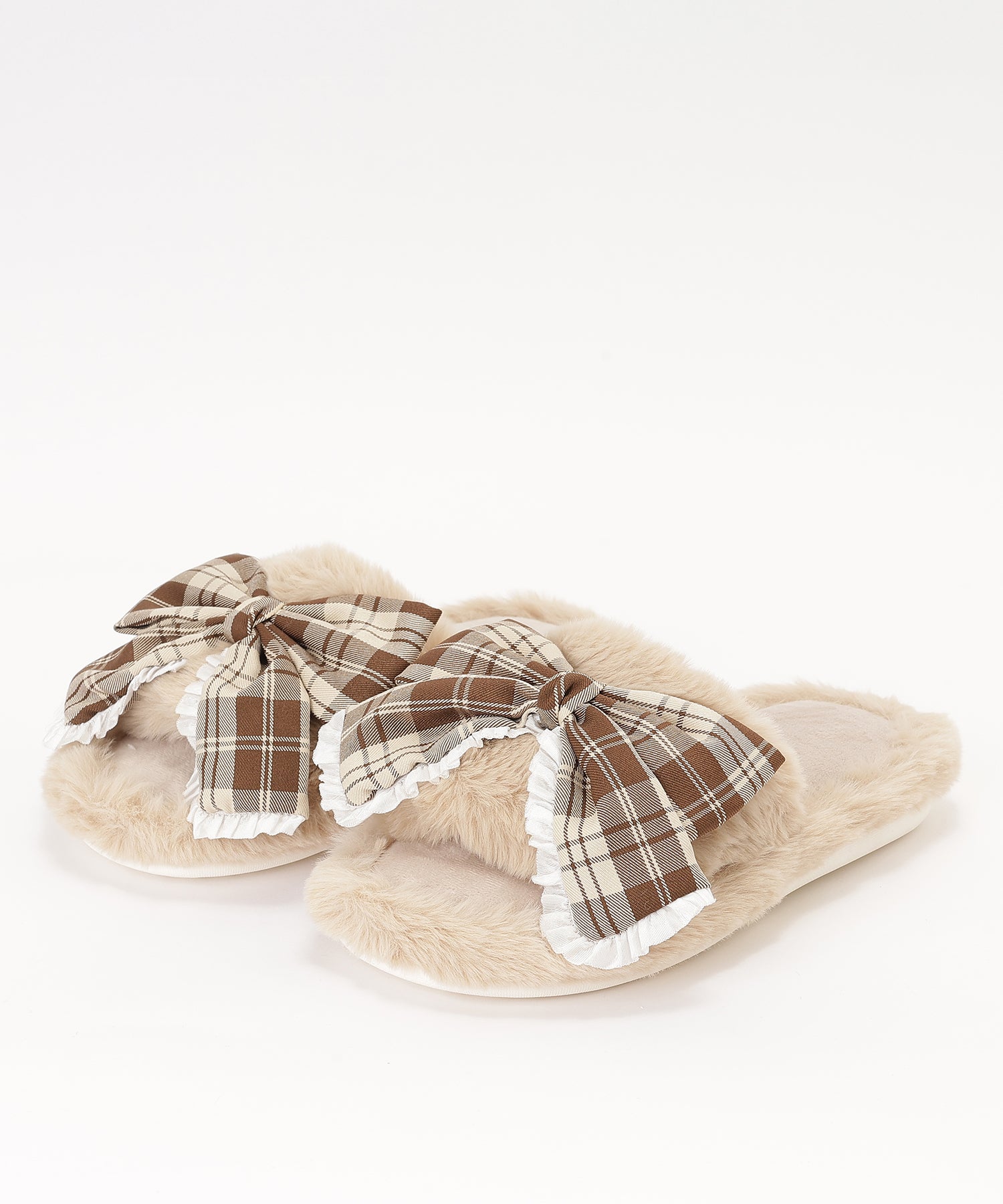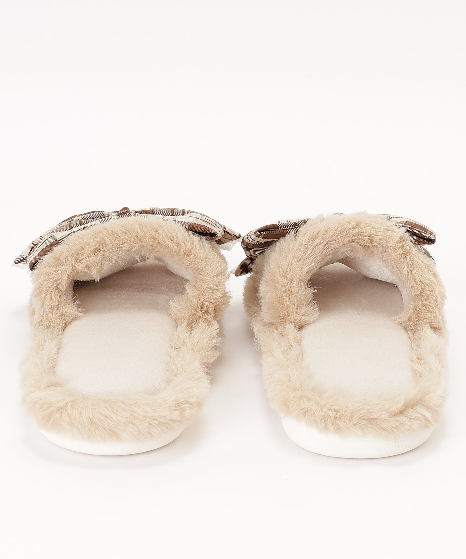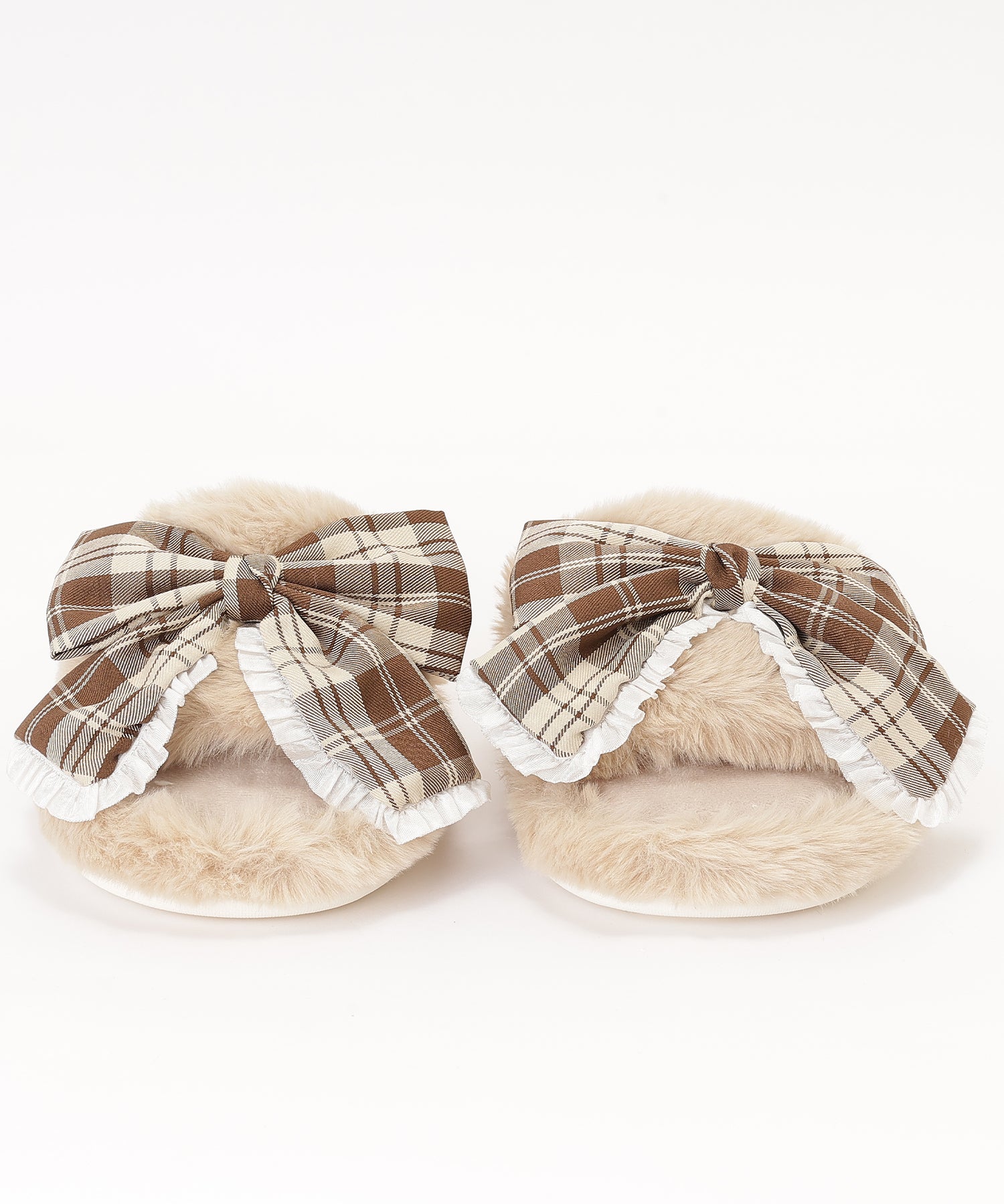 チェック柄 リボン ファー オープン スリッパ ルームシューズ