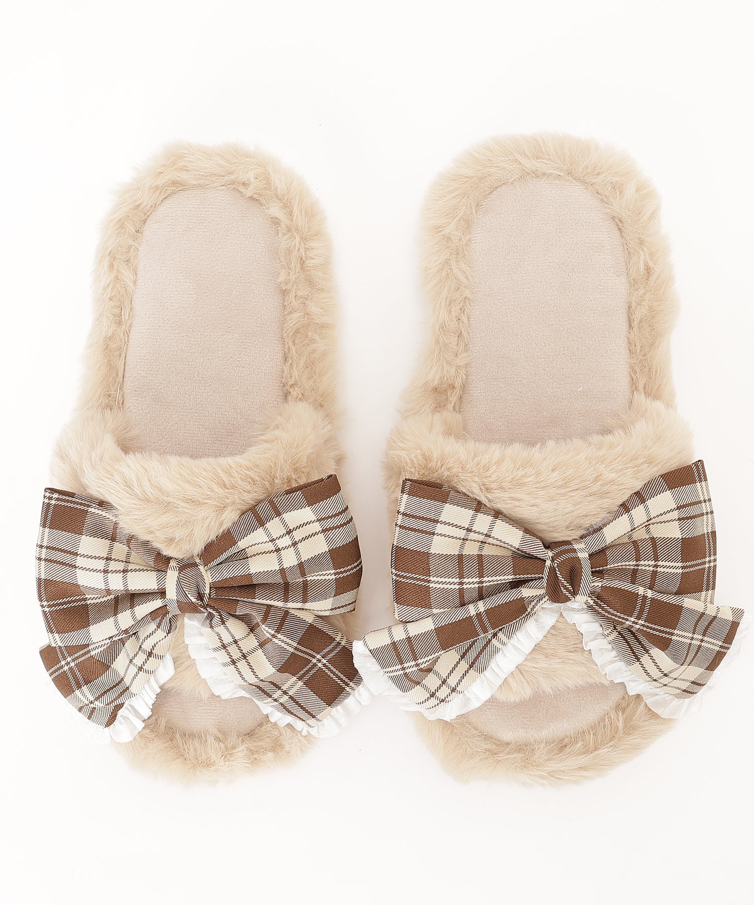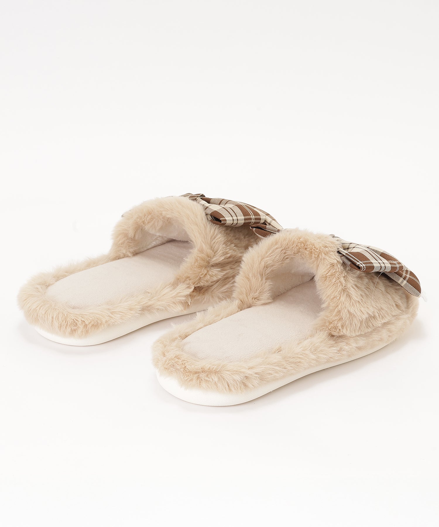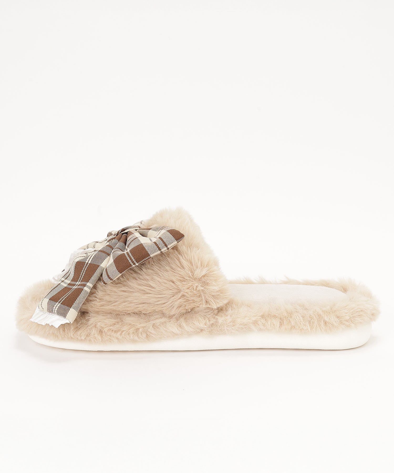 チェック柄 リボン ファー オープン スリッパ ルームシューズ