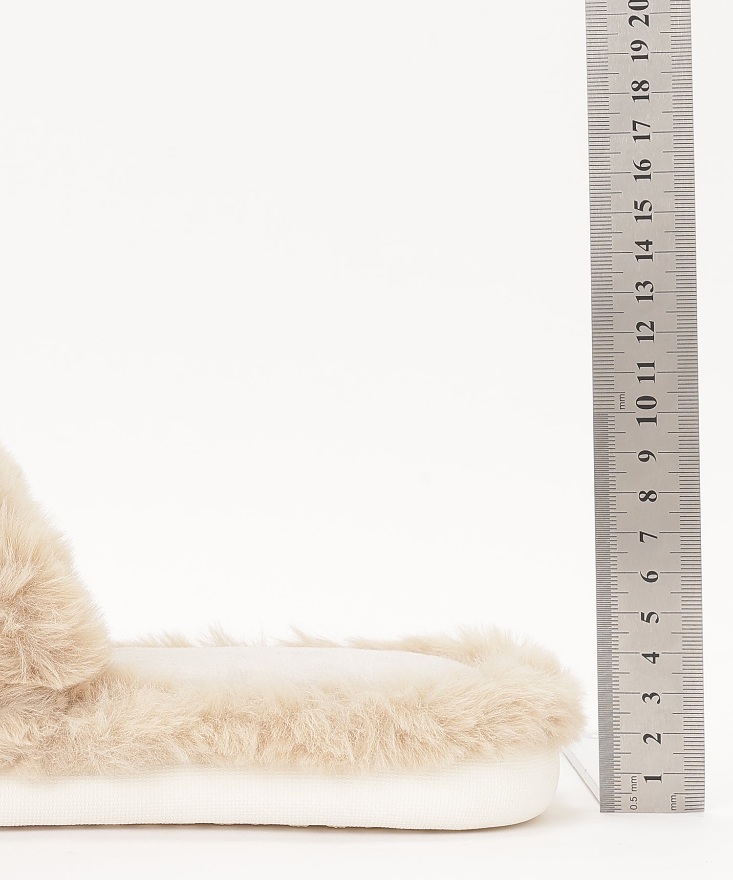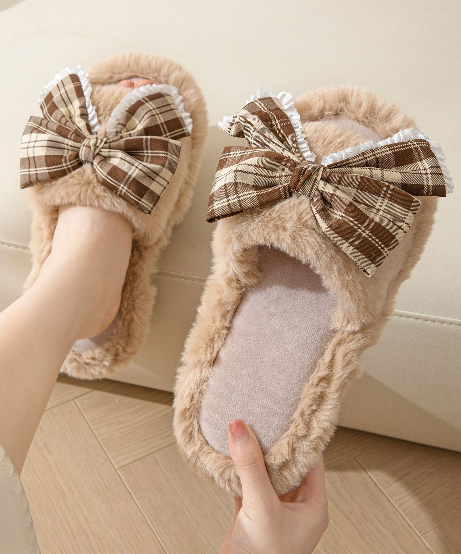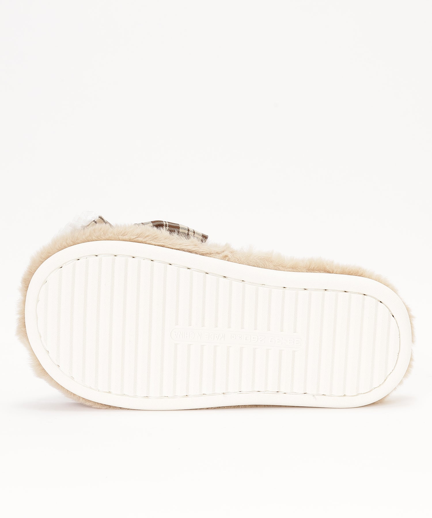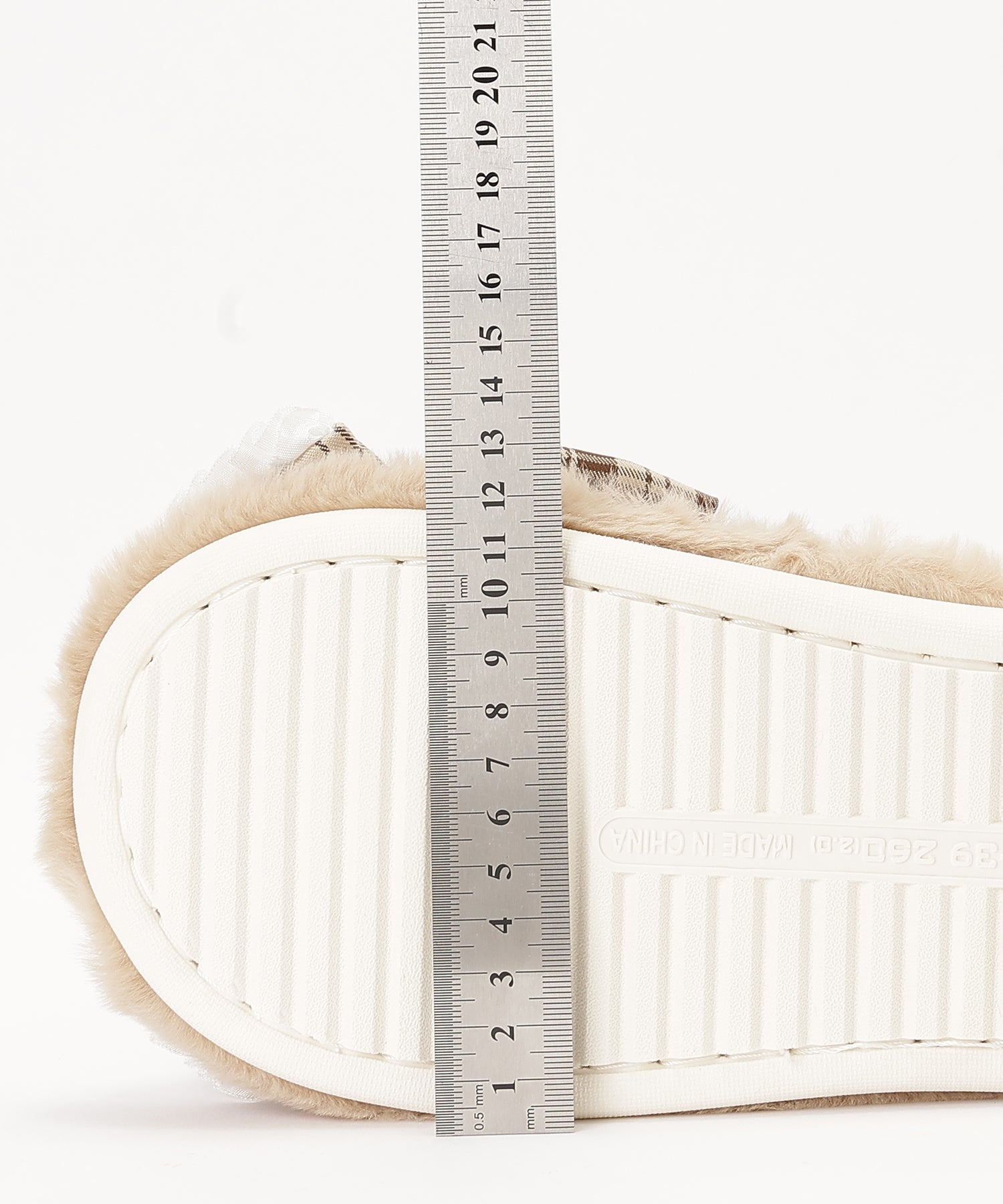 チェック柄 リボン ファー オープン スリッパ ルームシューズ