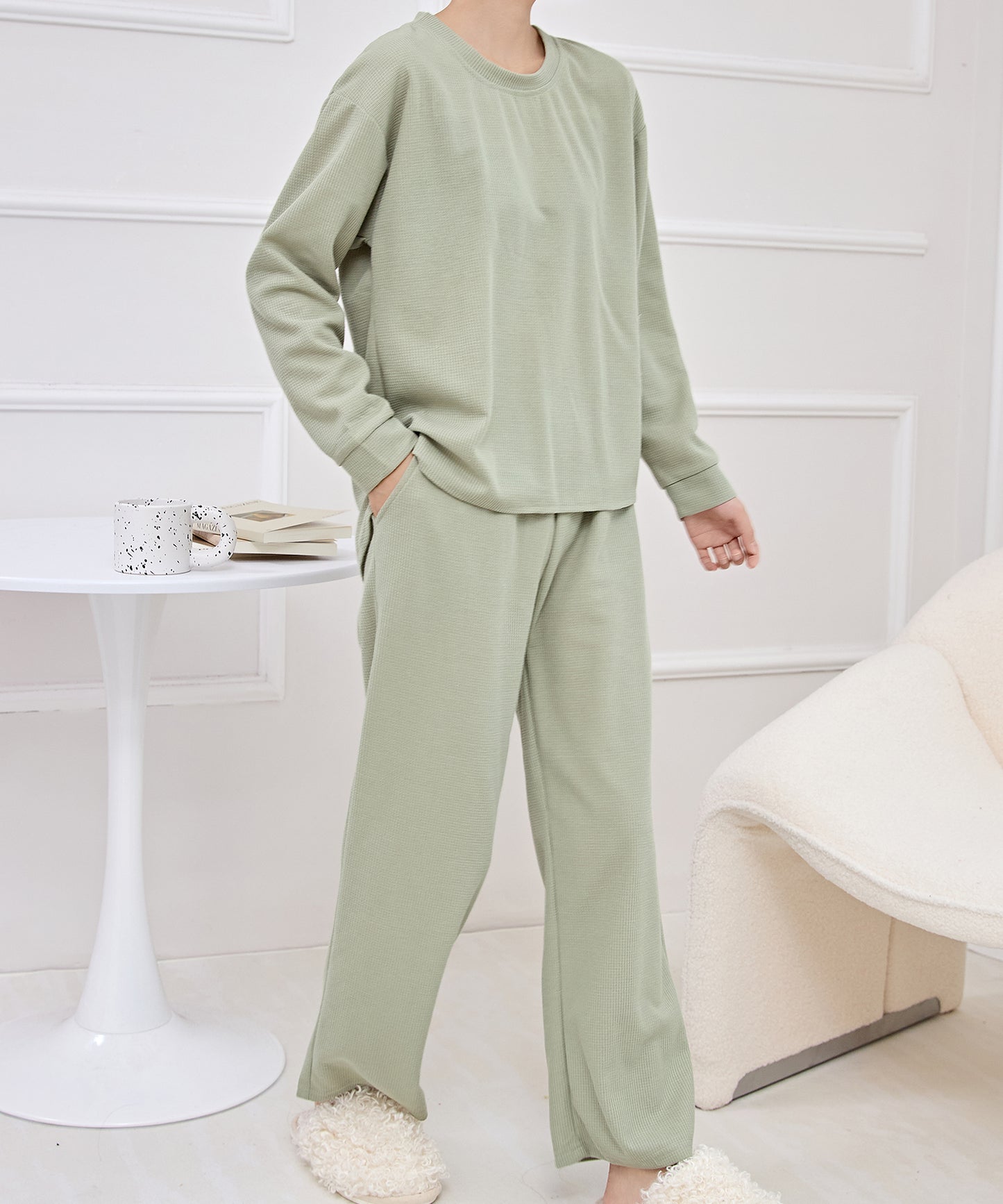 ソリッドカラー ラウンドネック ワッフル 長袖 ルームウエア