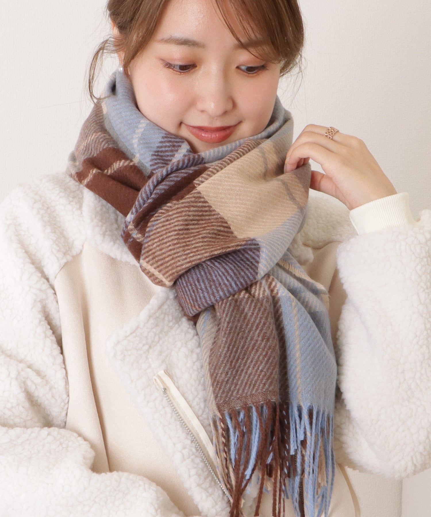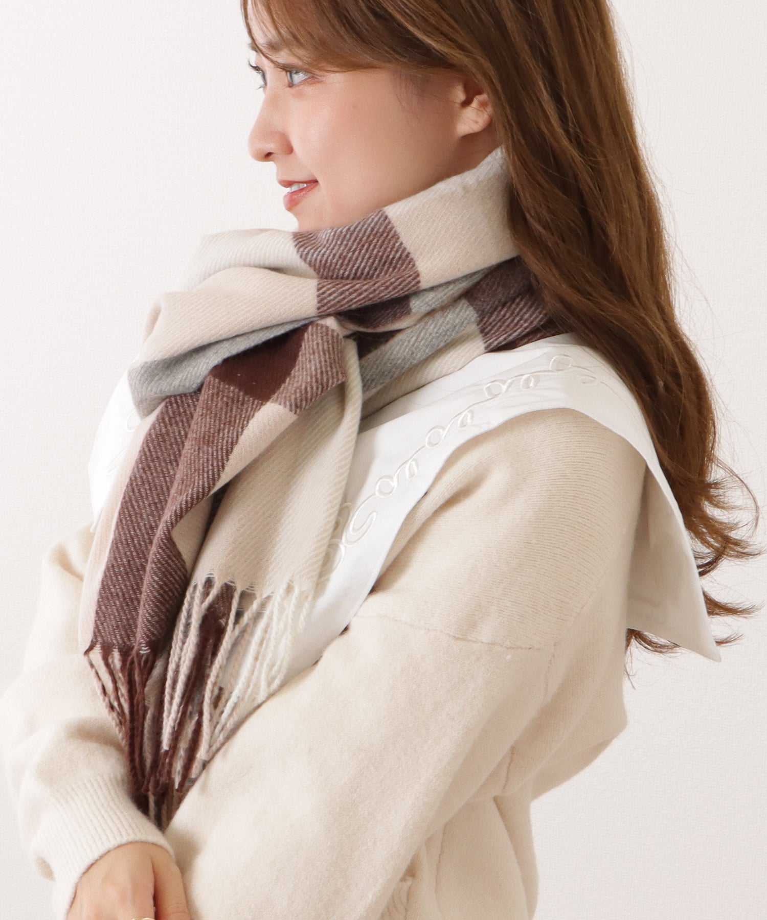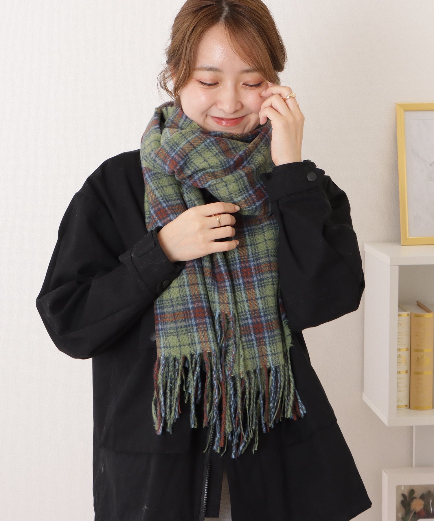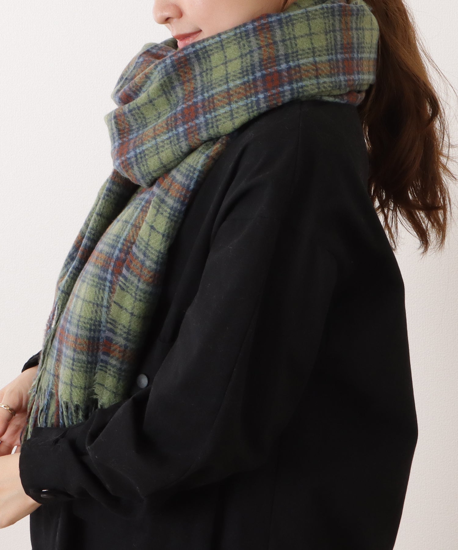 コーディネートに馴染む、やわらかな配色のチェック柄マフラー。