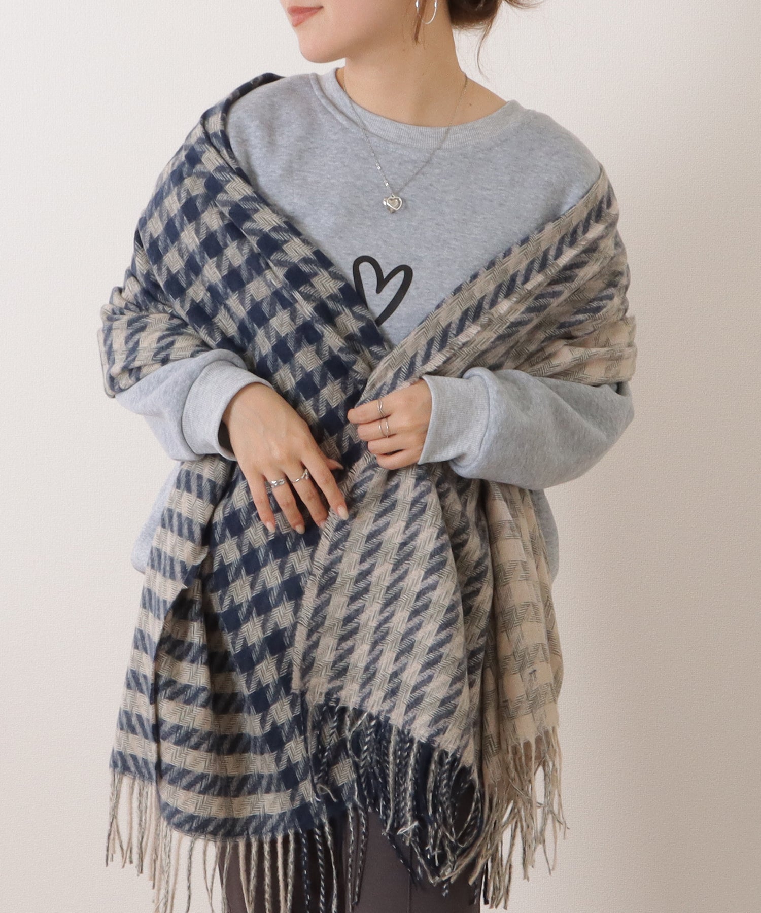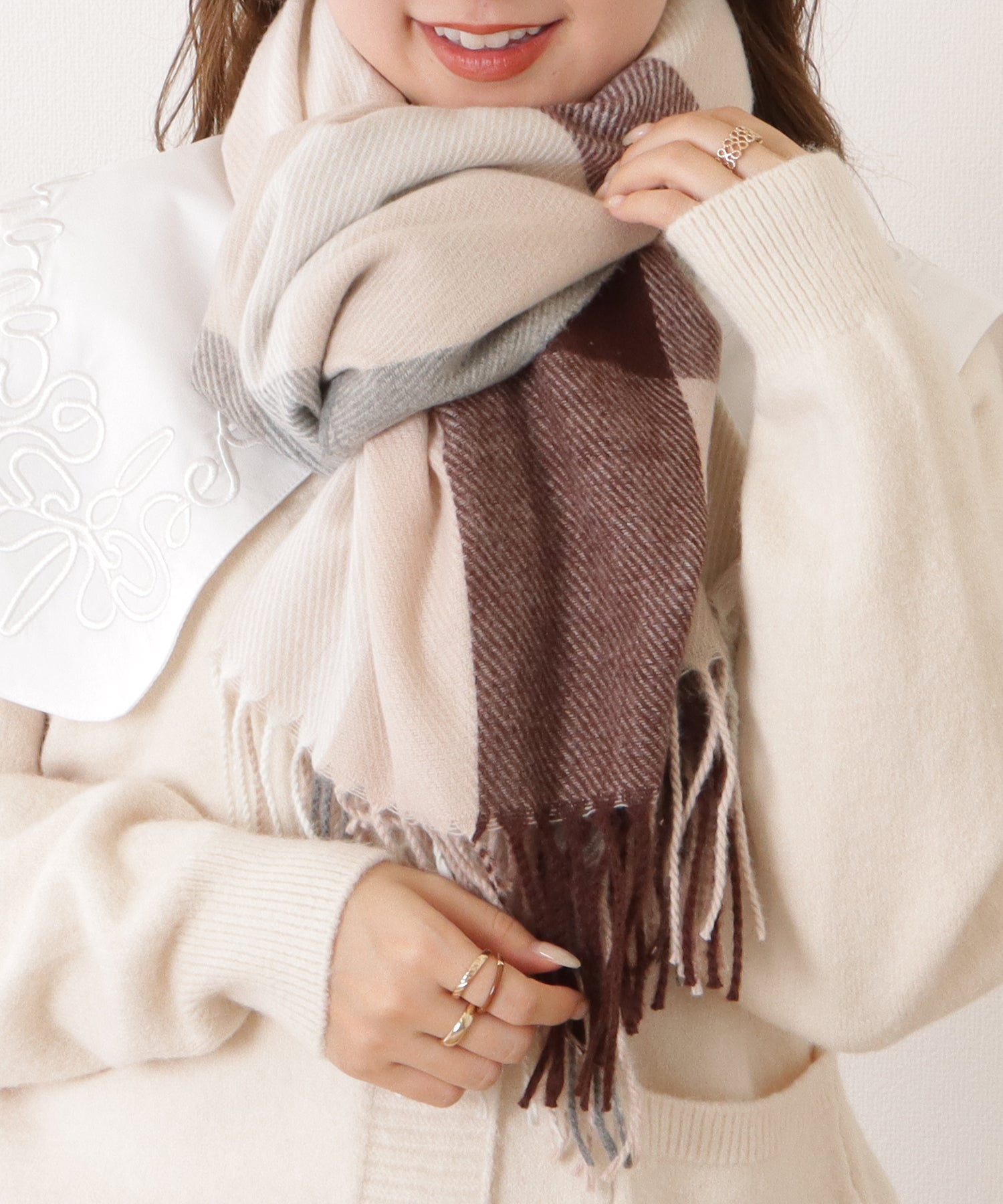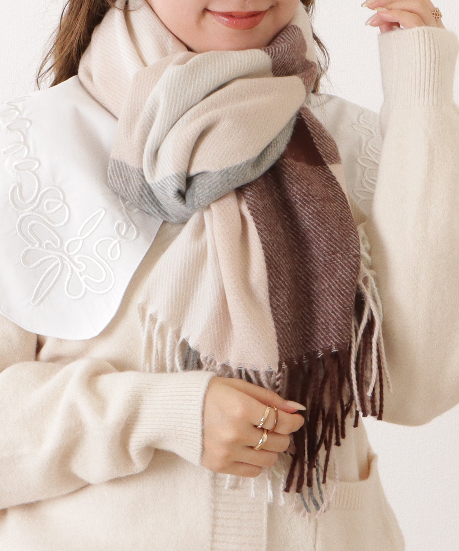 巻き方次第で表情が変わる、フリンジ仕上げの端もポイント。