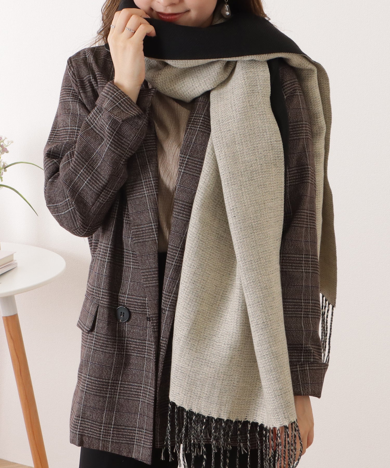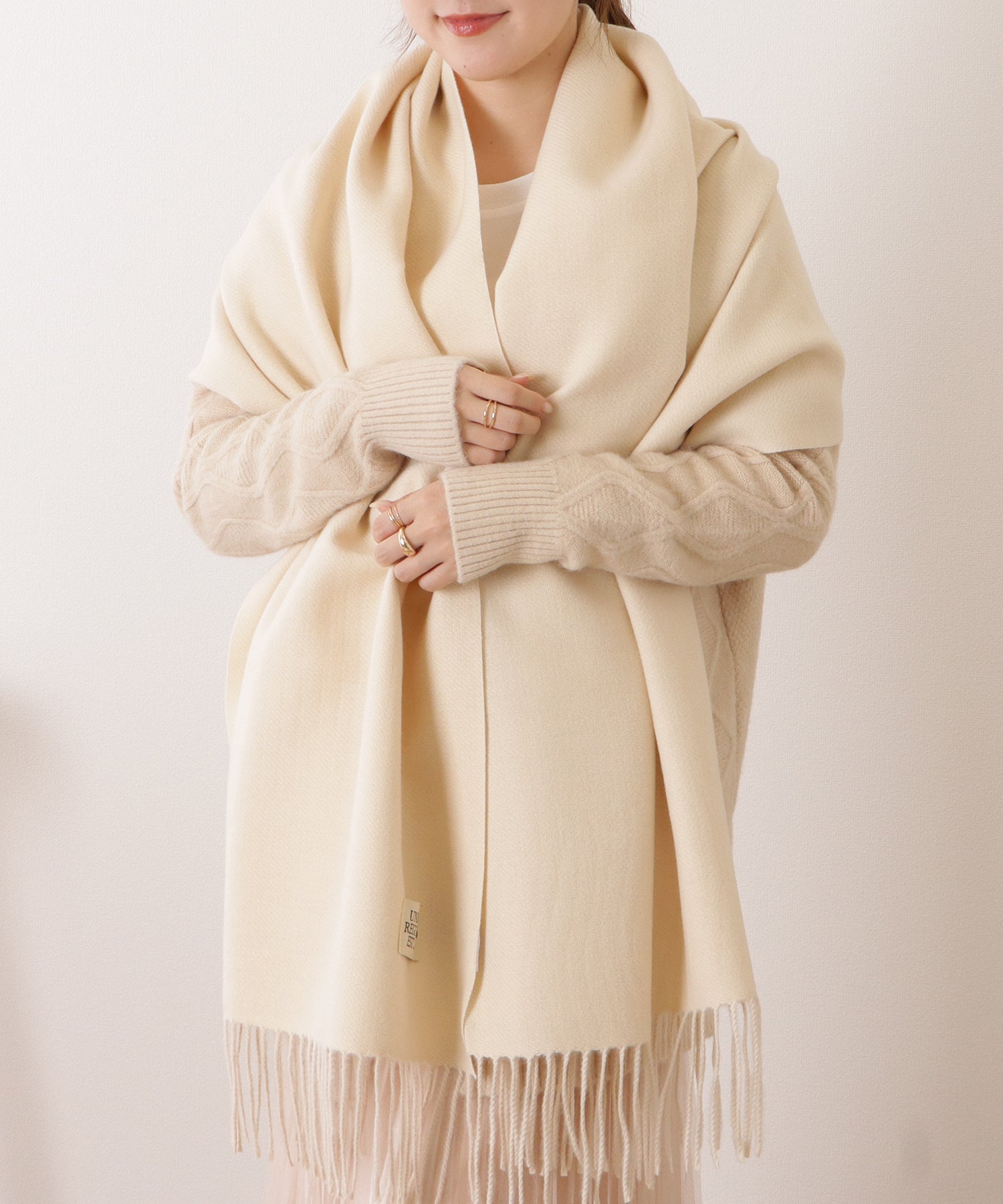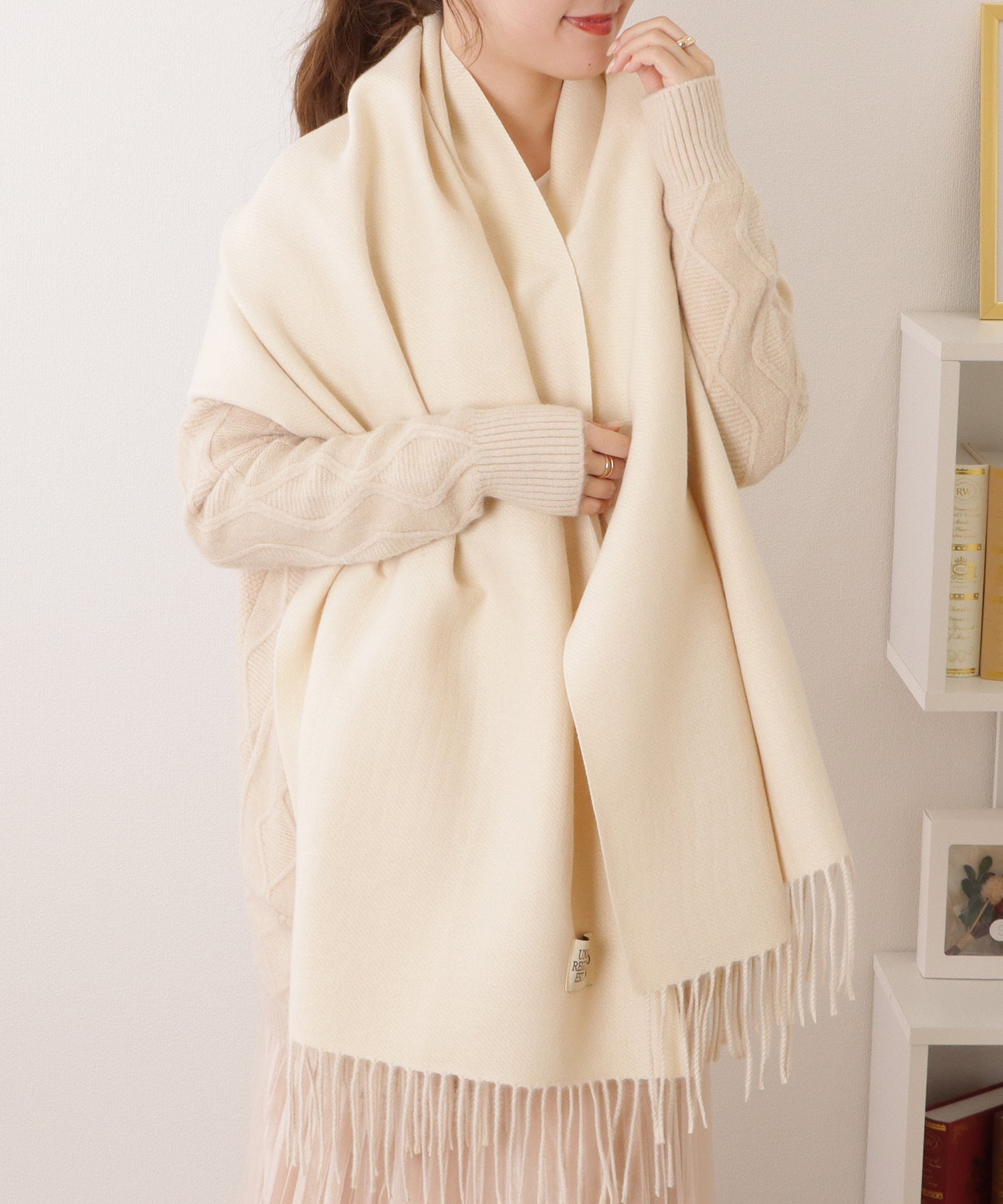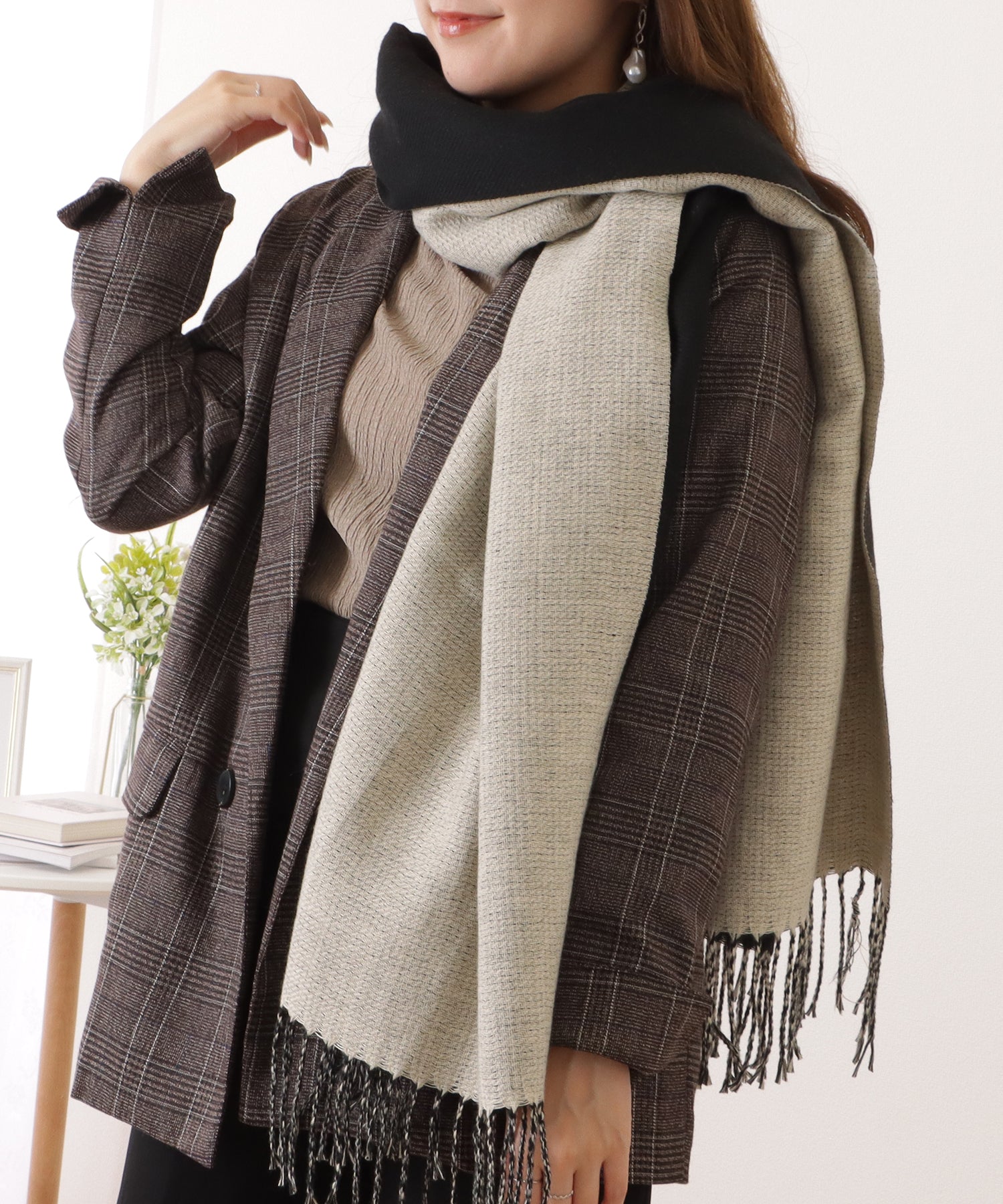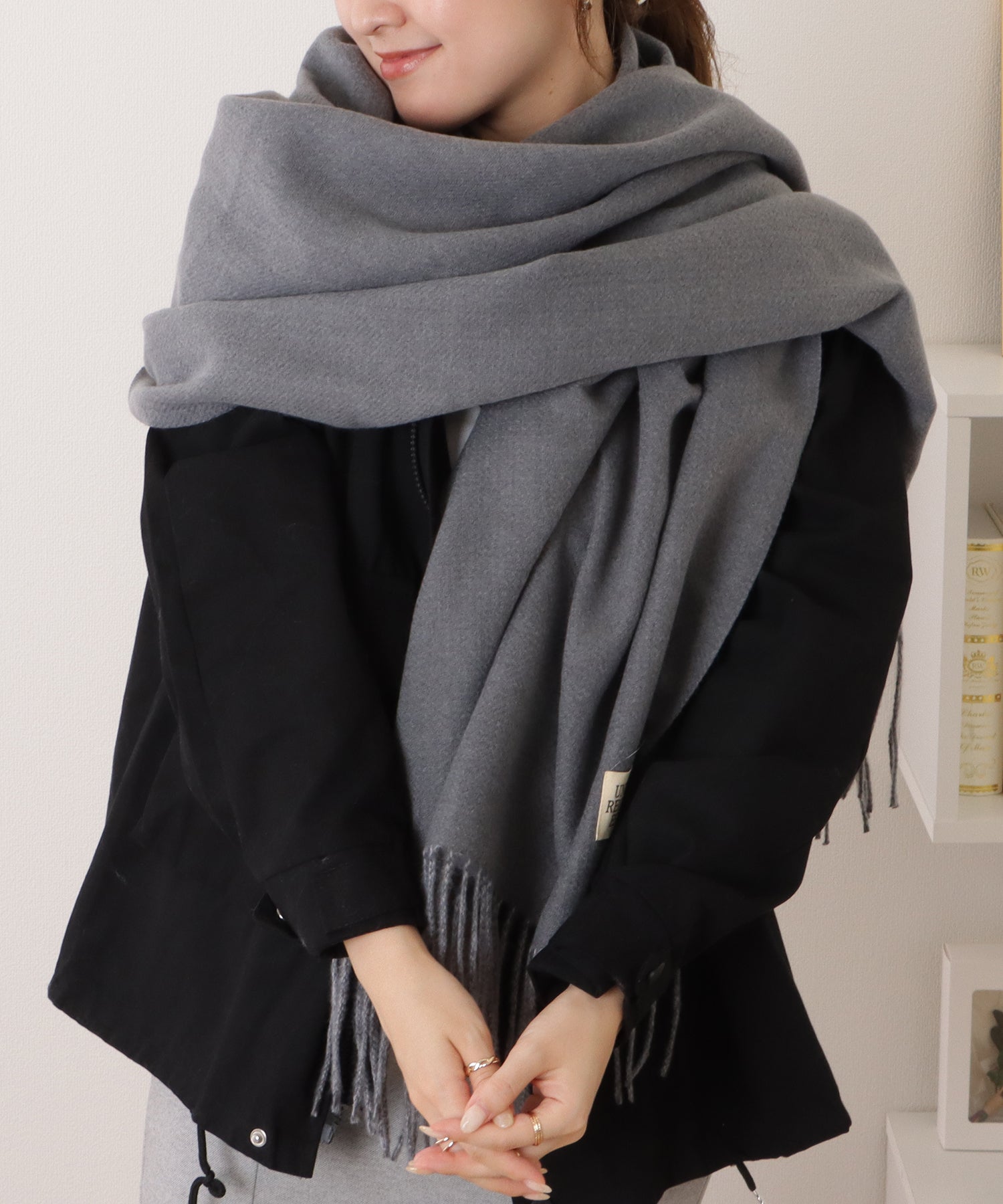 秋冬コーデの定番アイテムとして、羽織りやブランケットとしてもお使いいただける大判タイプ。