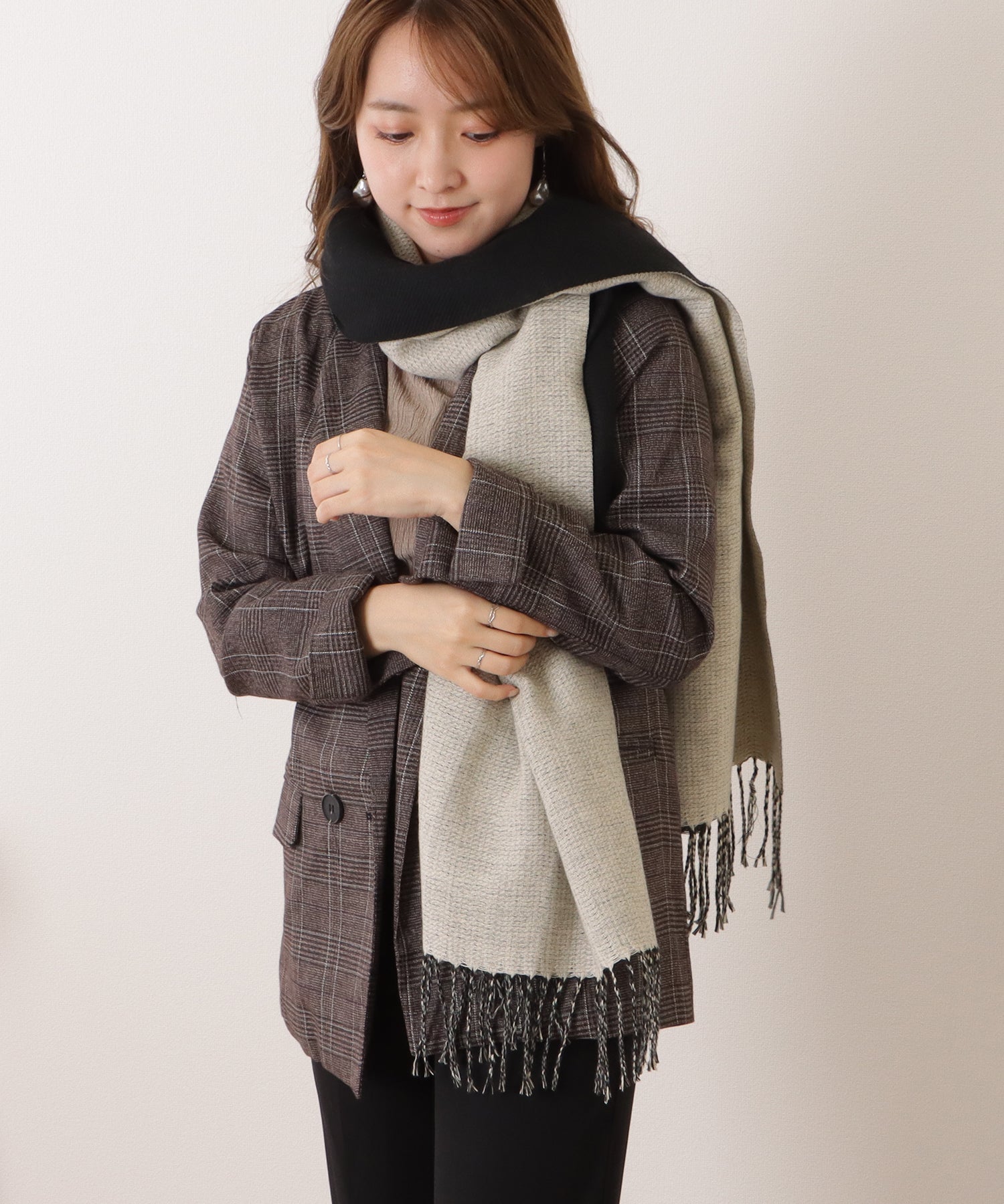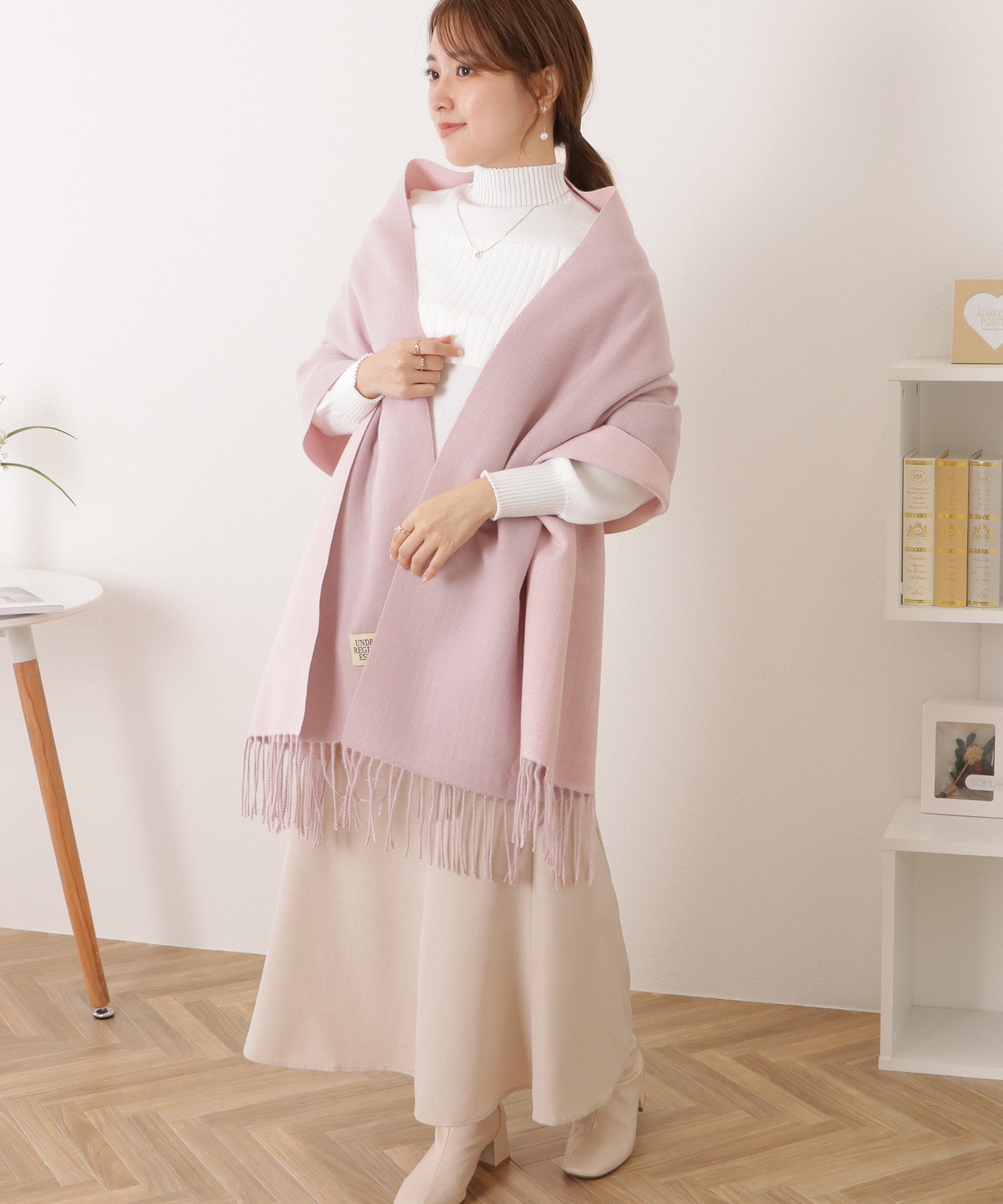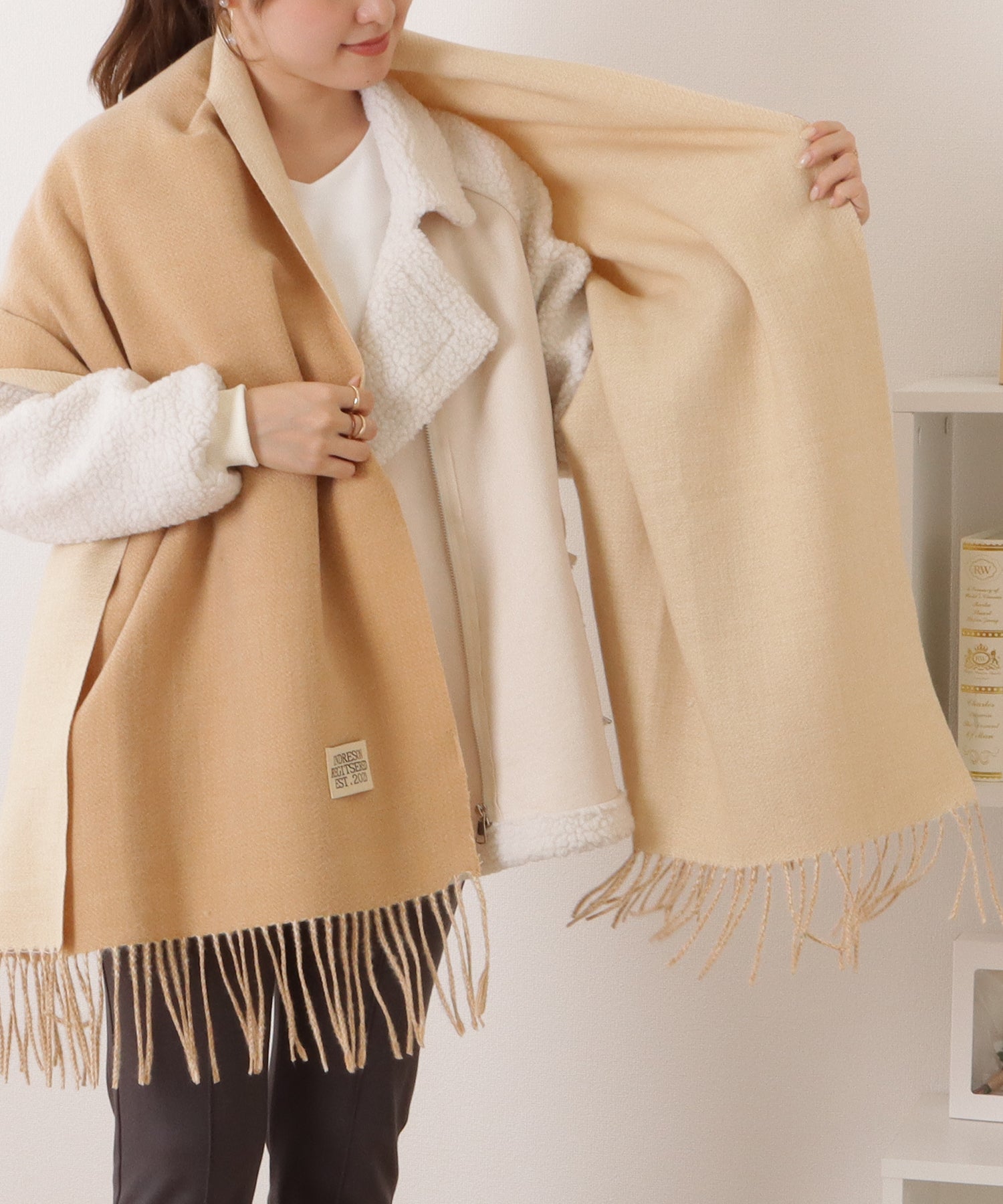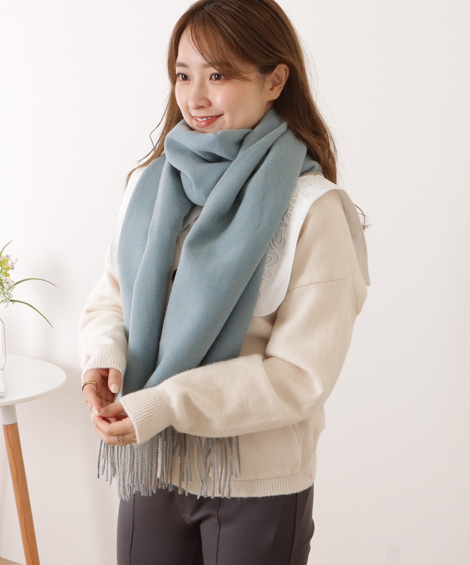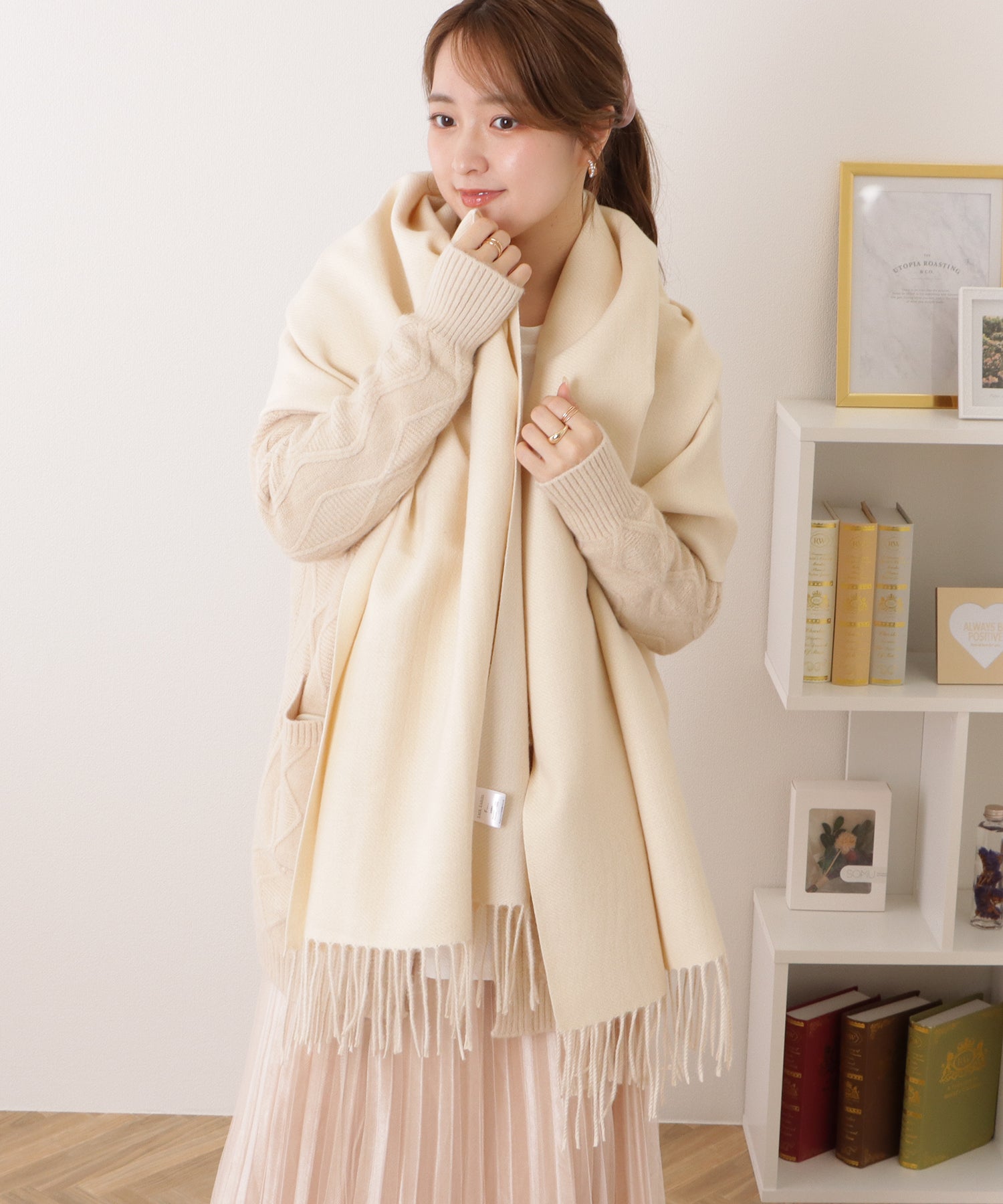 秋冬コーデの定番アイテムとして、羽織りやブランケットとしてもお使いいただける大判タイプ。