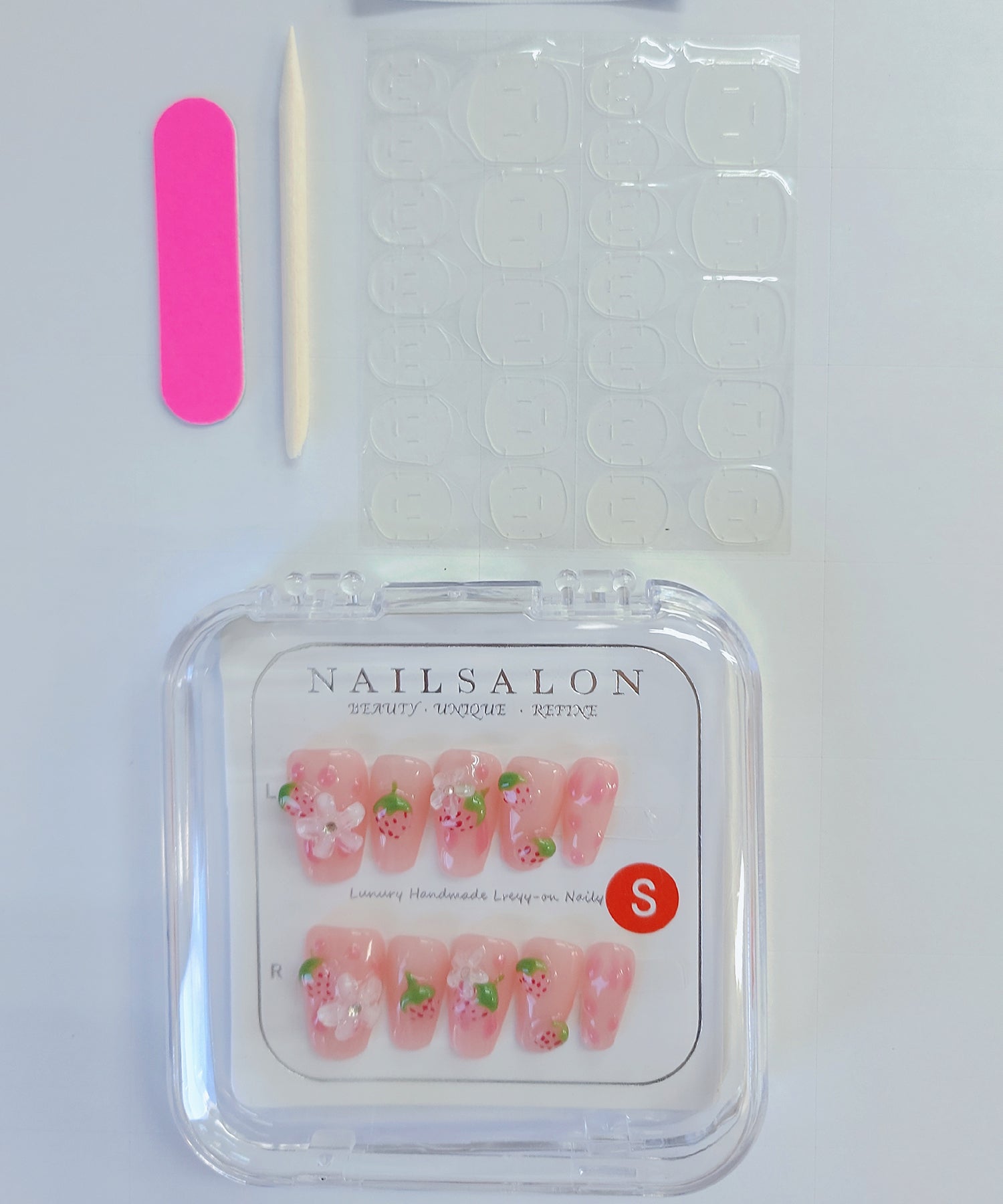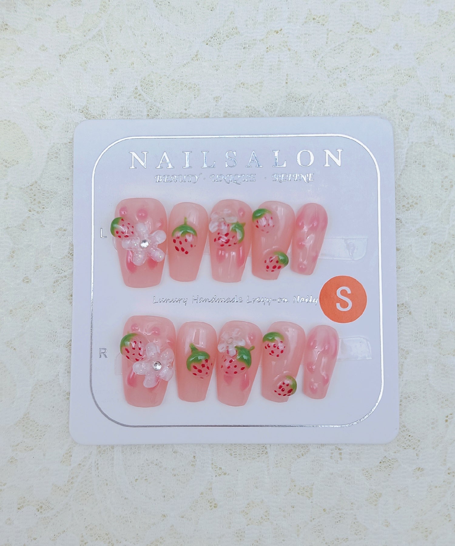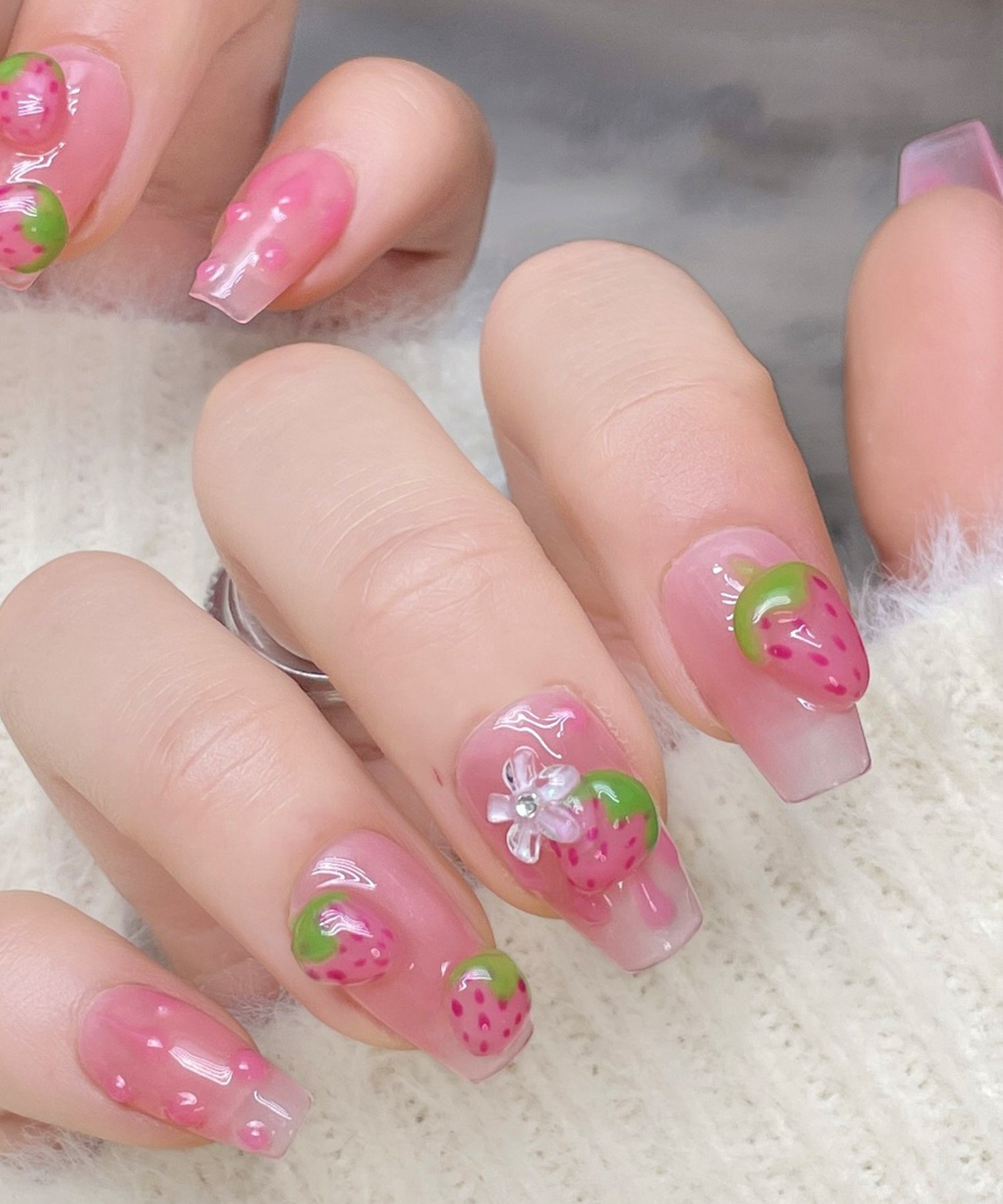 血色感のある手元に仕上げてくれるナチュラルなピンクカラーをベースに、お花やいちごのモチーフをたっぷりとあしらったガーリーなデザイン。