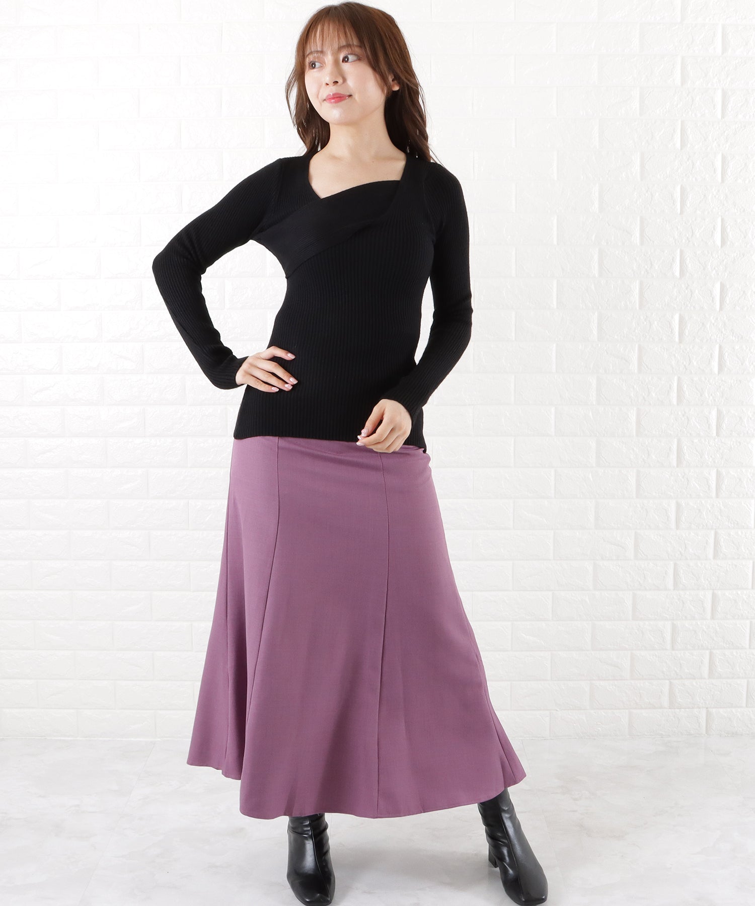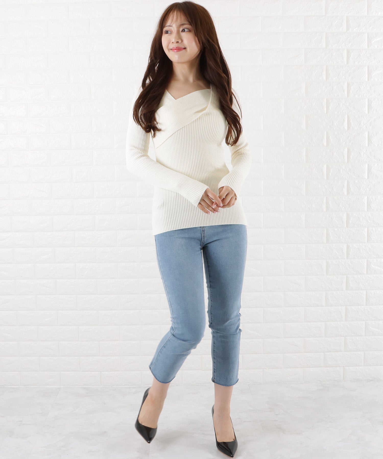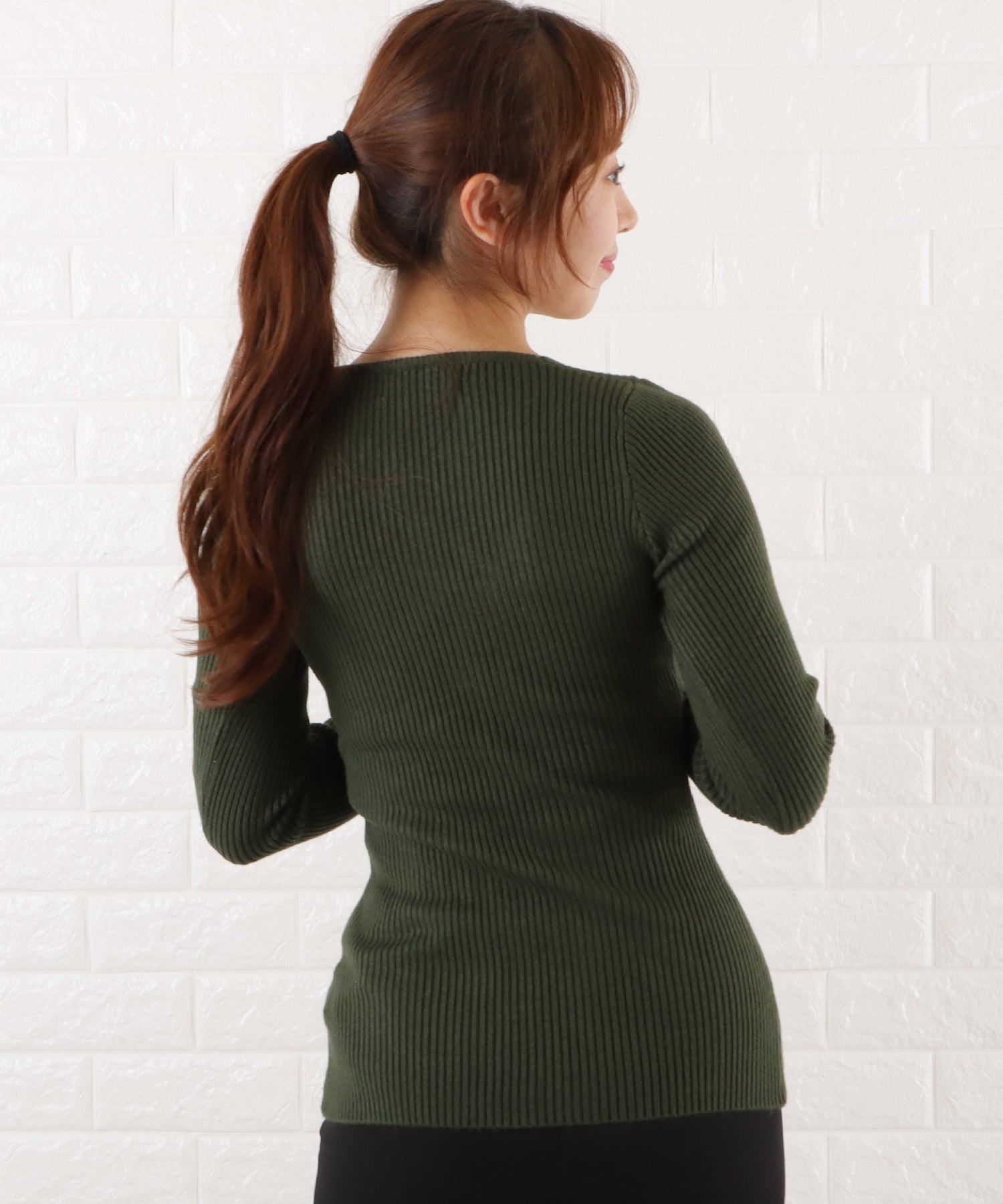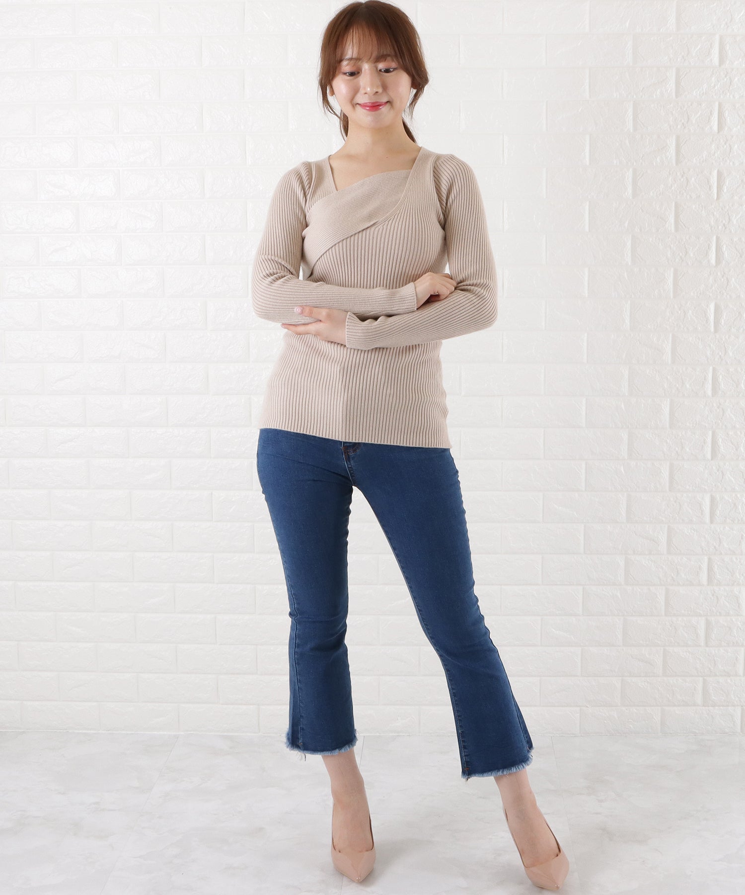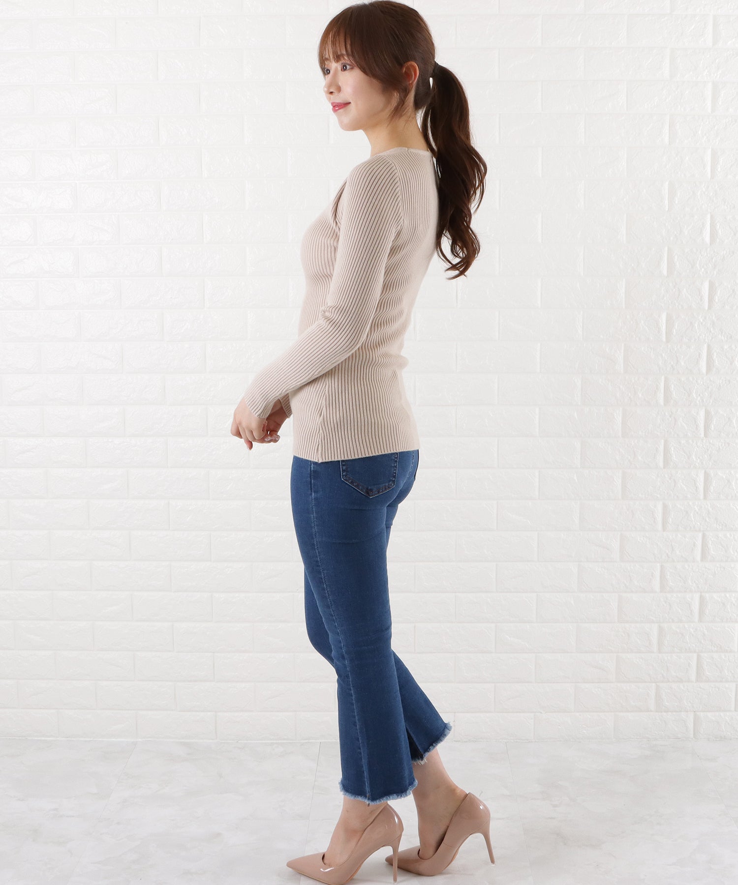 広めに開いたネックラインがデコルテを綺麗に魅せ、小顔効果も抜群です。