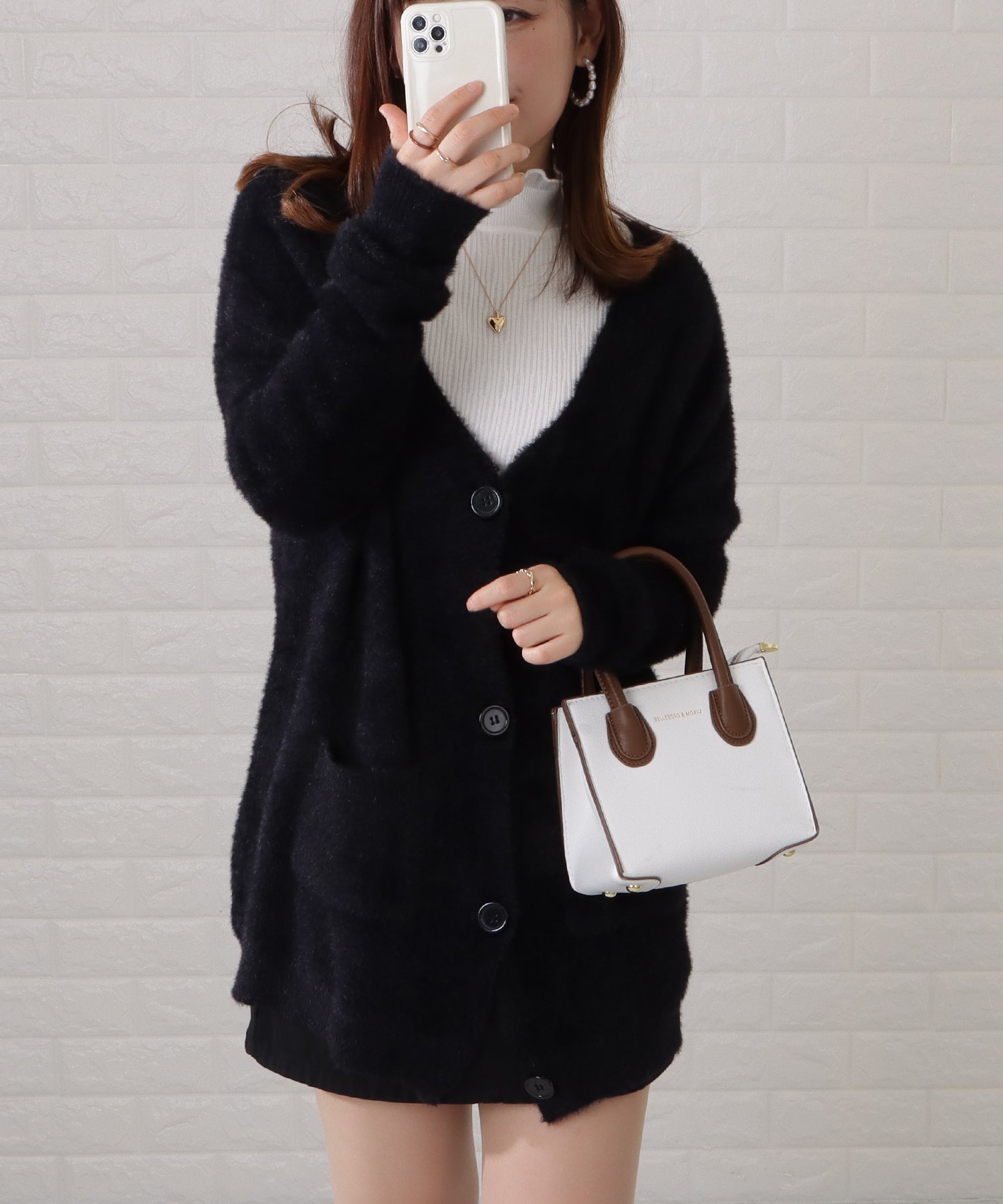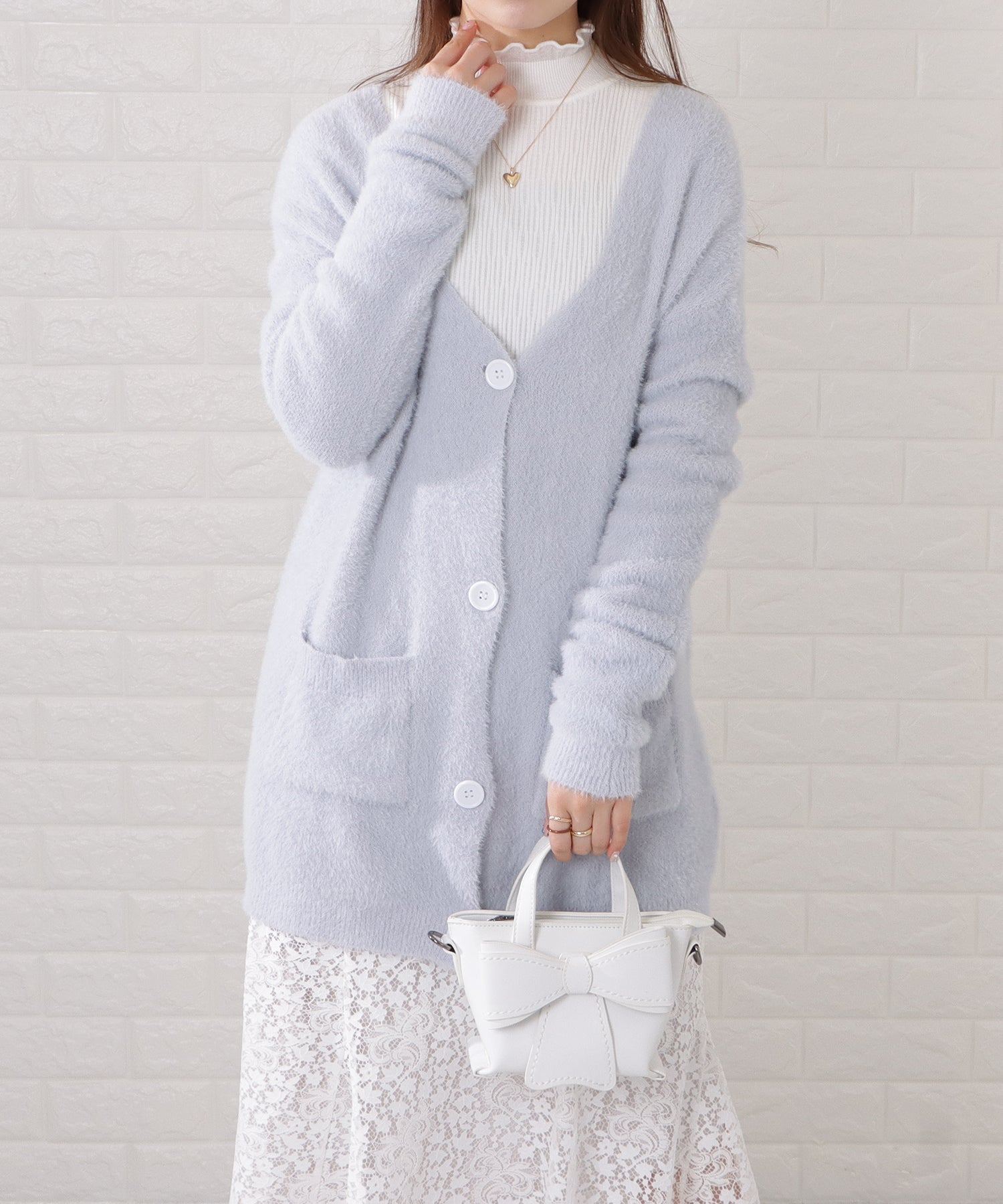 ふわふわとしたシャギーニットがフェミニンムードを高めるカーディガン