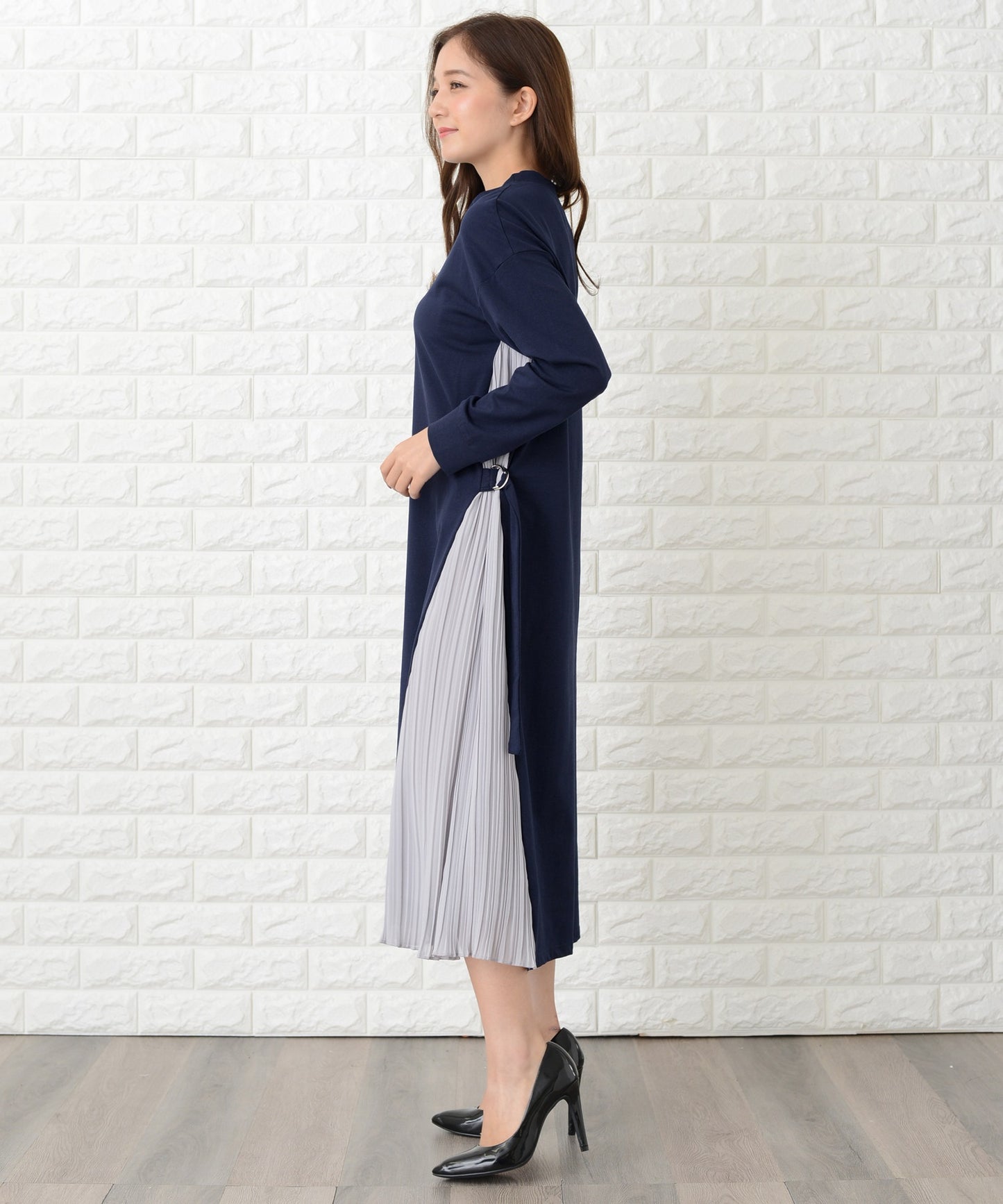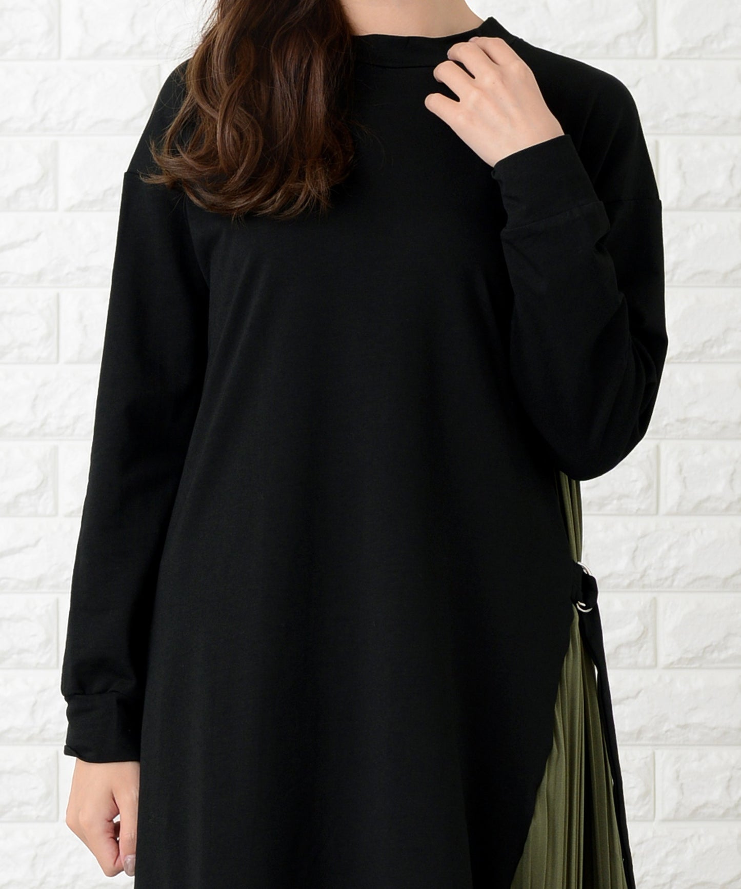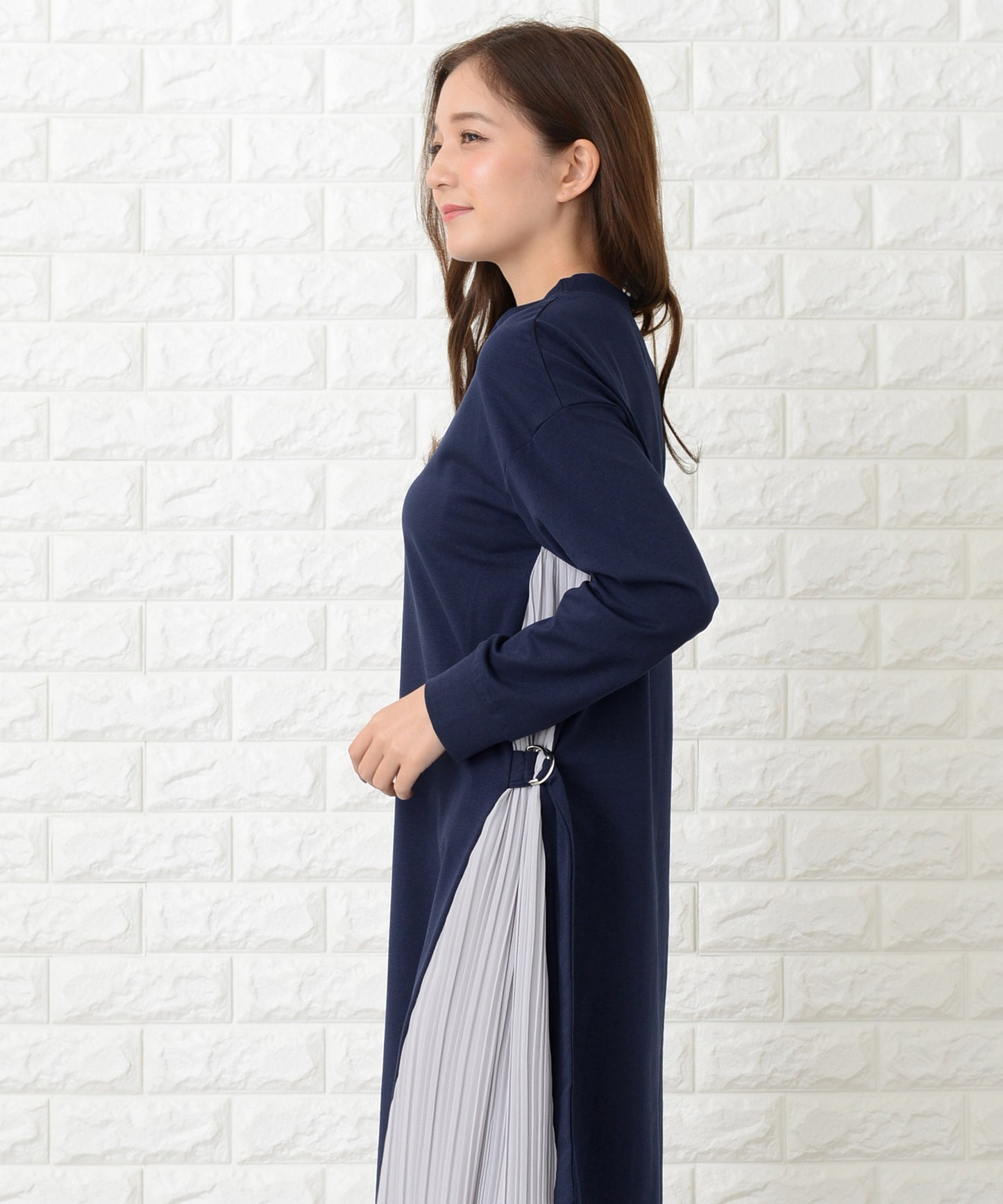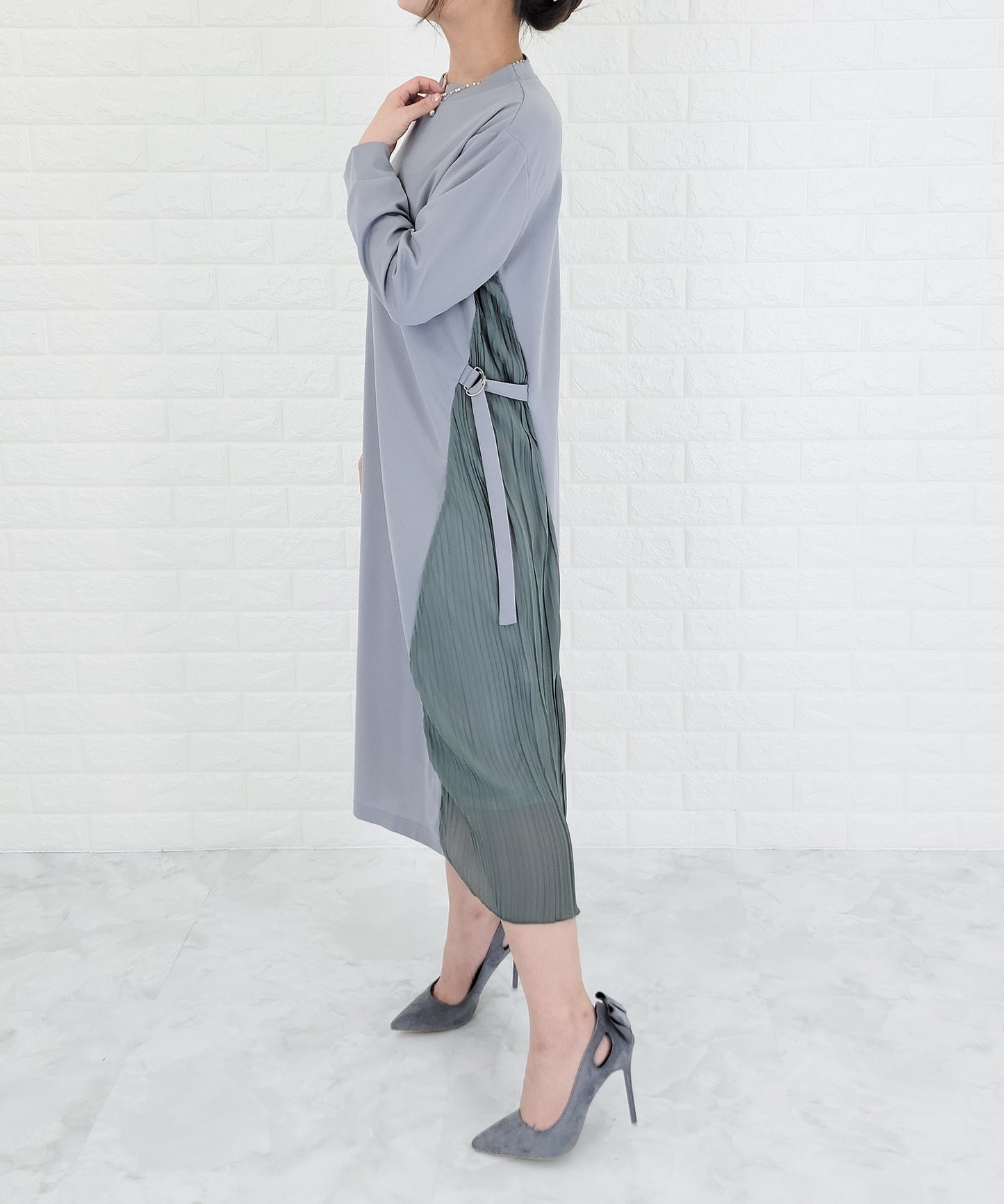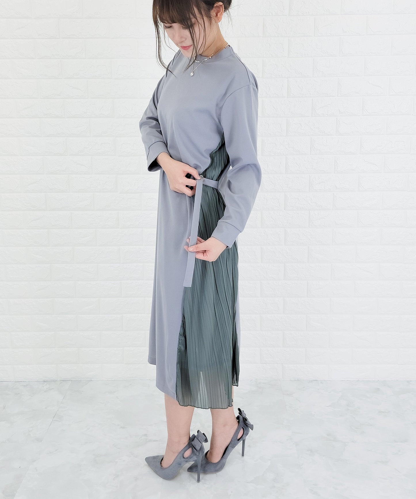 サイドで揺れるプリーツラインが優美な印象を作る