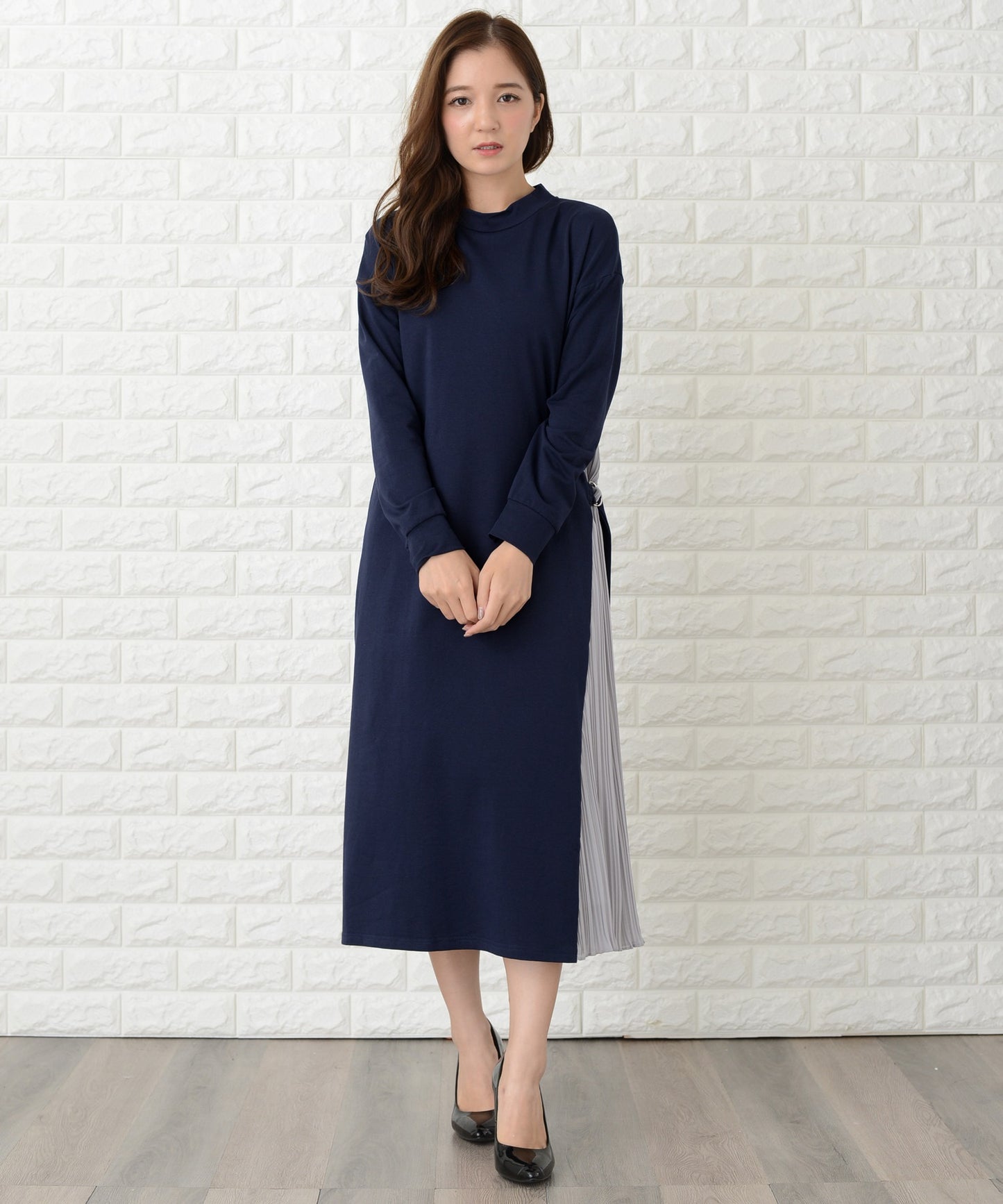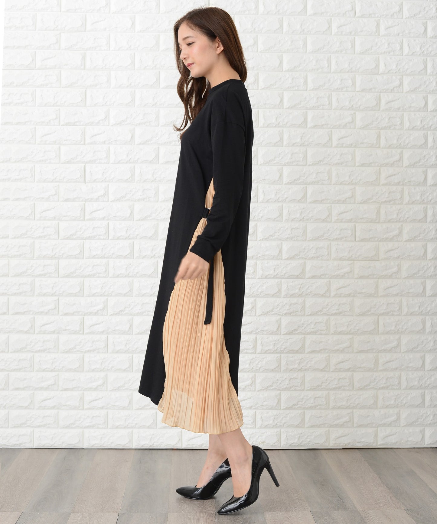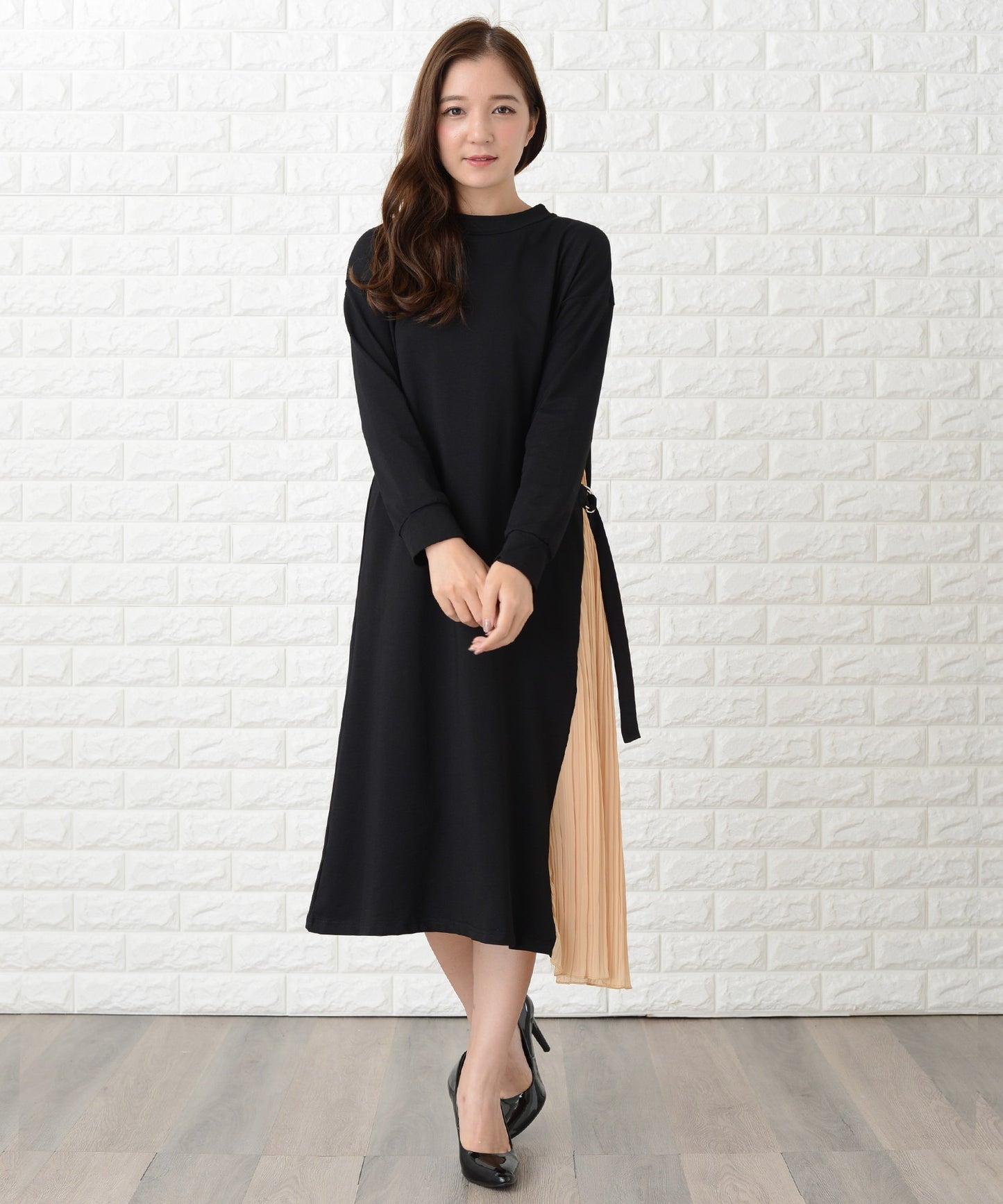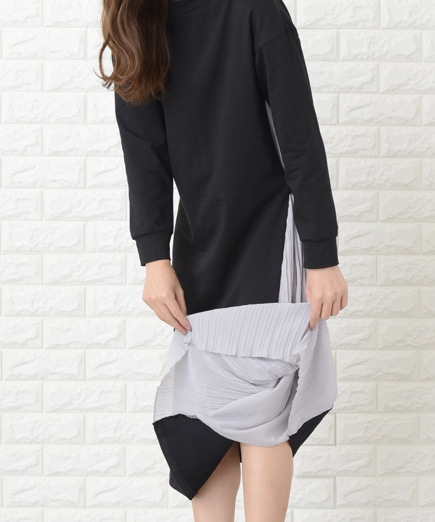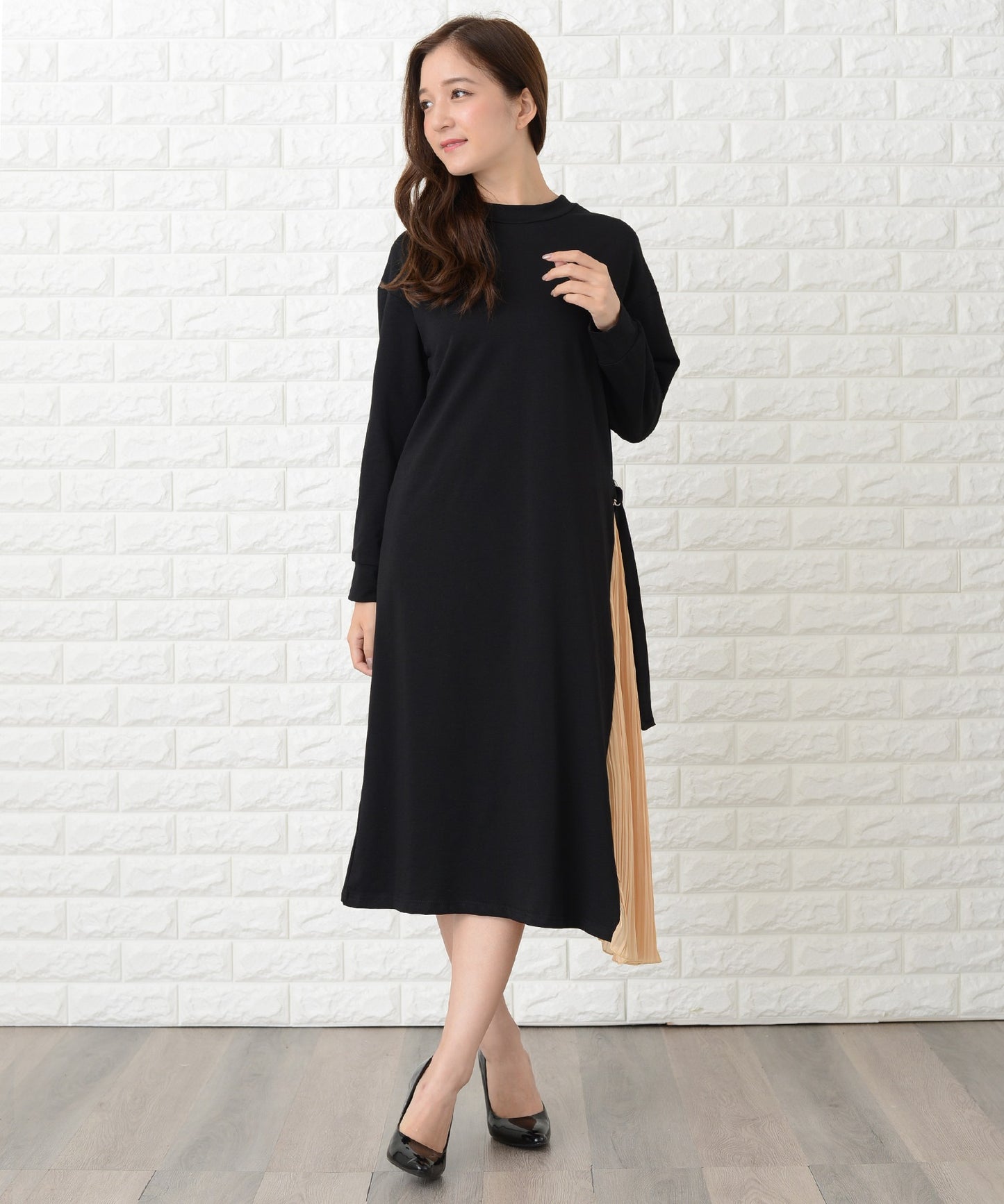 サイドで揺れるプリーツラインが優美な印象を作る