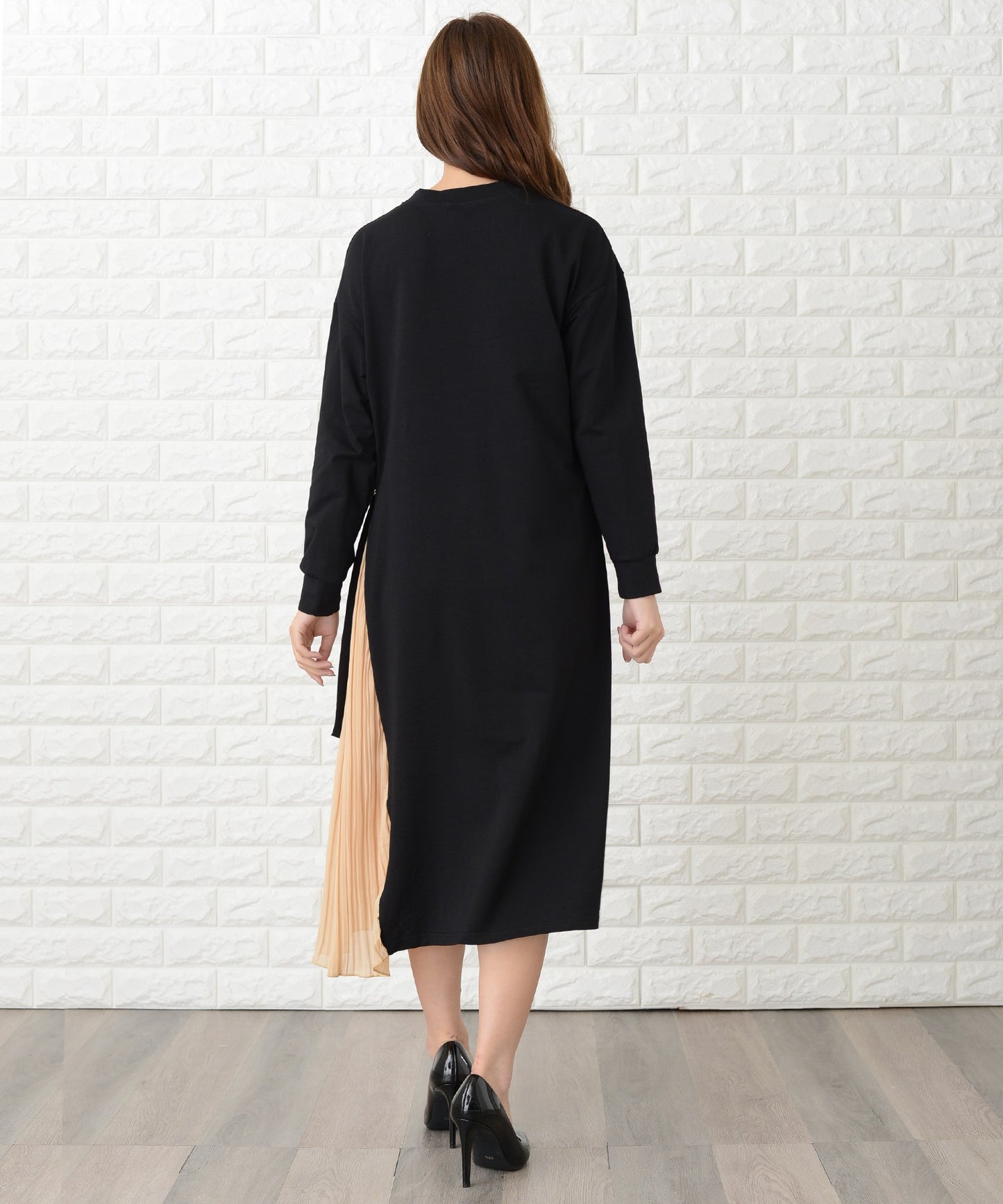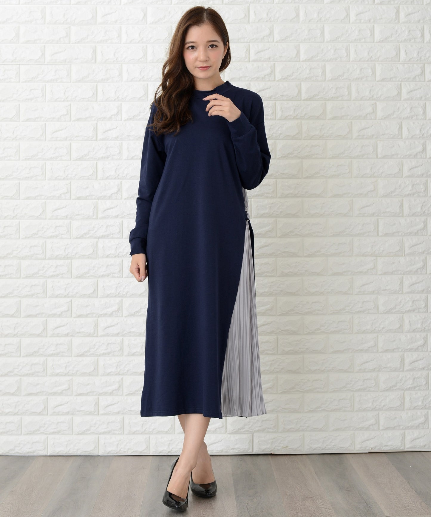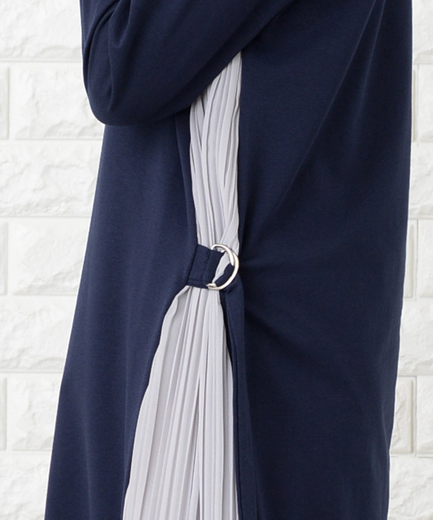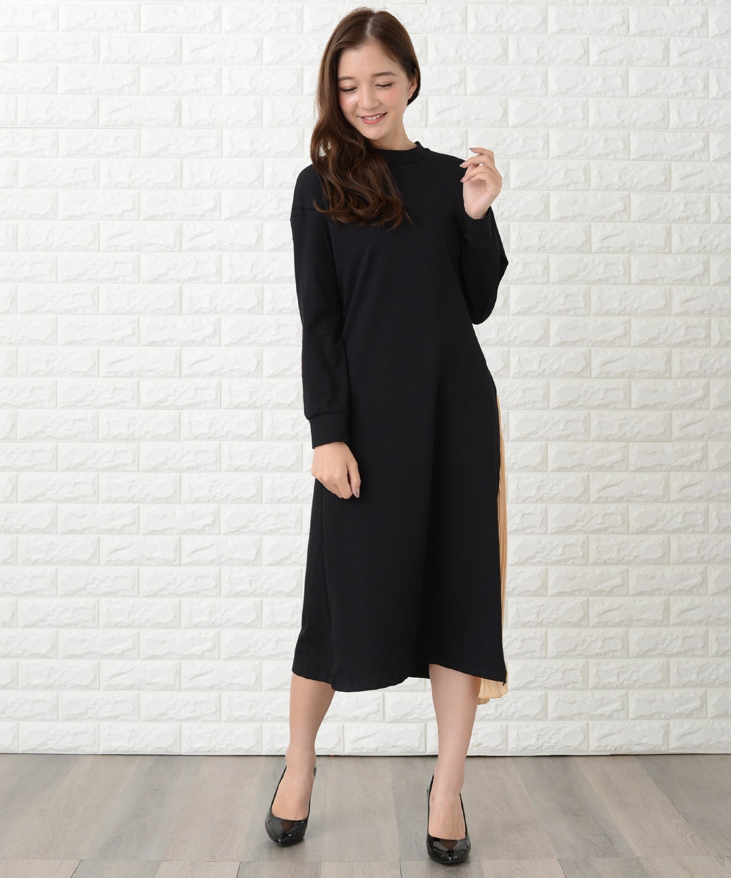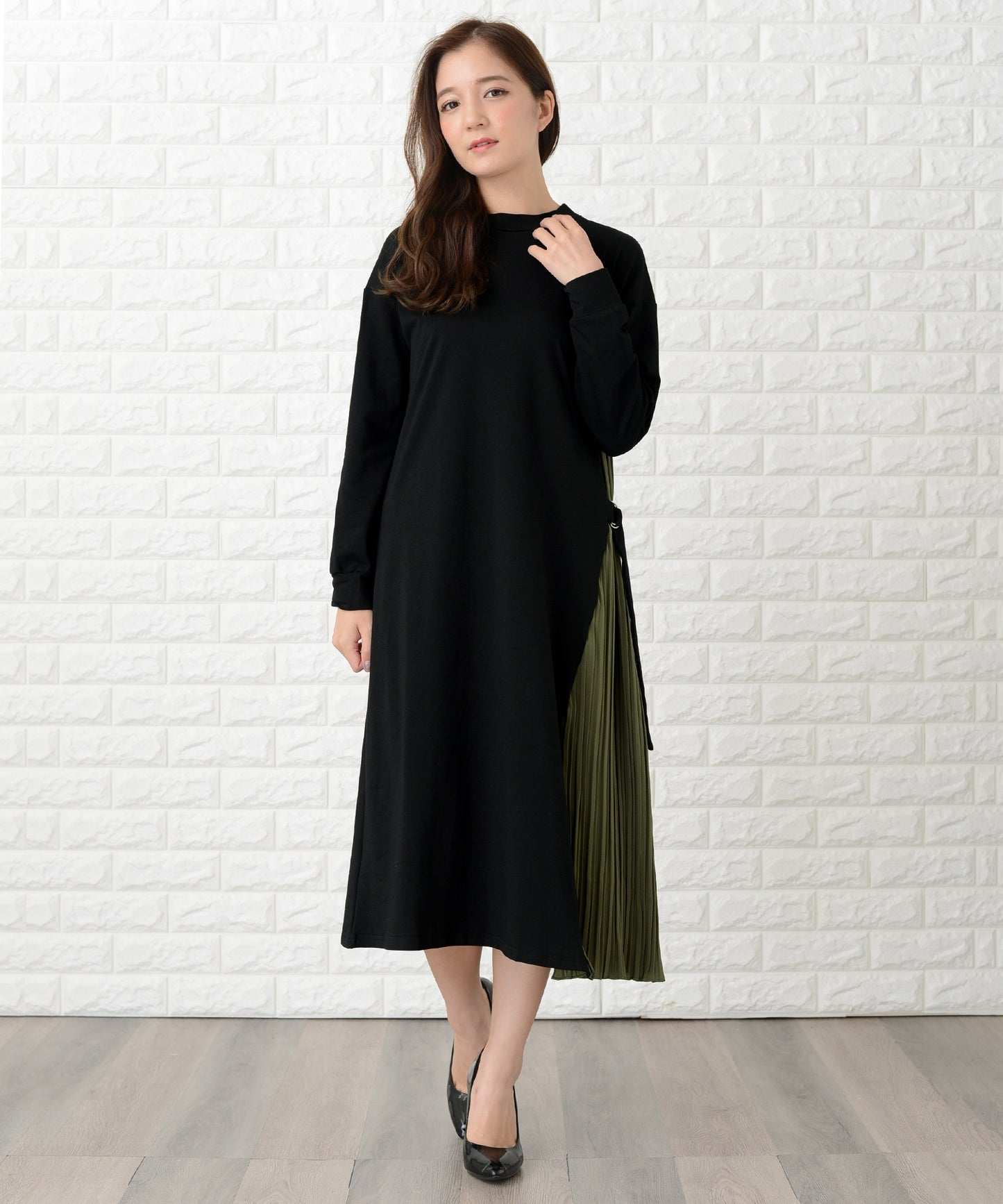 サイドで揺れるプリーツラインが優美な印象を作る
