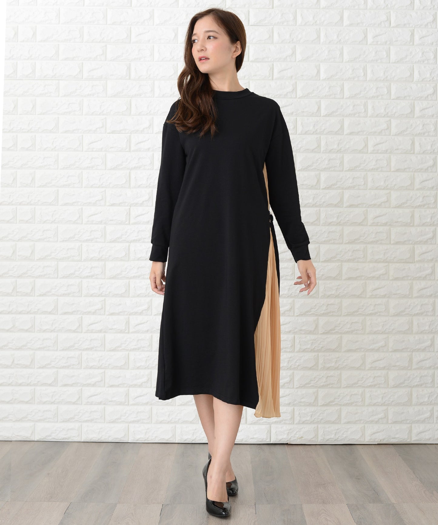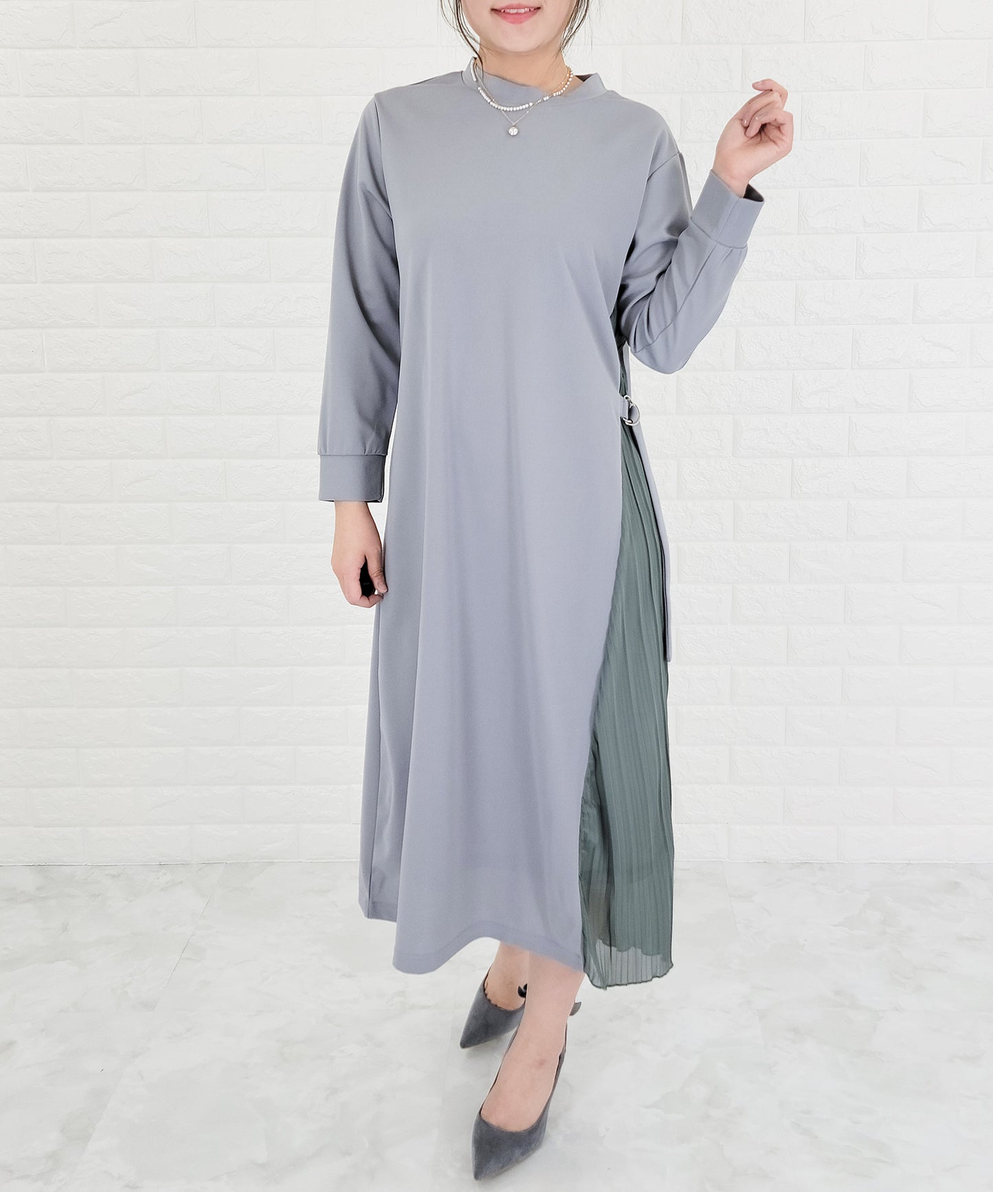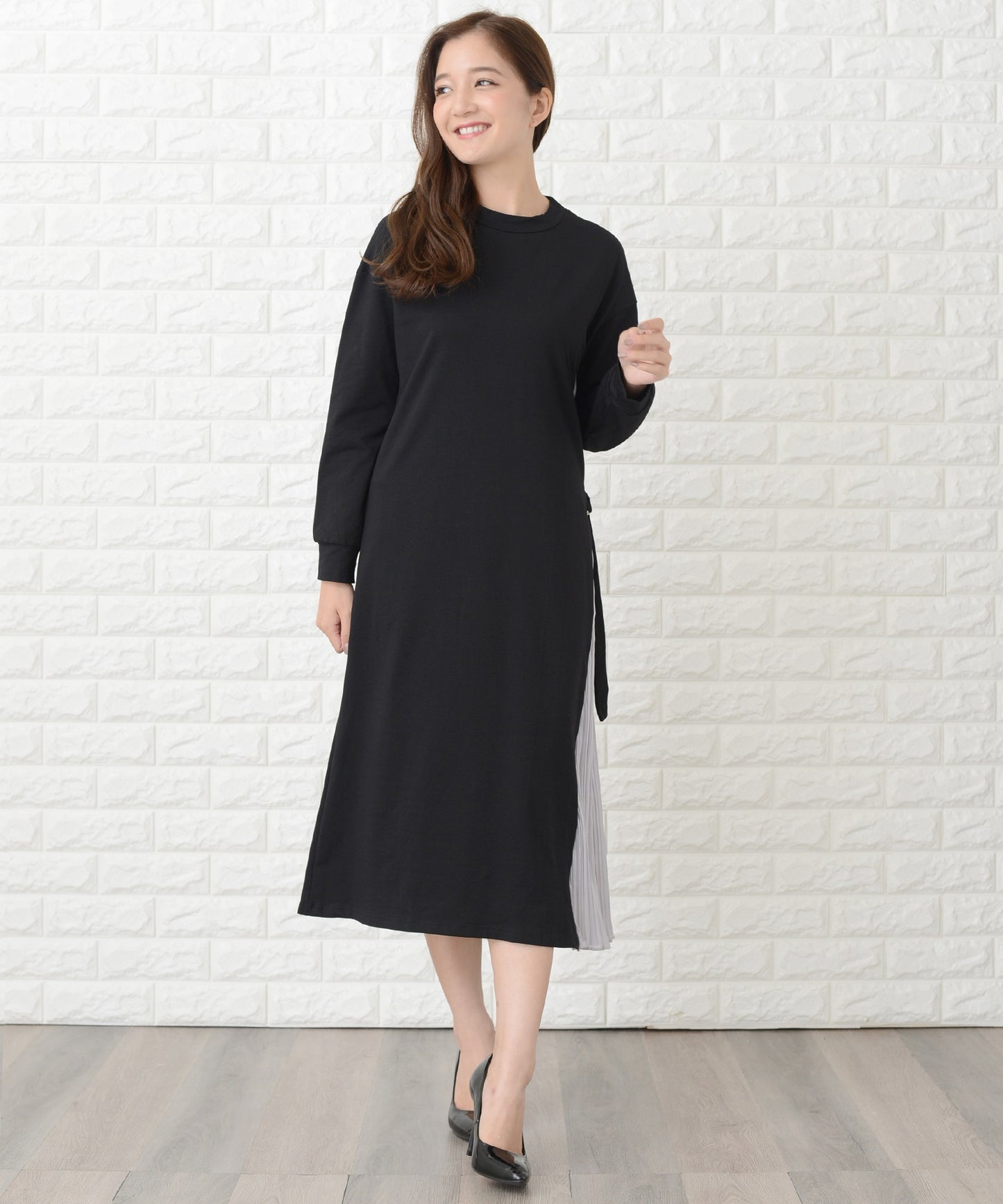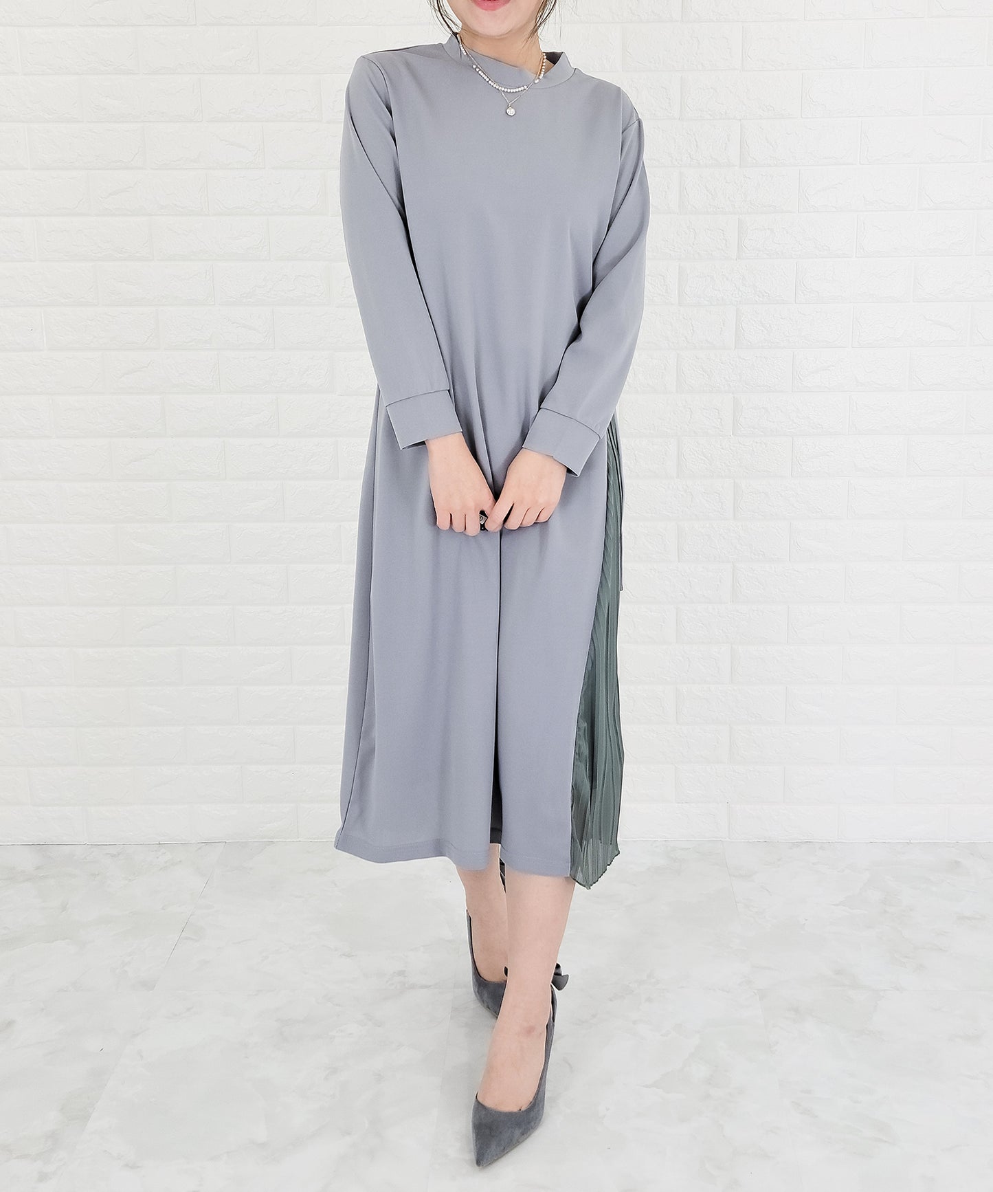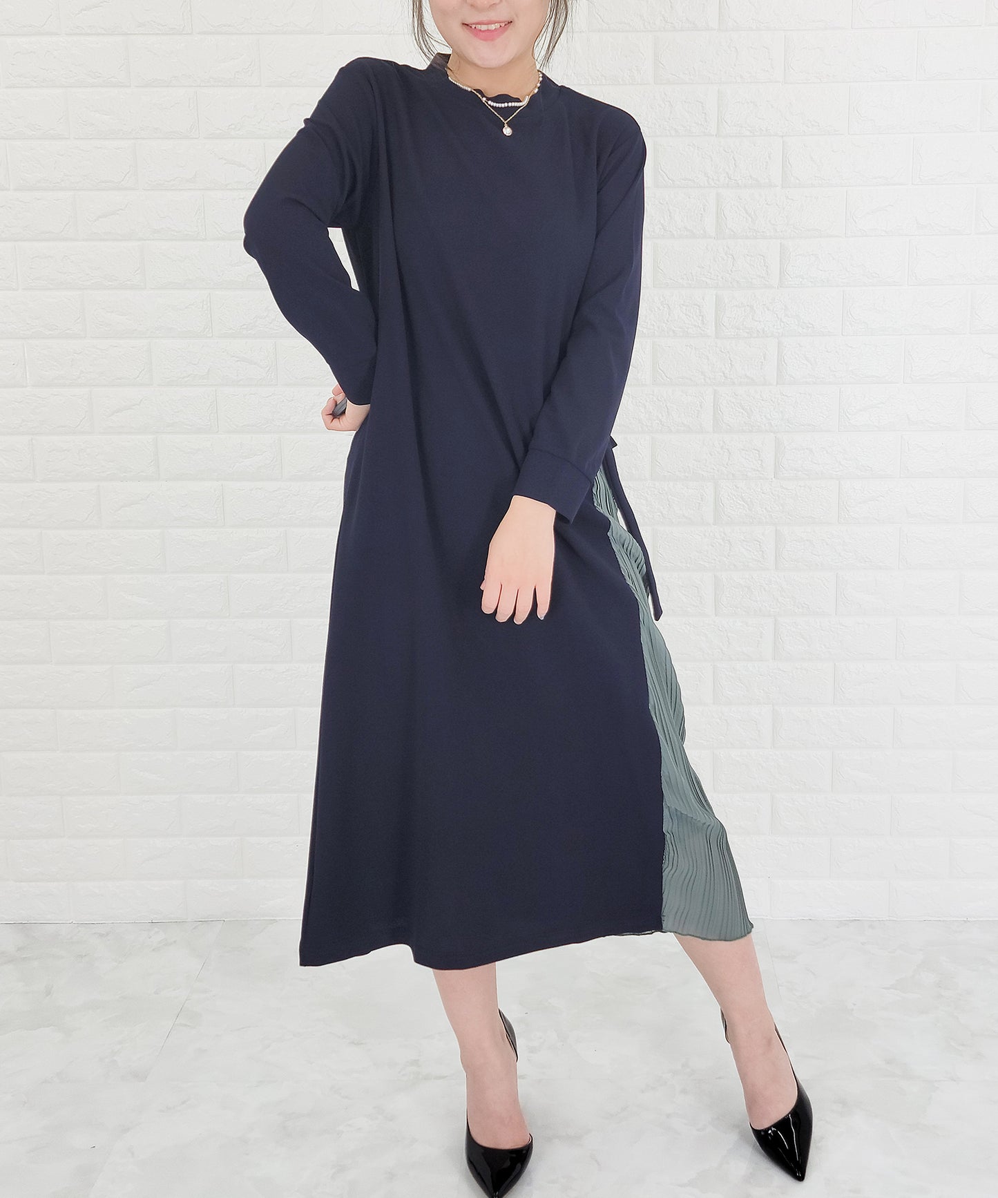 ラウンドネック サイドプリーツ切り替え Aラインワンピース