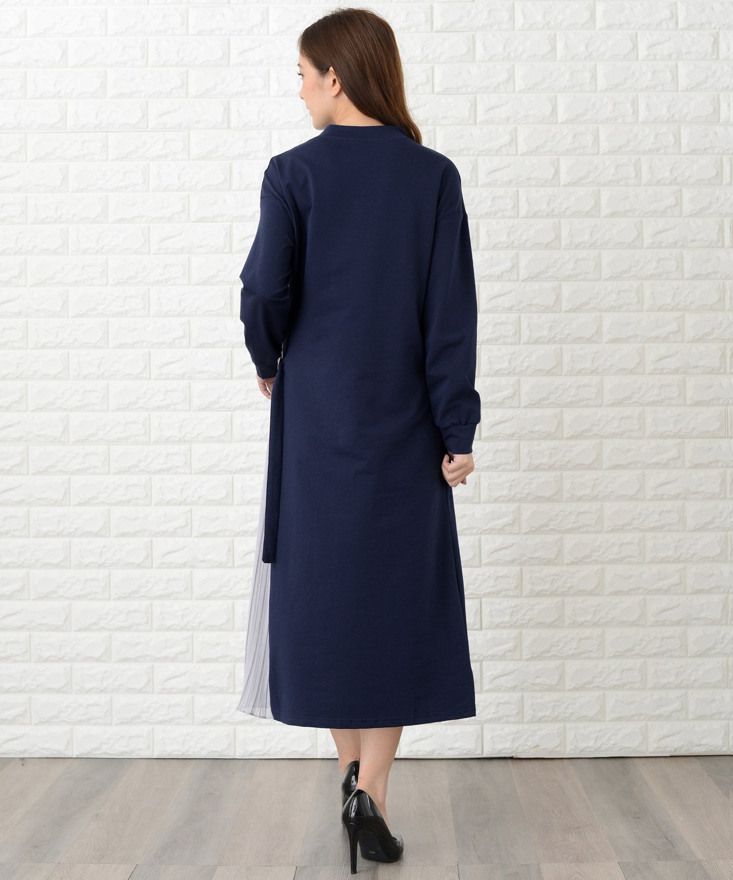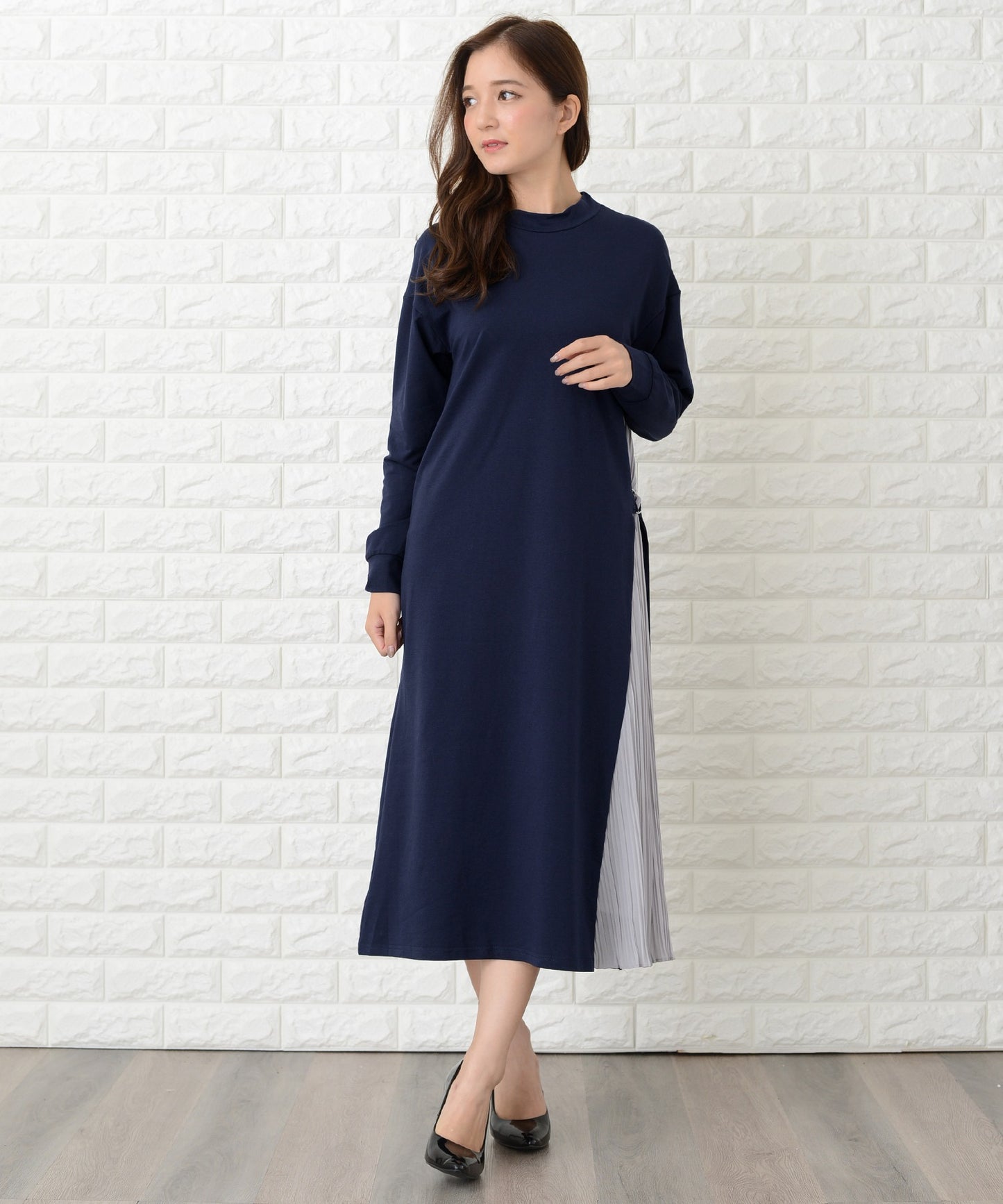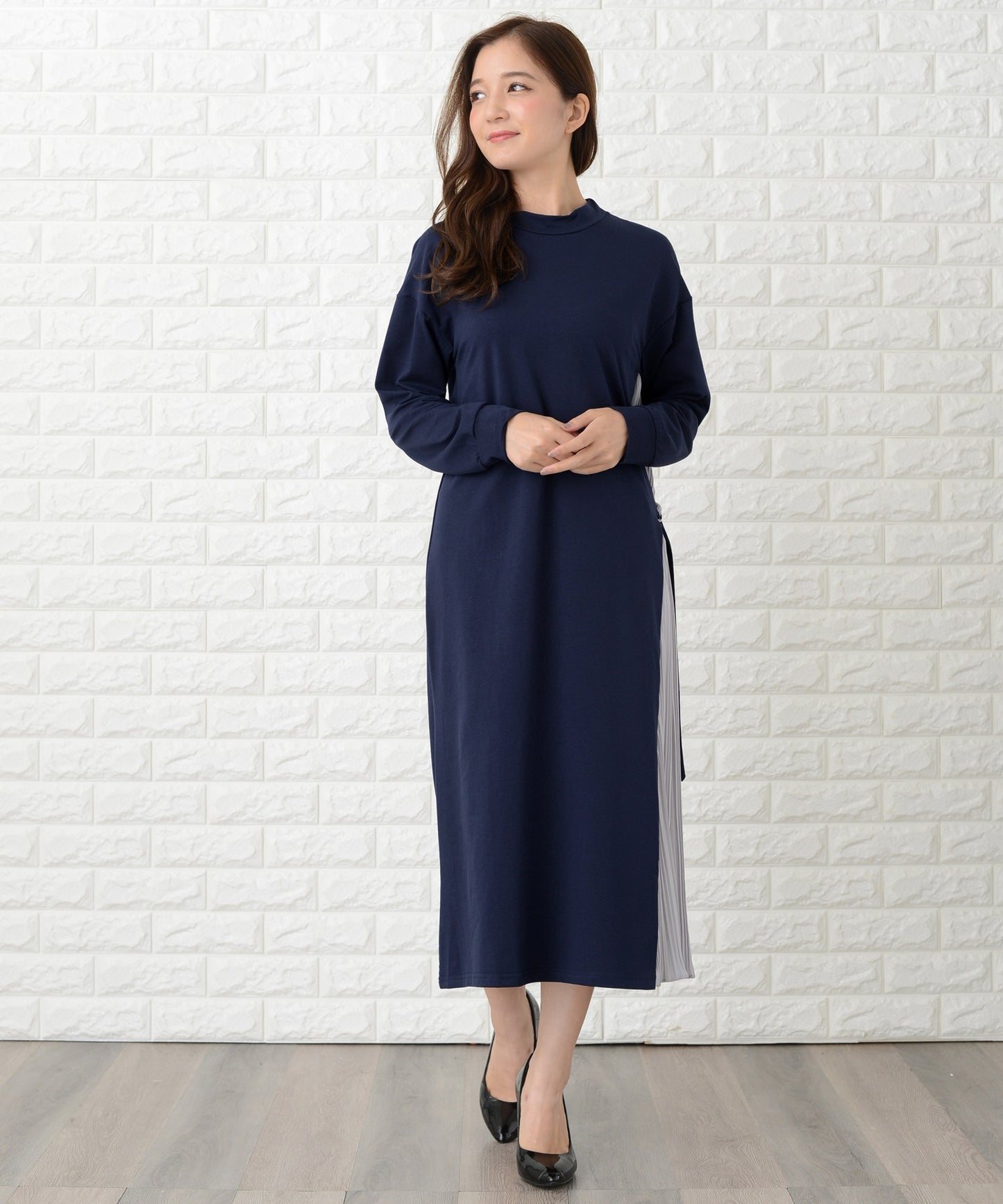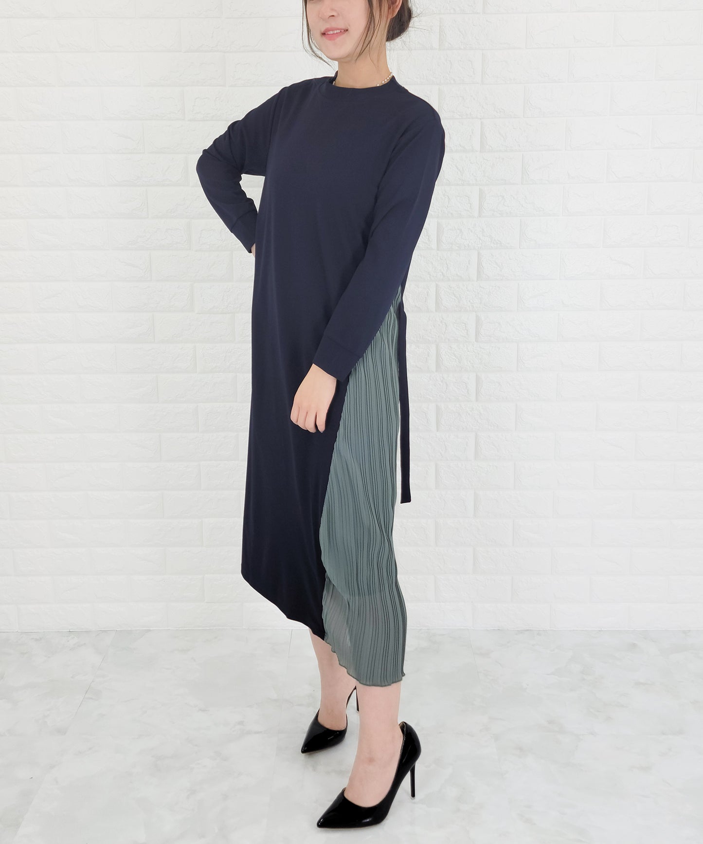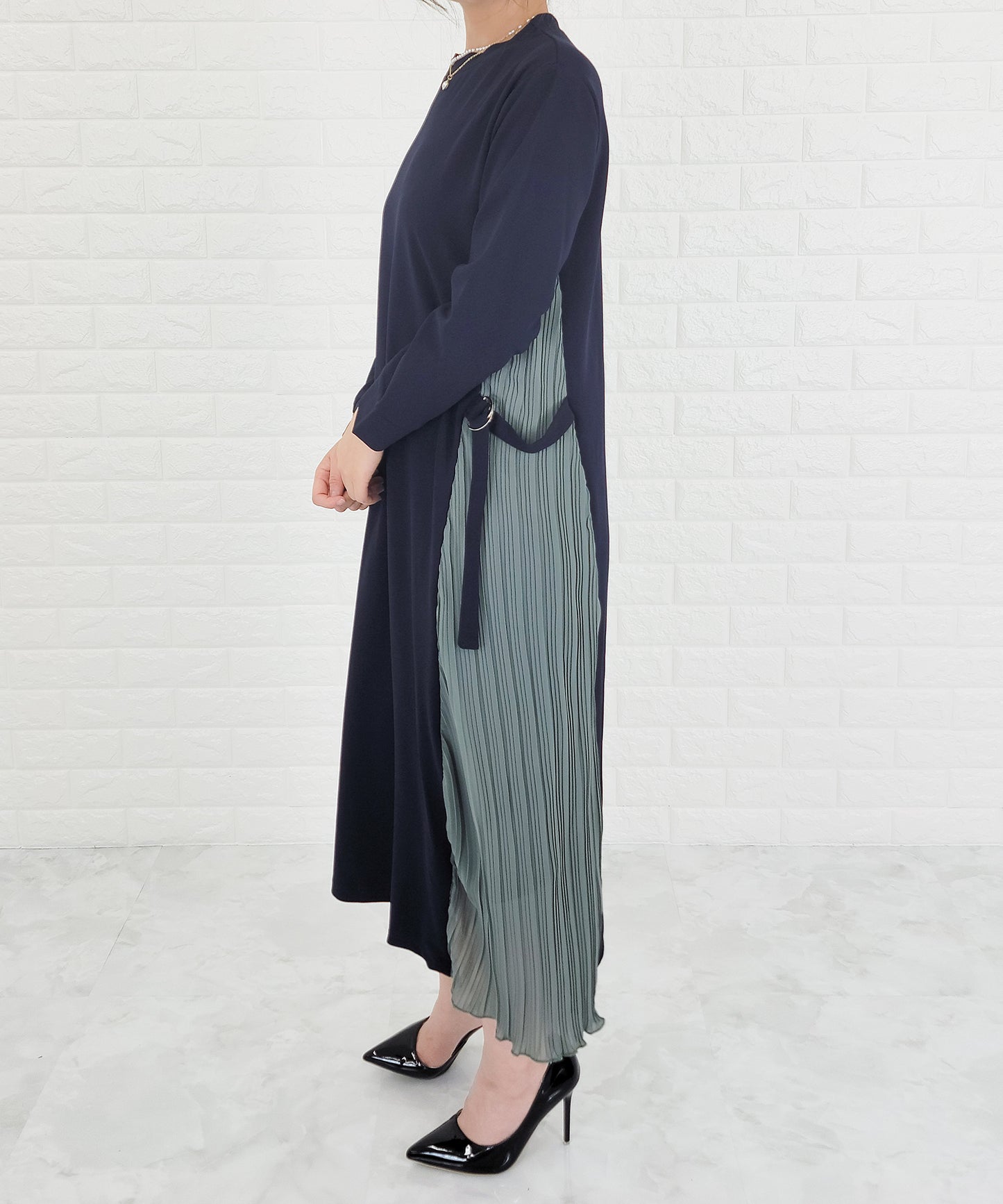 ラウンドネック サイドプリーツ切り替え Aラインワンピース