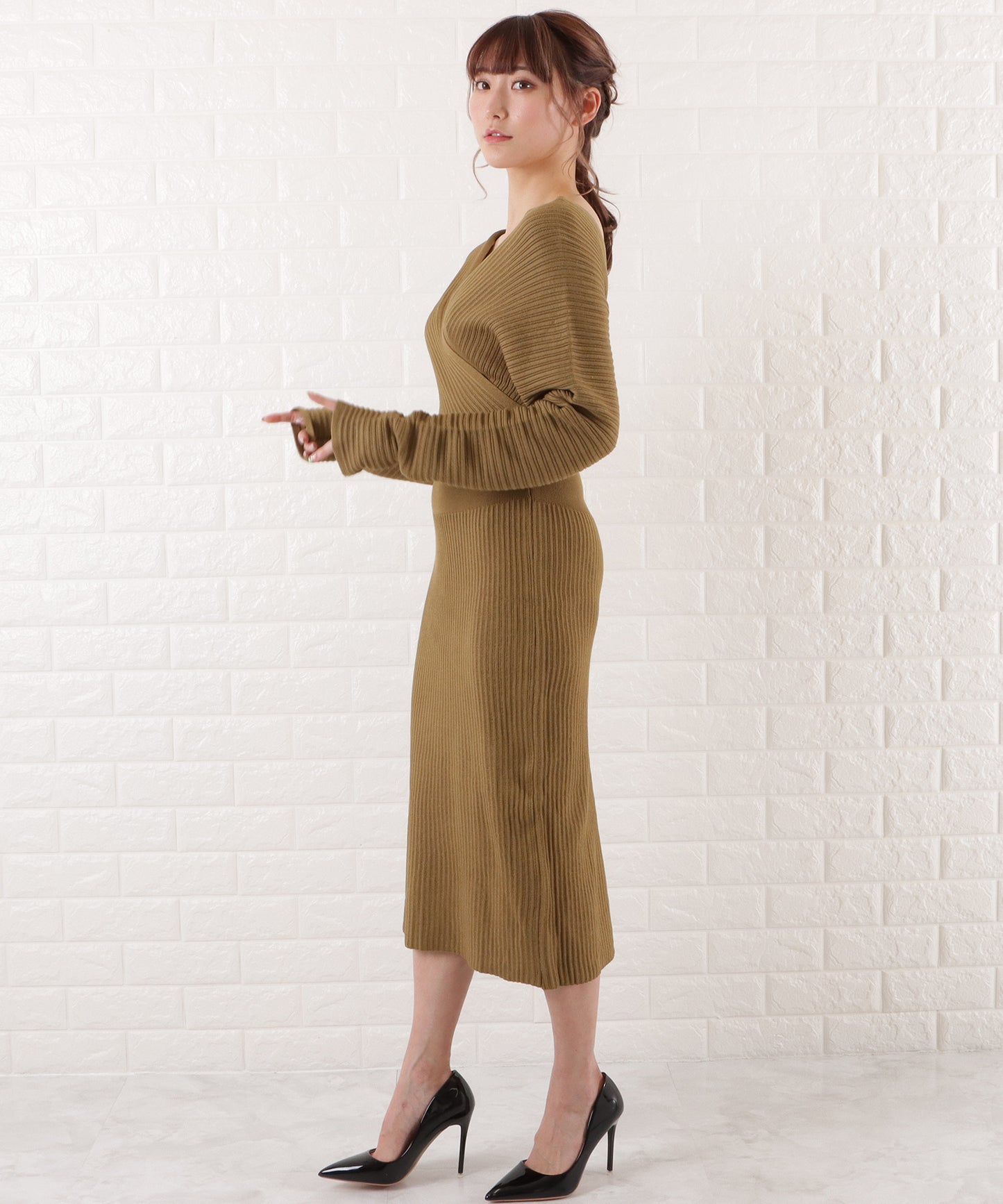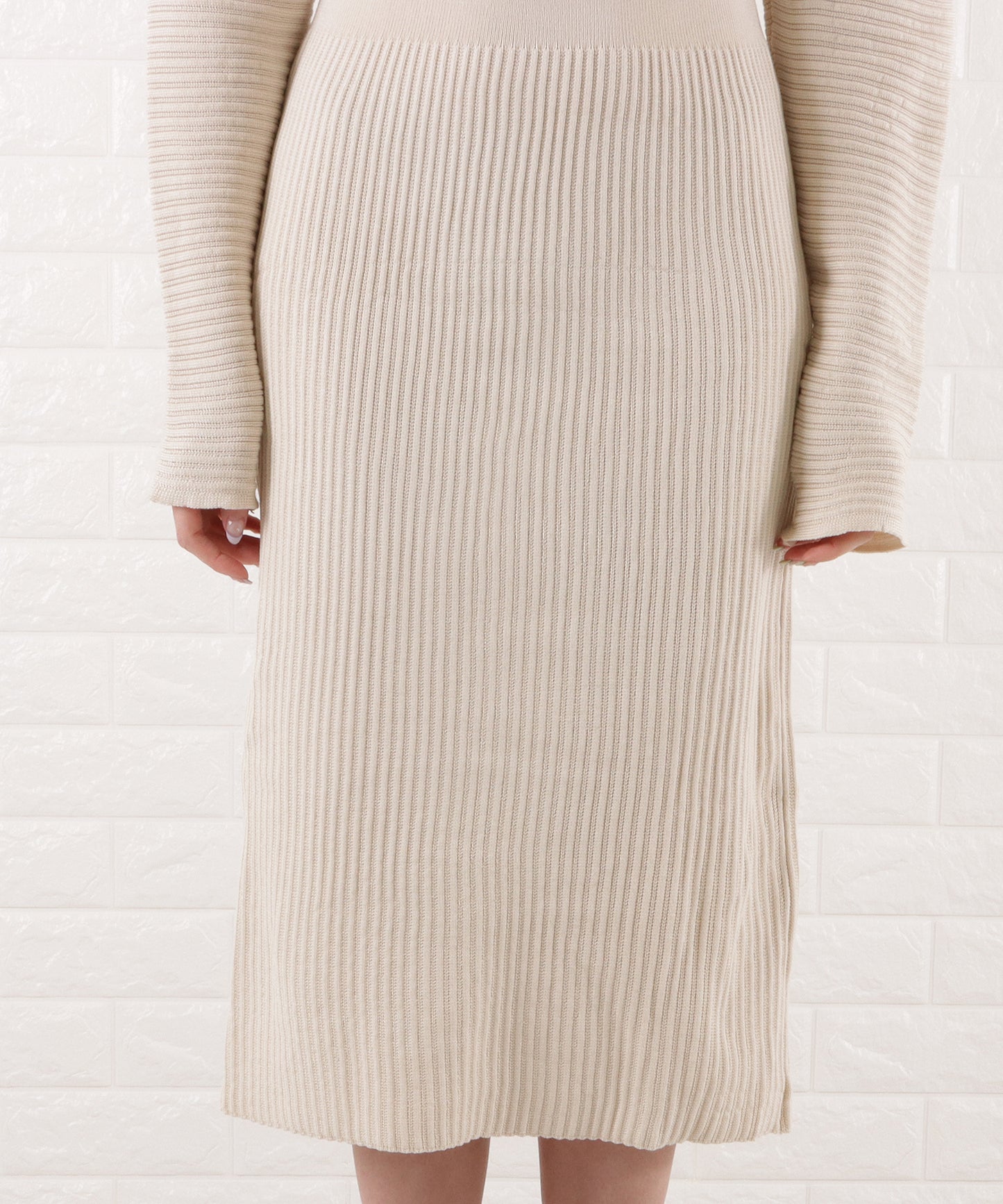 トップス部分はドルマンスリーブでゆとりを持たせ、スカート部分は程よくフィットするメリハリのあるシルエット。
