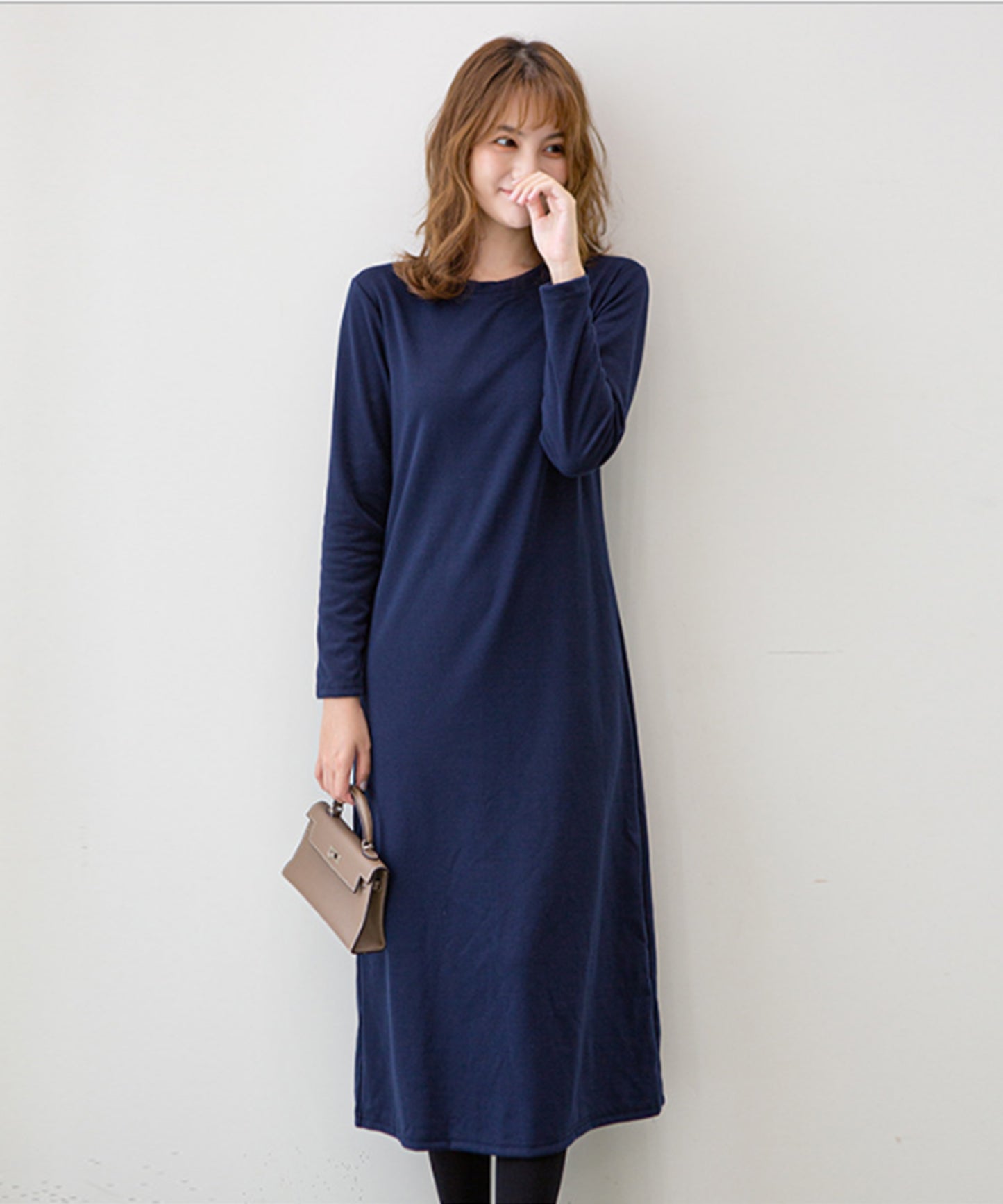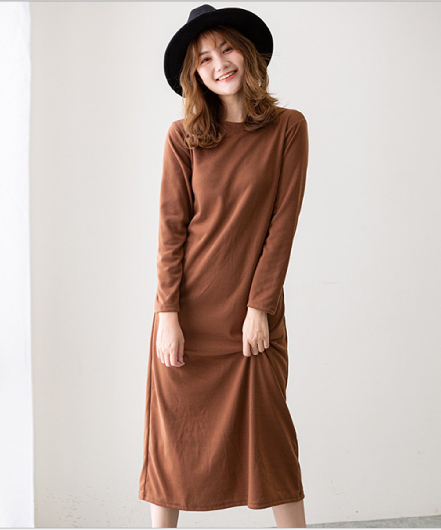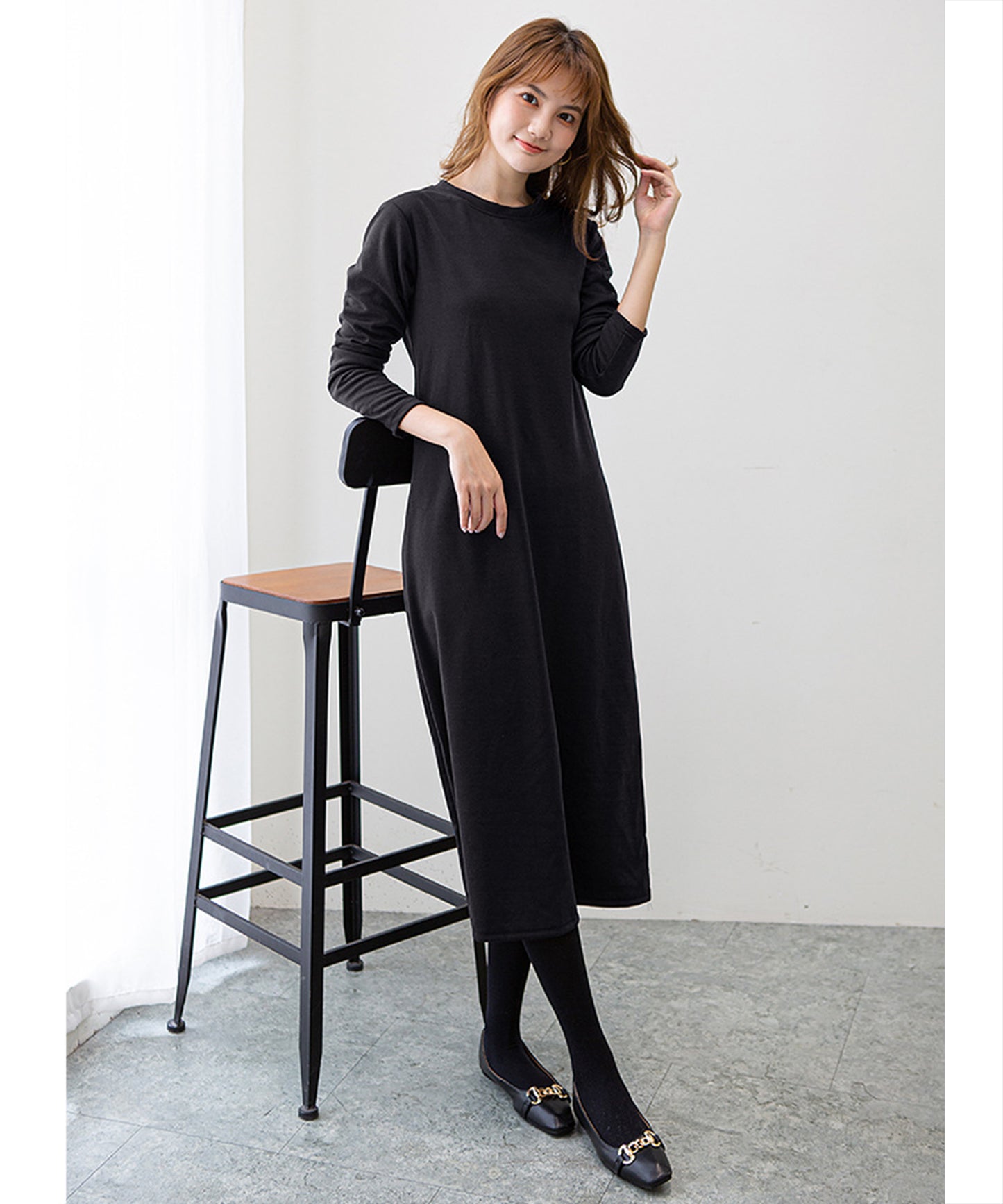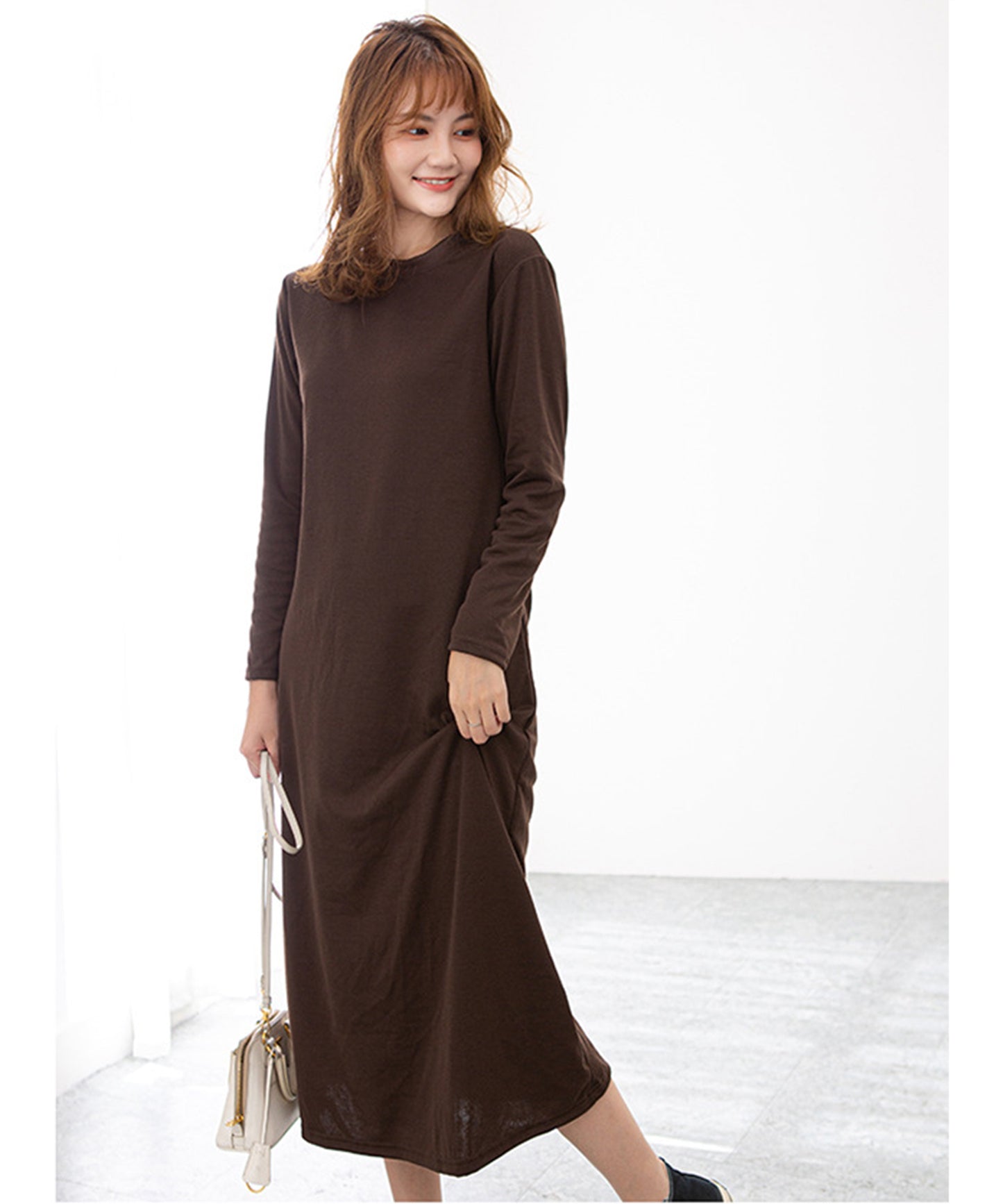 長袖ロング丈無地ワンピース