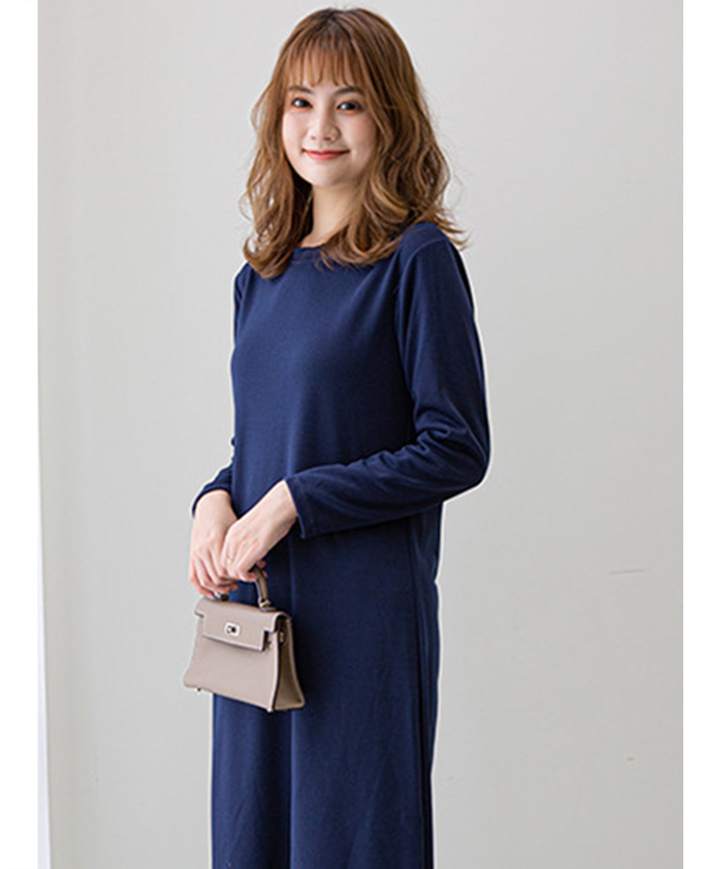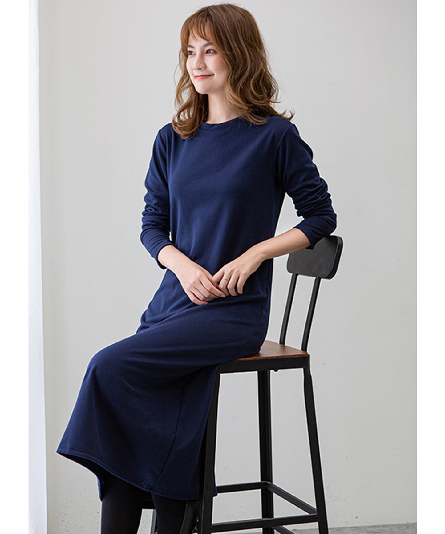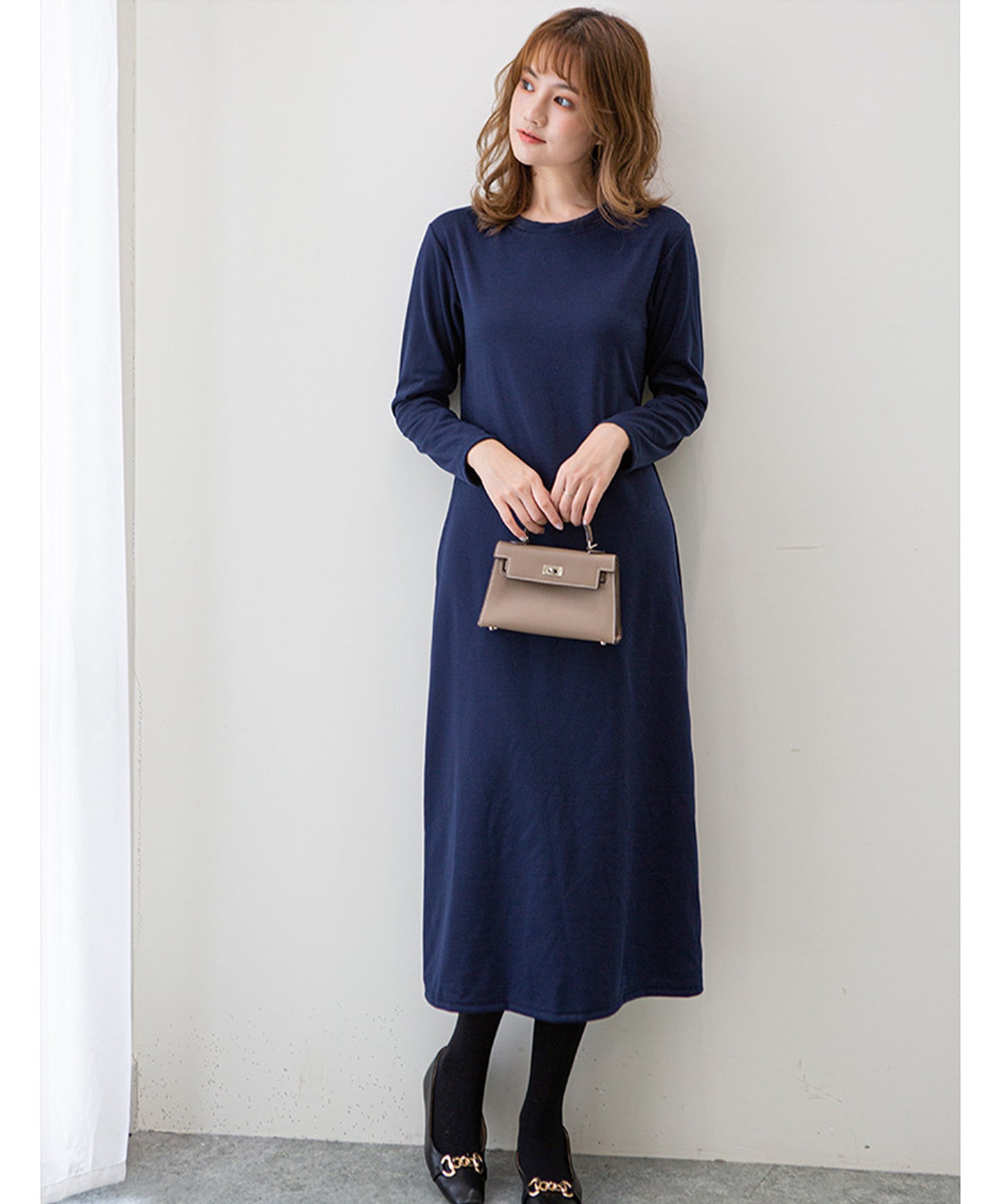 長袖ロング丈無地ワンピース