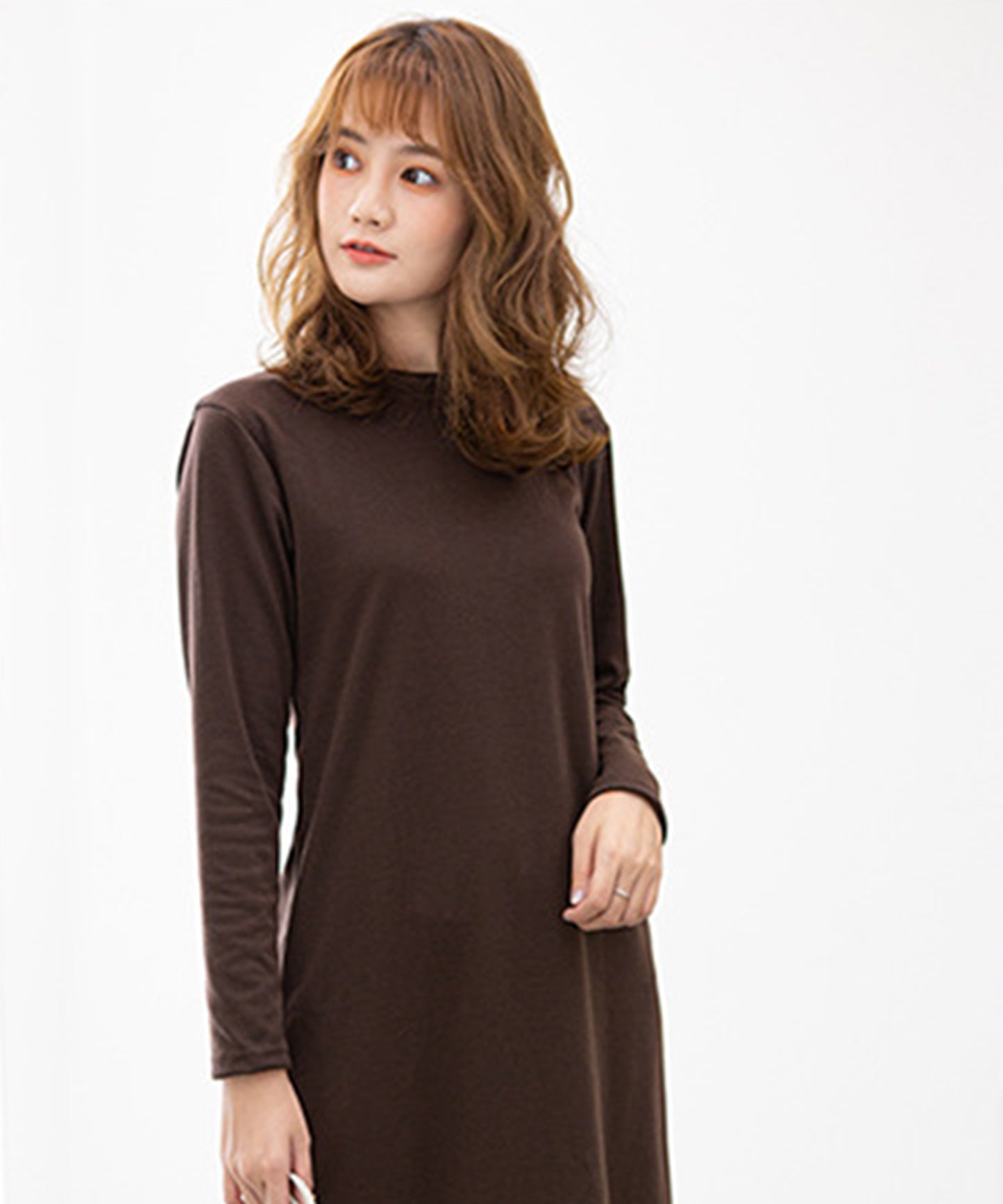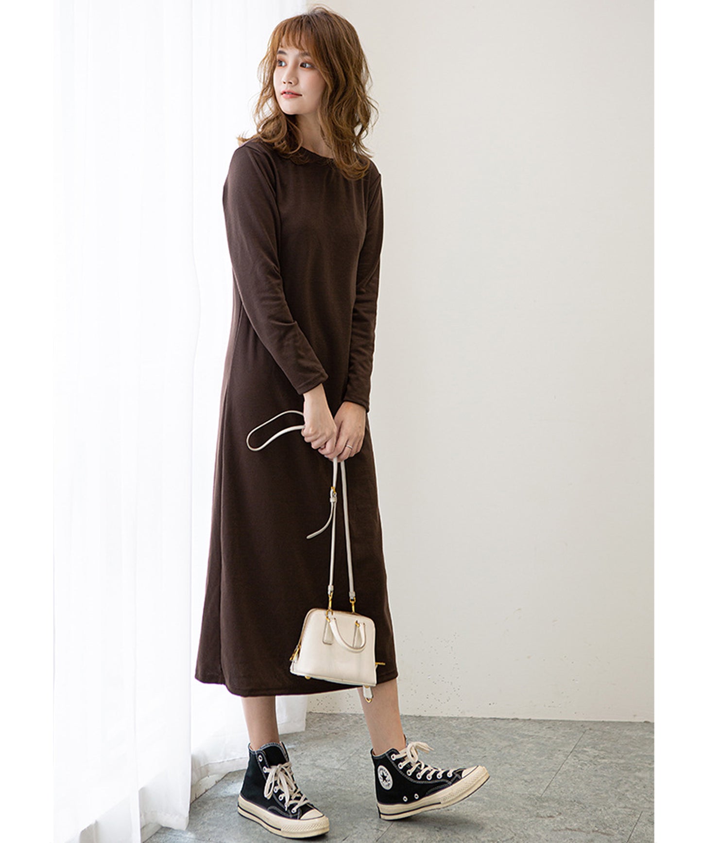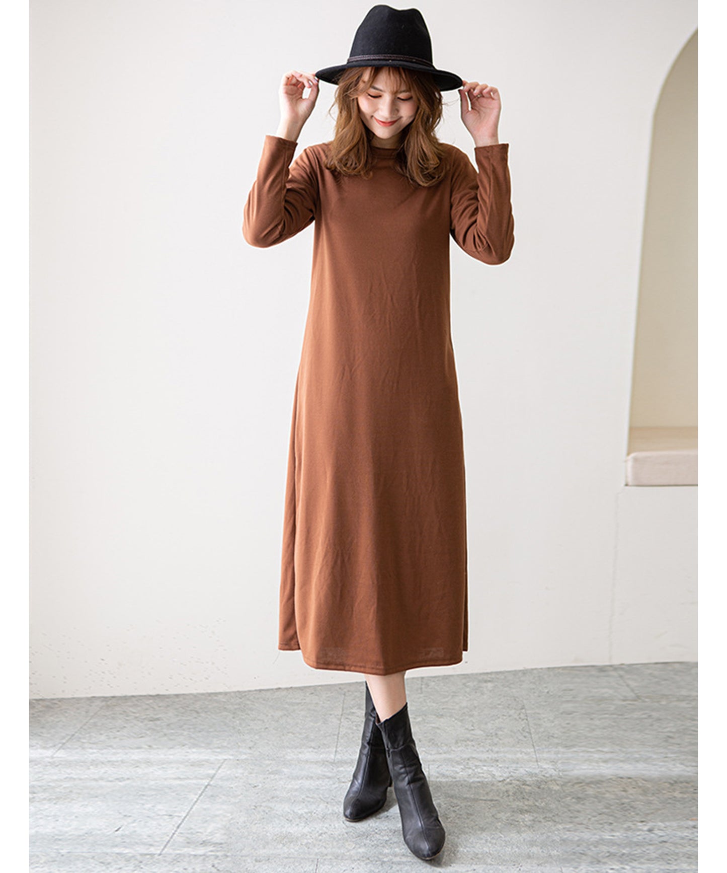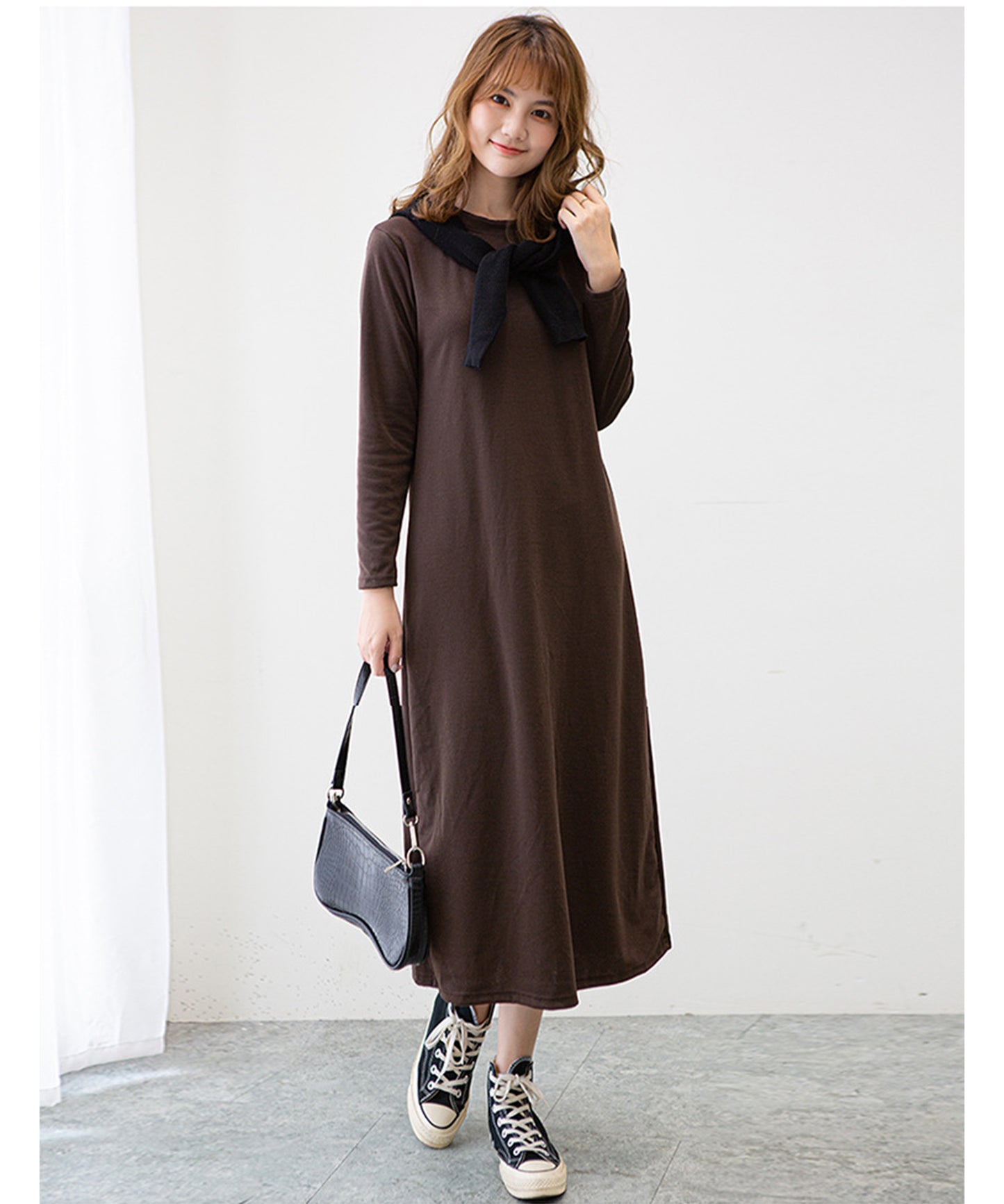 長袖ロング丈無地ワンピース