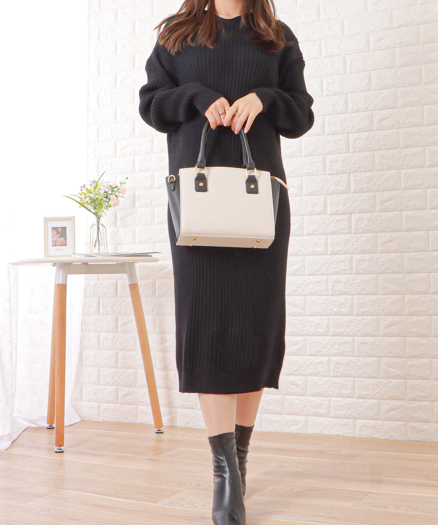 配色 クルーネック キャンディースリーブ ギャザー ドレス