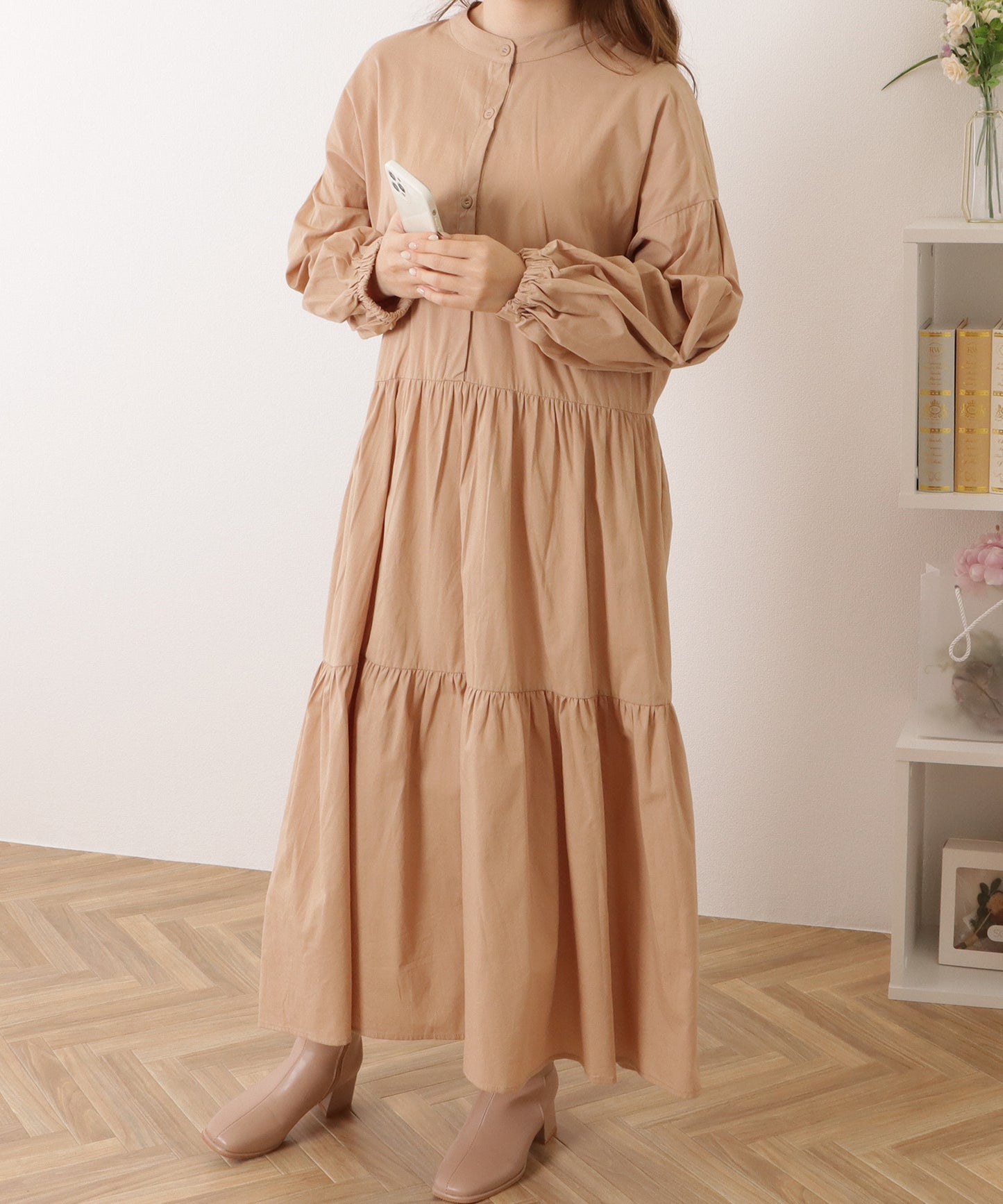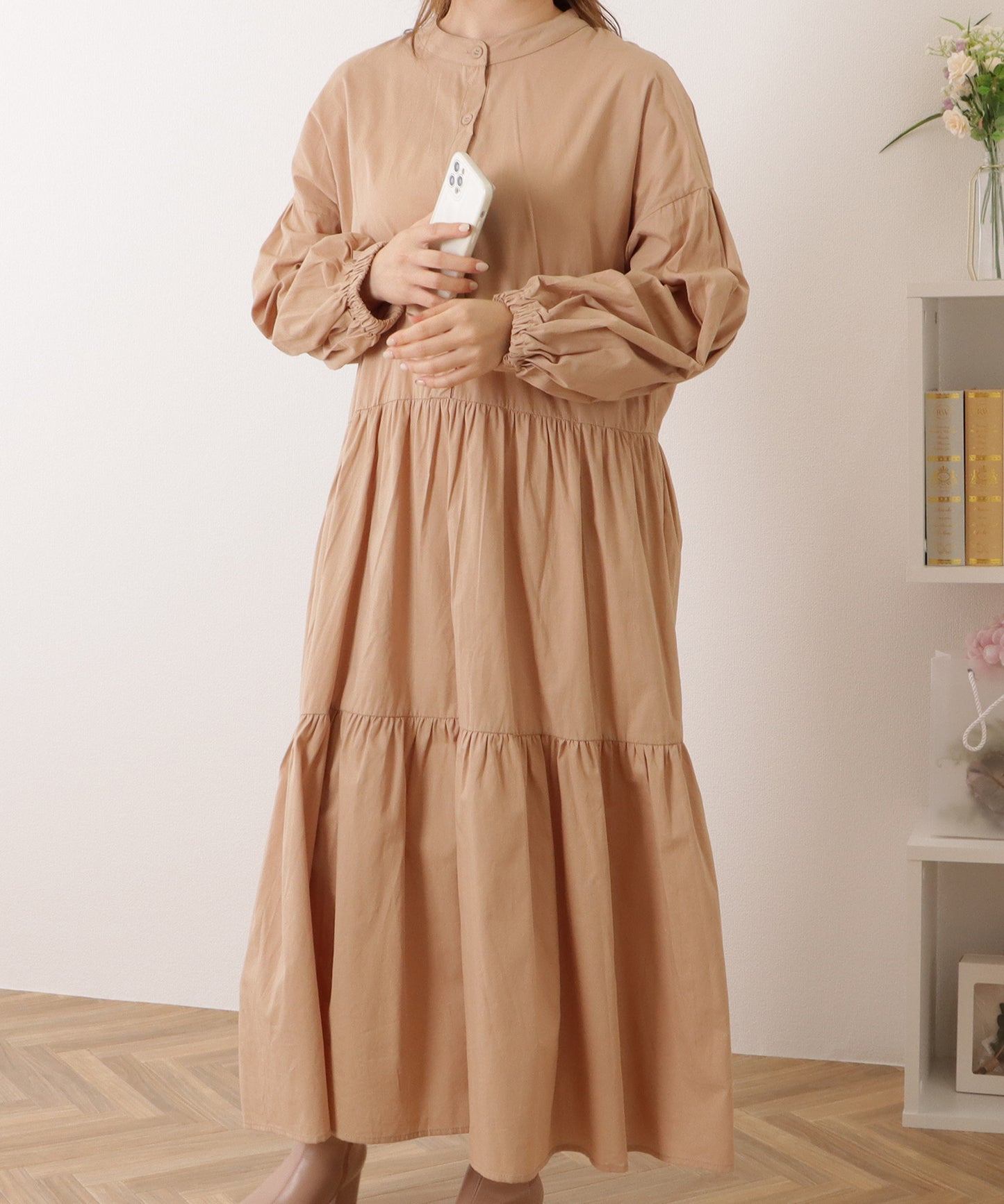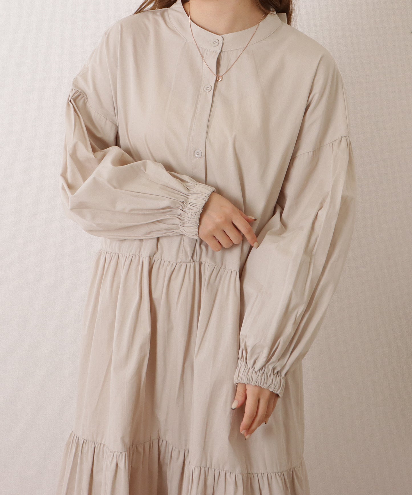 バンドカラー ロング ギャザー ランタン ワンピース