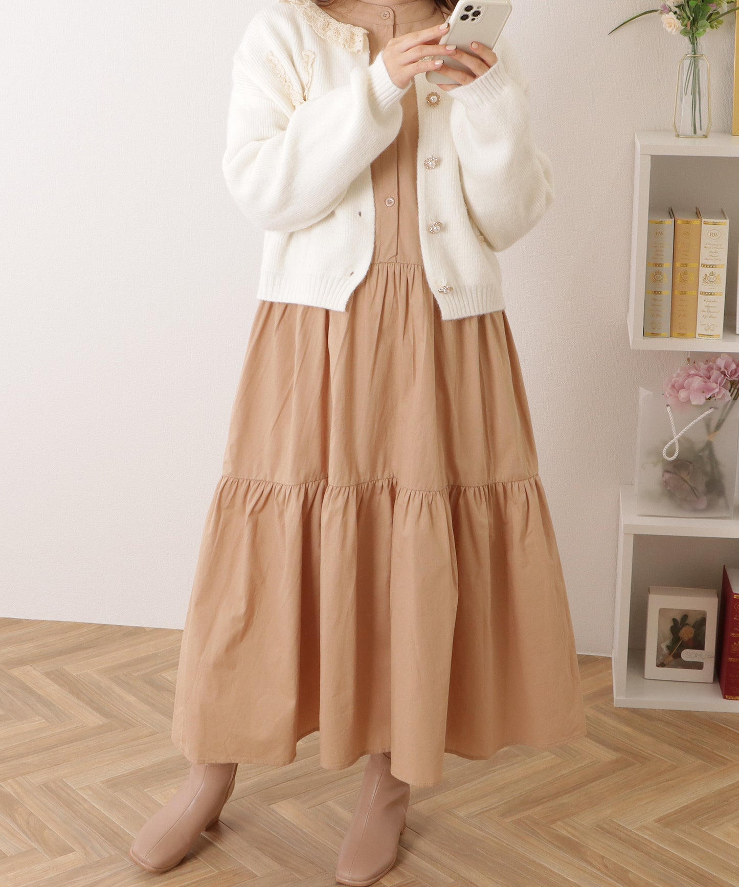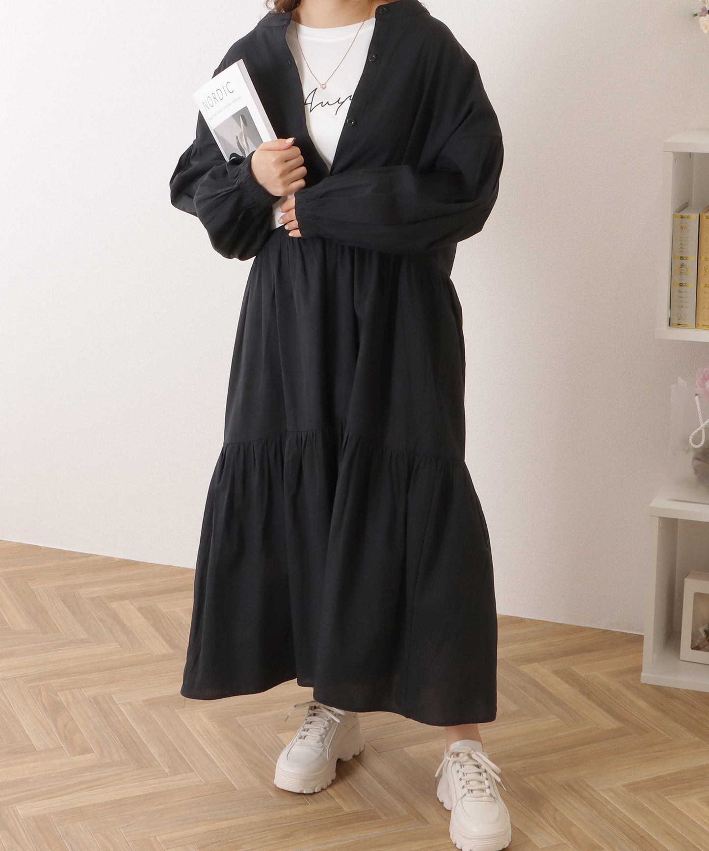 足元まですっぽりとカバーしてくれるゆとりのあるシルエットは、体型カバー効果も期待できます。