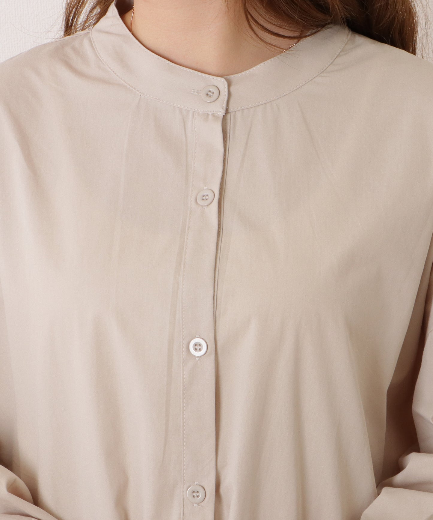 きちんと感のあるバンドカラーに、ボリューミーなランタンスリーブを合わせたほど良い抜け感がおしゃれな1枚。