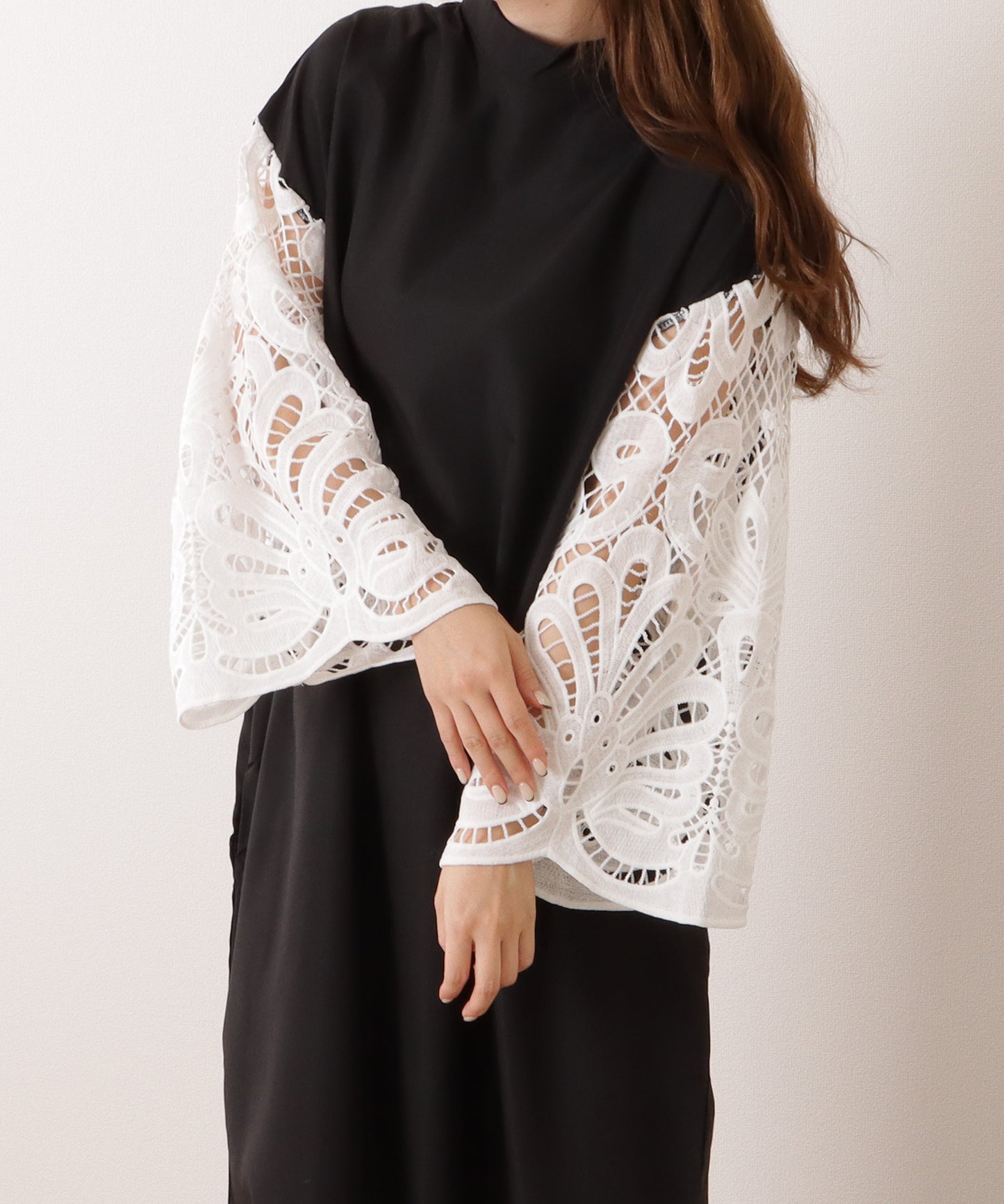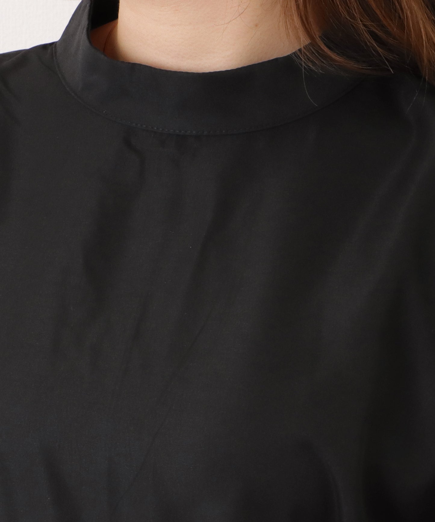 透け感がフェミニンなスリーブに少し重めのスタンドカラーを合わせて、バランス感の取れた1枚に仕上げました。