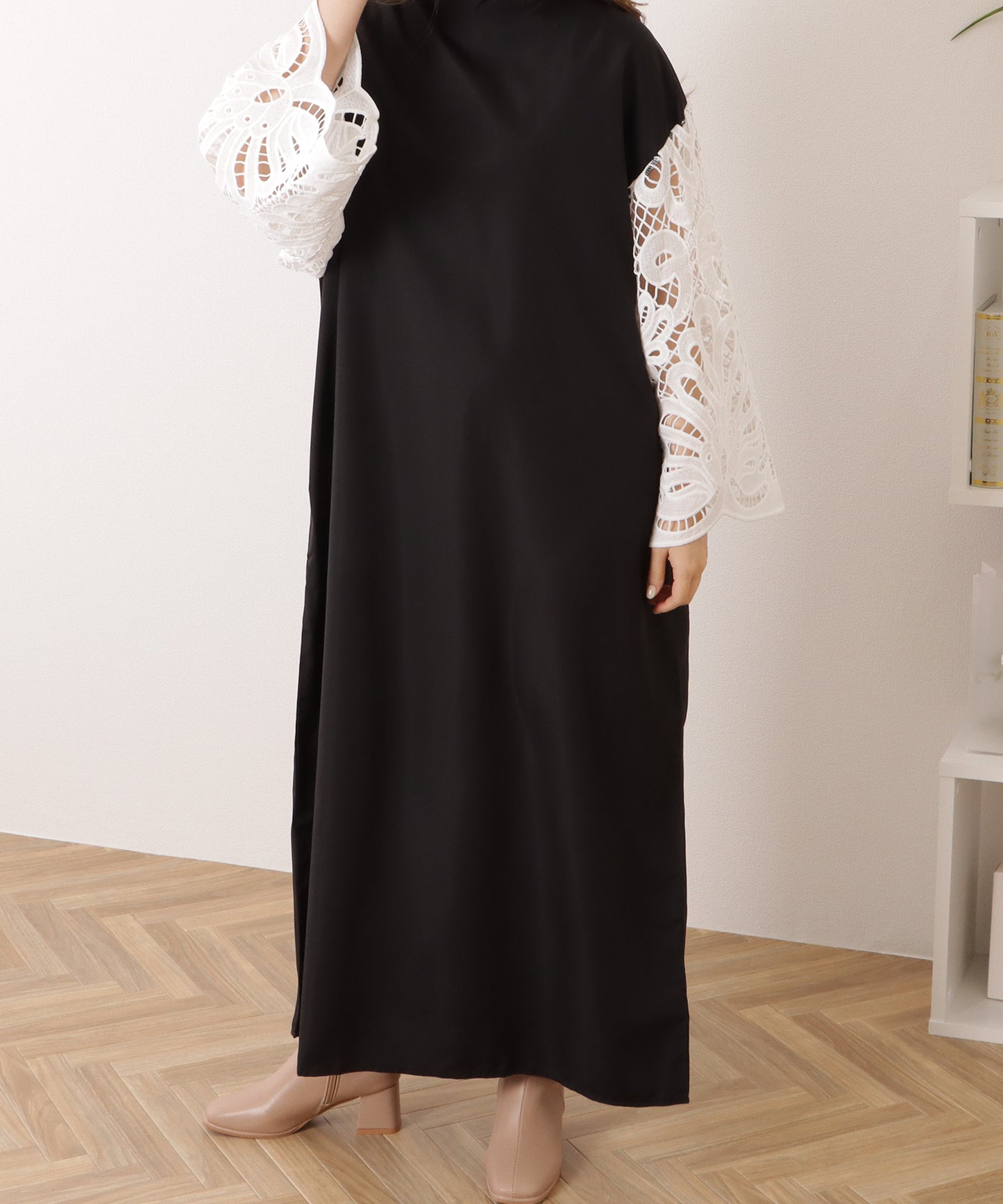 スタンドカラー レース スリーブ ロング ワンピース