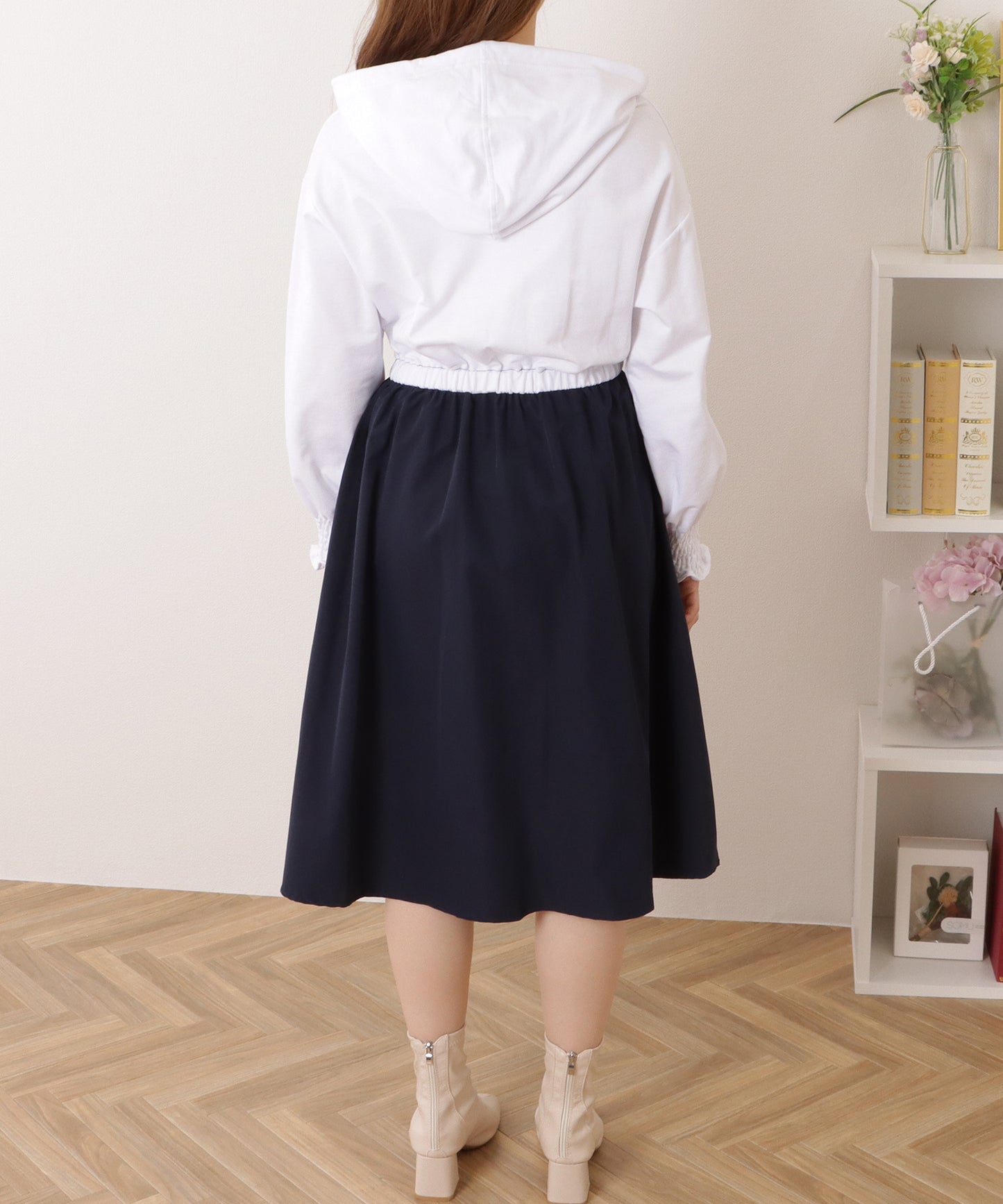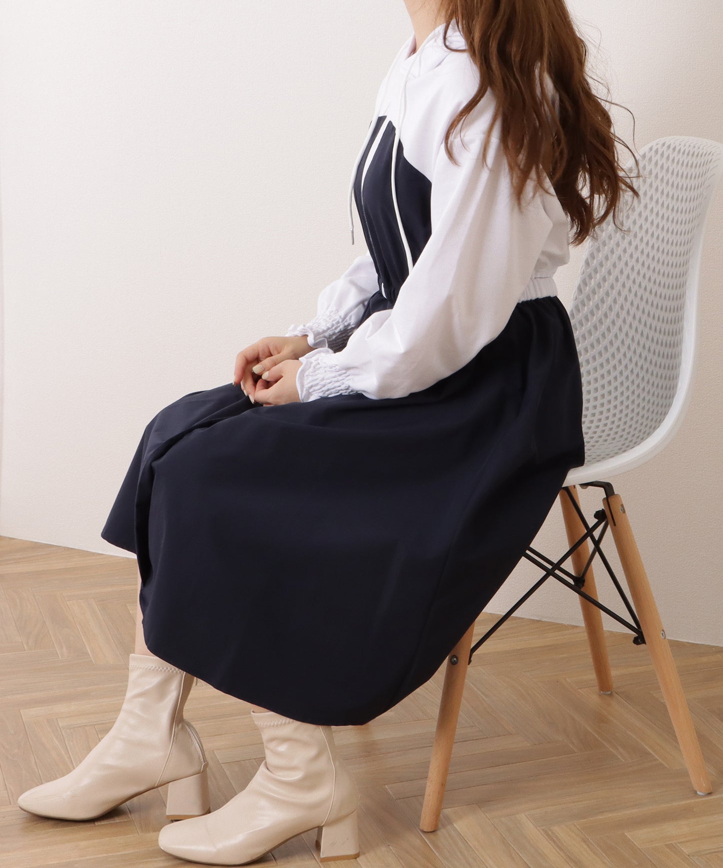 カジュアルなフード付きトップスをインに合わせたような、フェイクレイヤードワンピース。