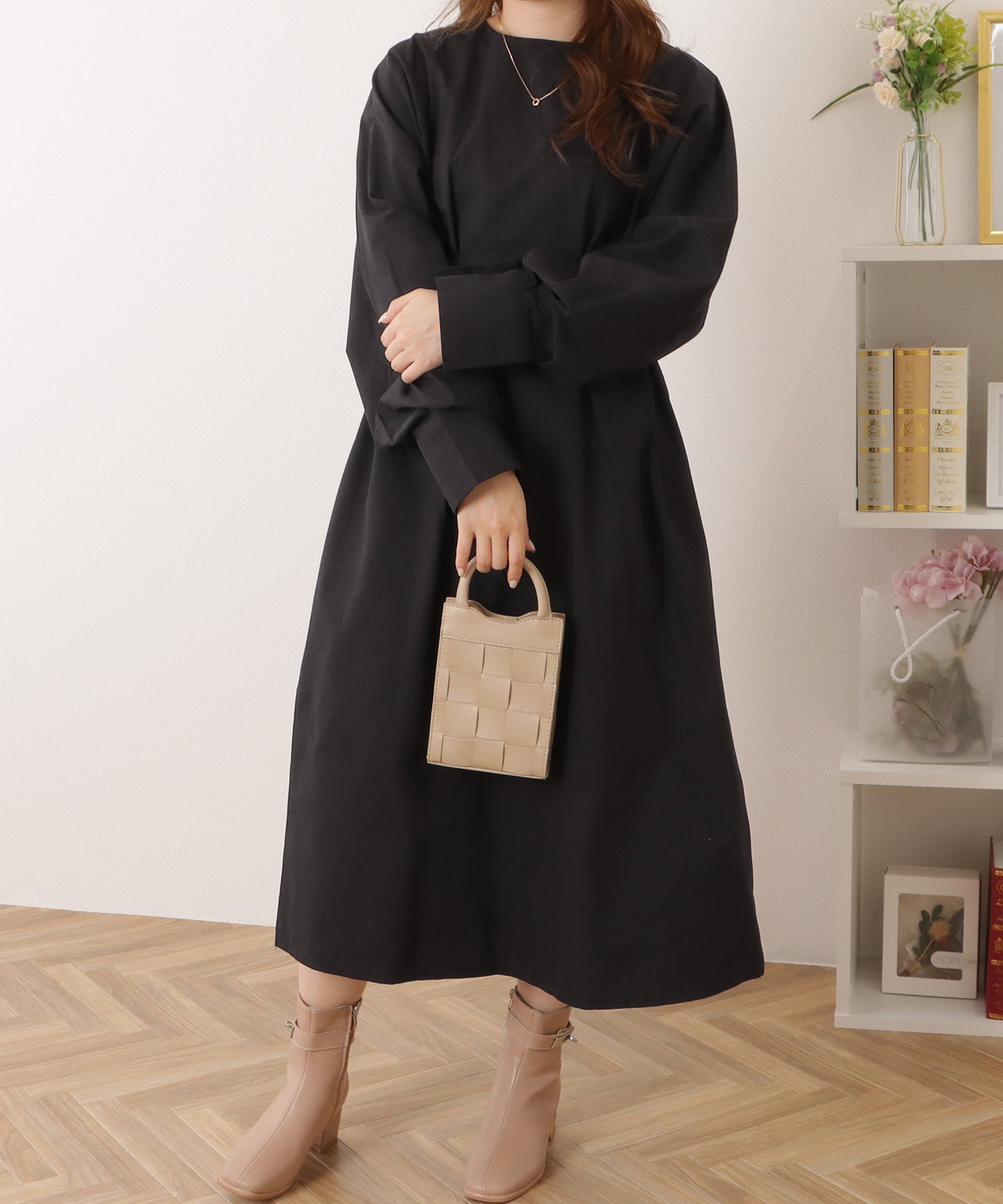 配色 クルーネック キャンディースリーブ ギャザー ドレス