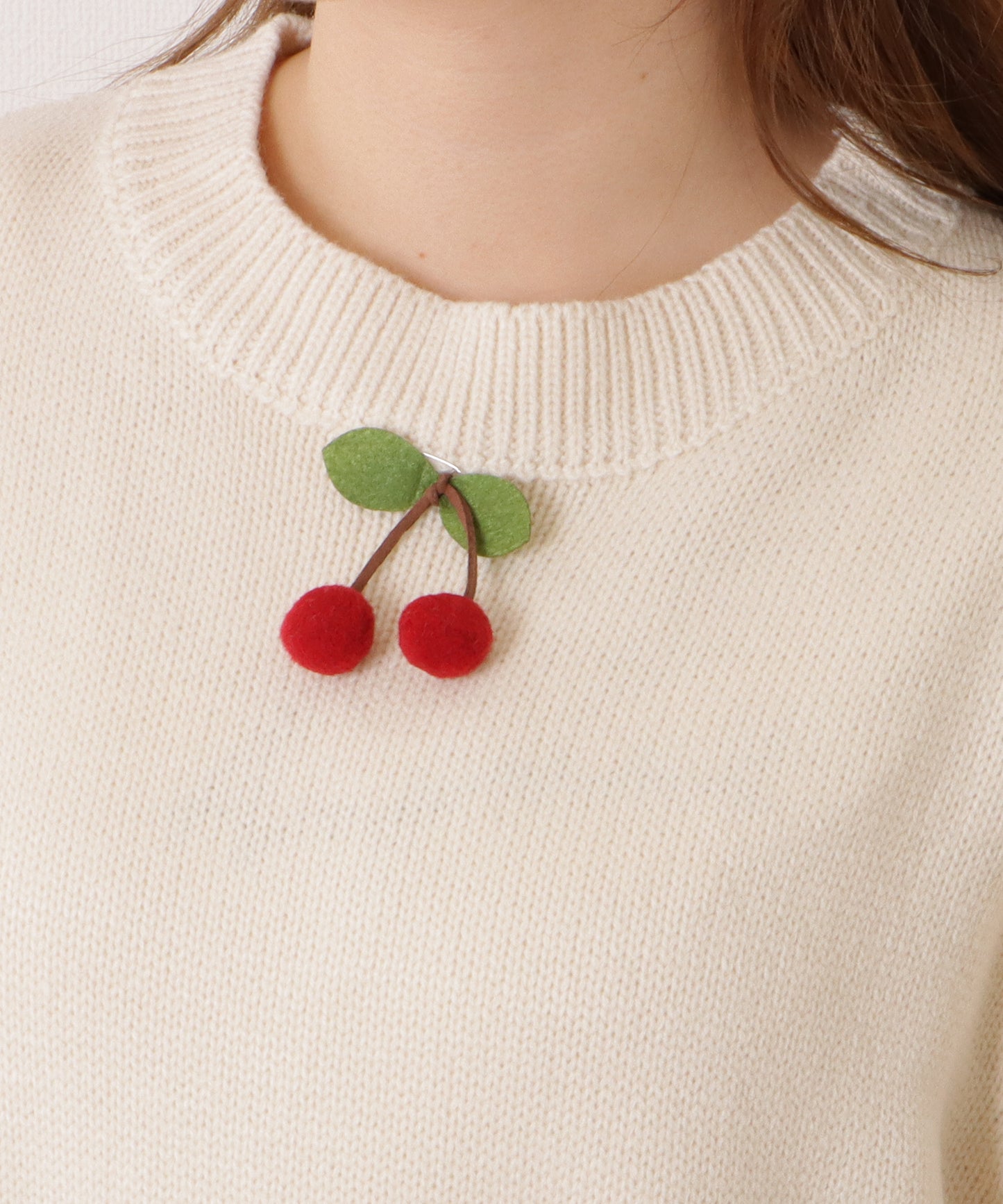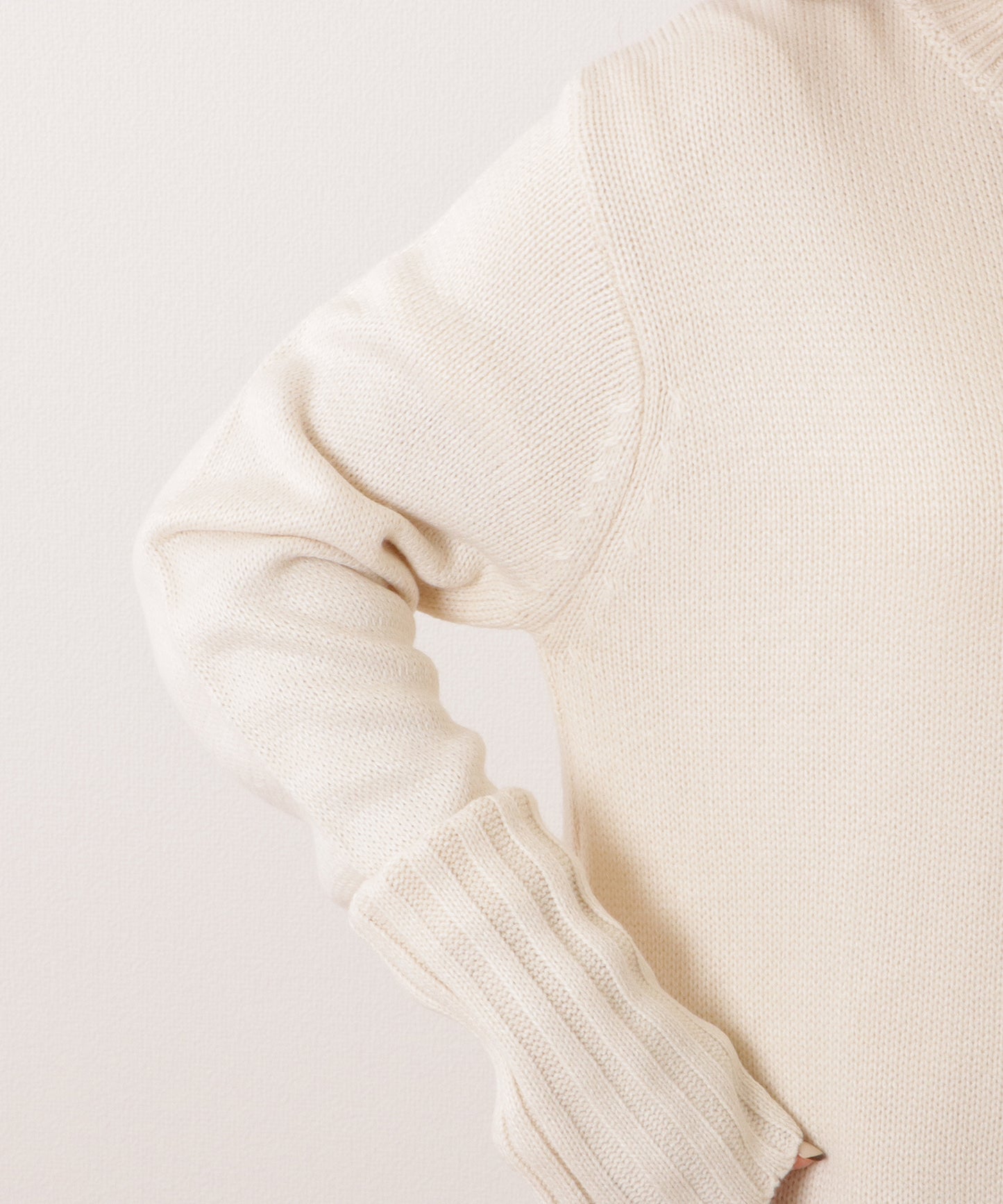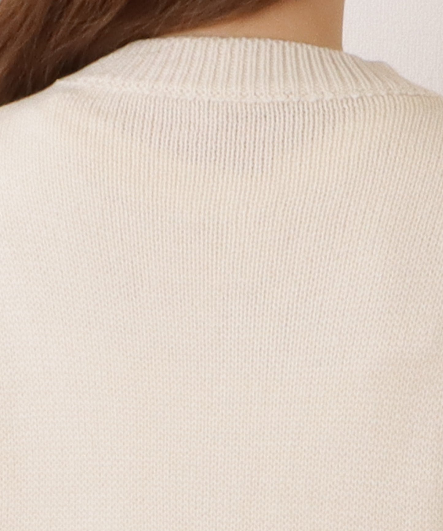 定番のクルーネックで、ブラウスやカットソーの重ね着をしやすいのもうれしいところ。