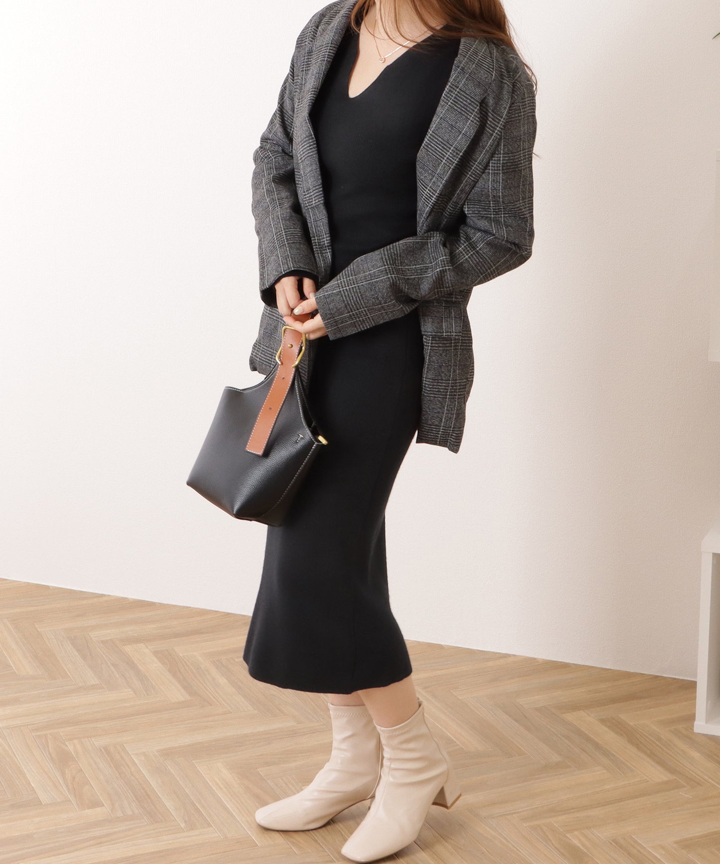 さらりと1枚でも様になるので、足元や小物のアレンジで遊びを加えるのもおすすめです。
