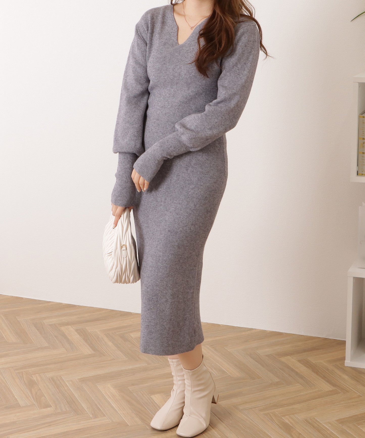秋冬らしいウォーミーな素材感を際立たせる、シンプルなニットワンピース。