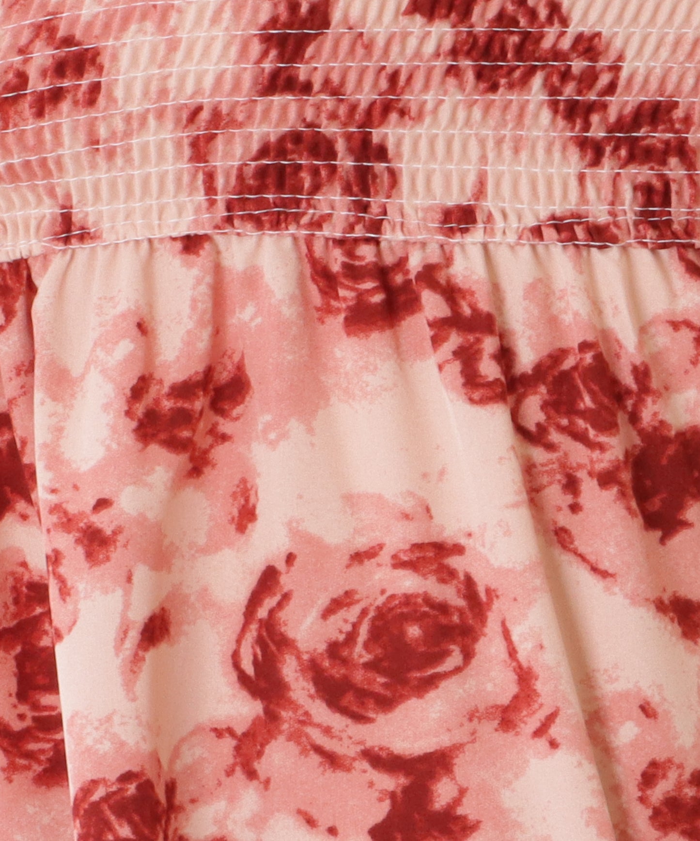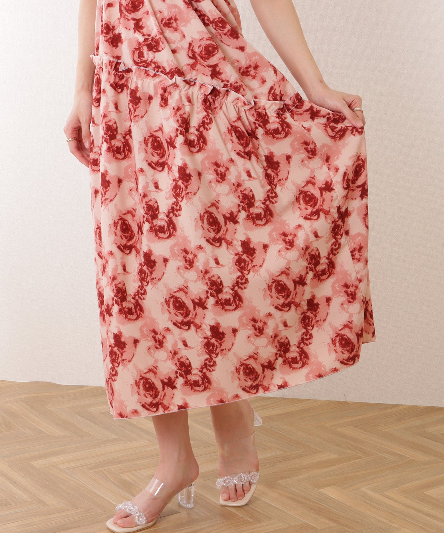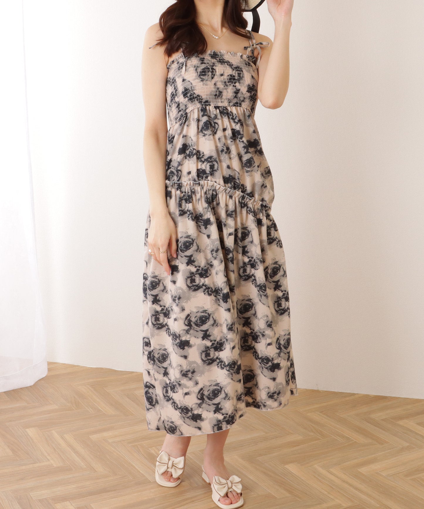 ウエスト ギャザー シャーリング 花柄 マキシ ワンピース