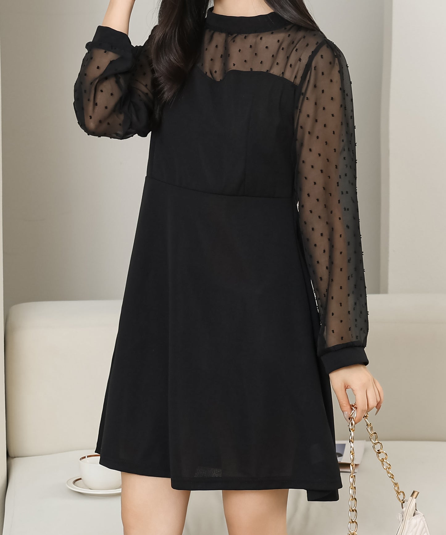 キュートなドット柄がまるで少女のような可愛らしさを演出してくれるので、首元はプチハイネックで引き締まった印象に。