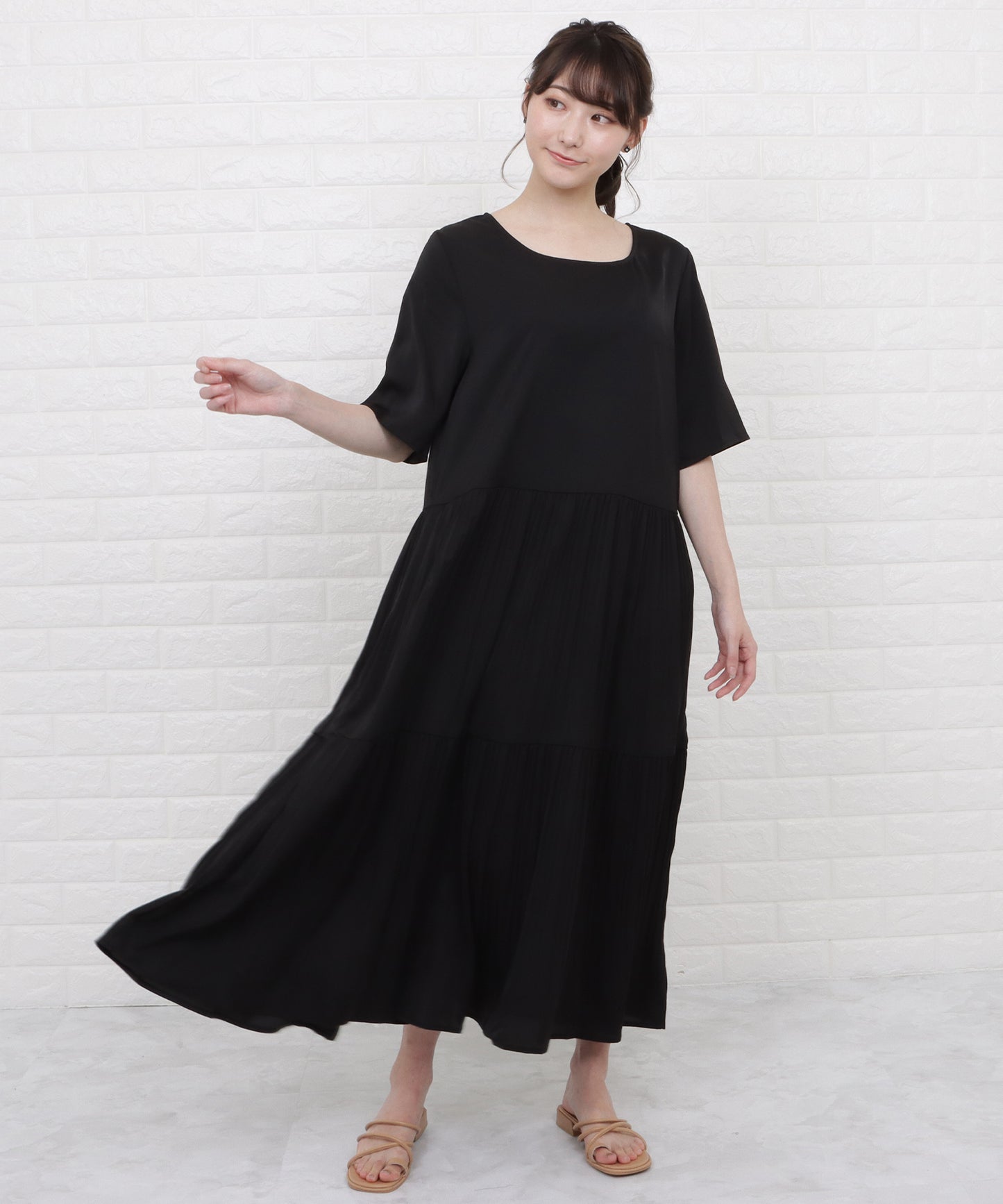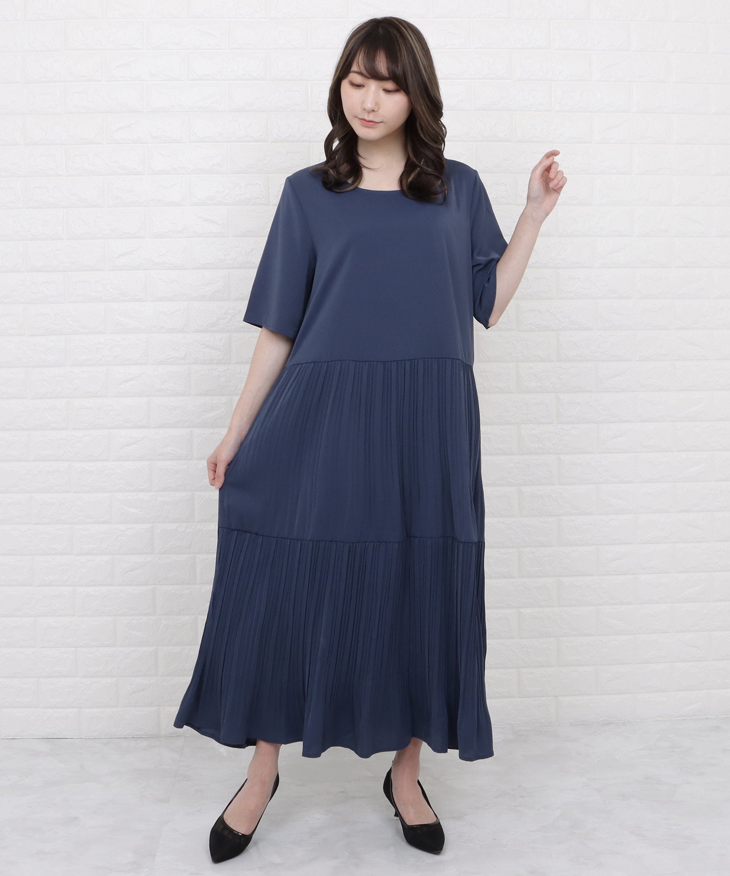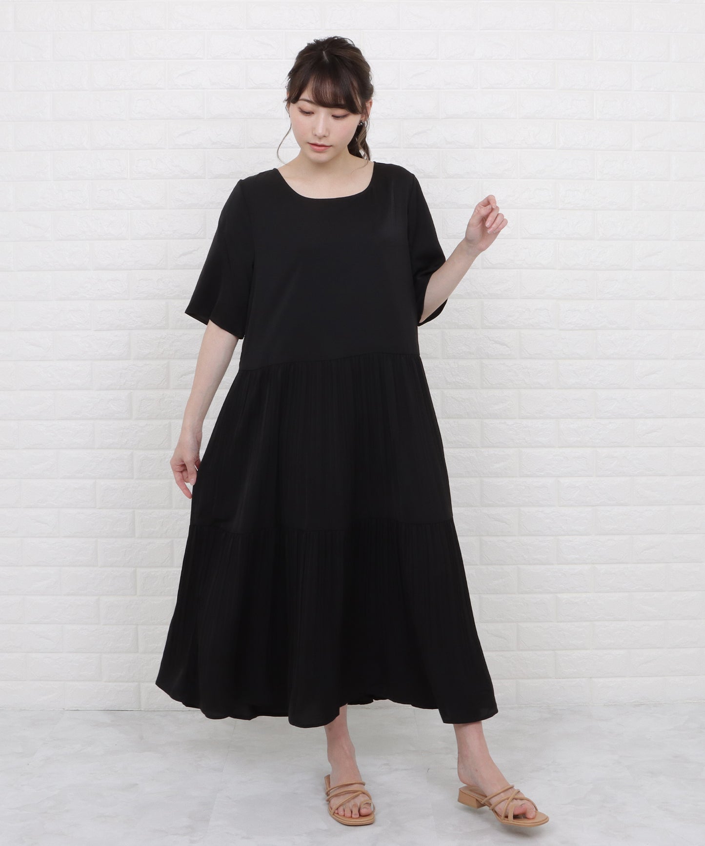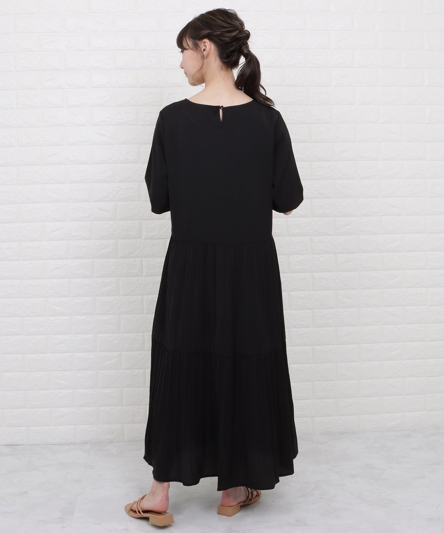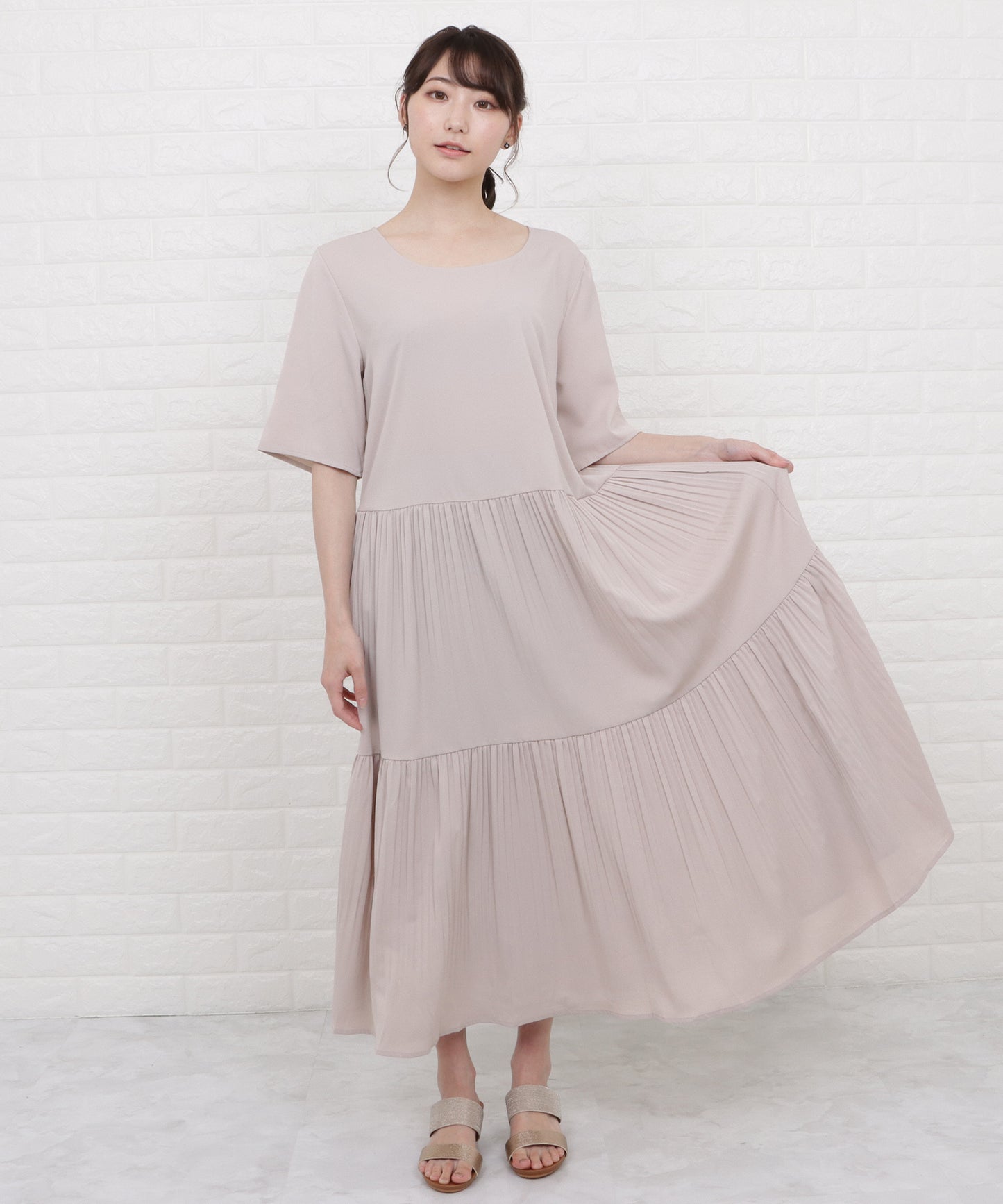 細かなプリーツ加工が施されたティアードマキシワンピース