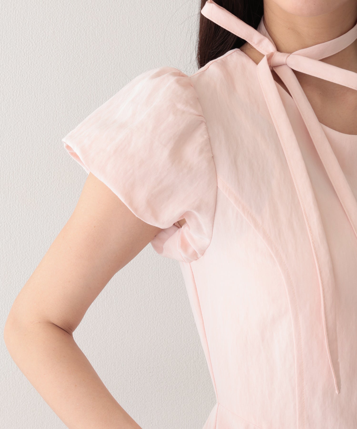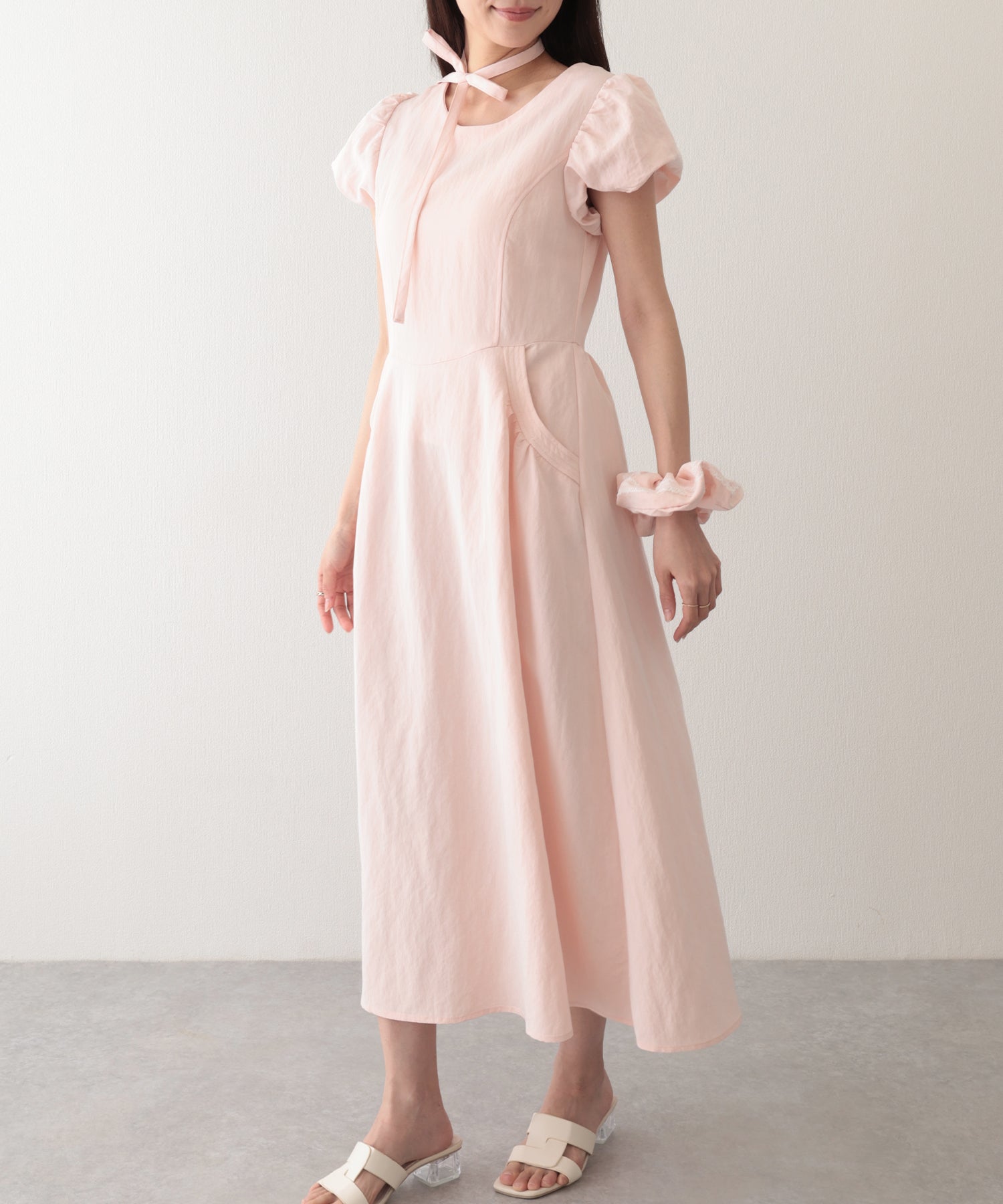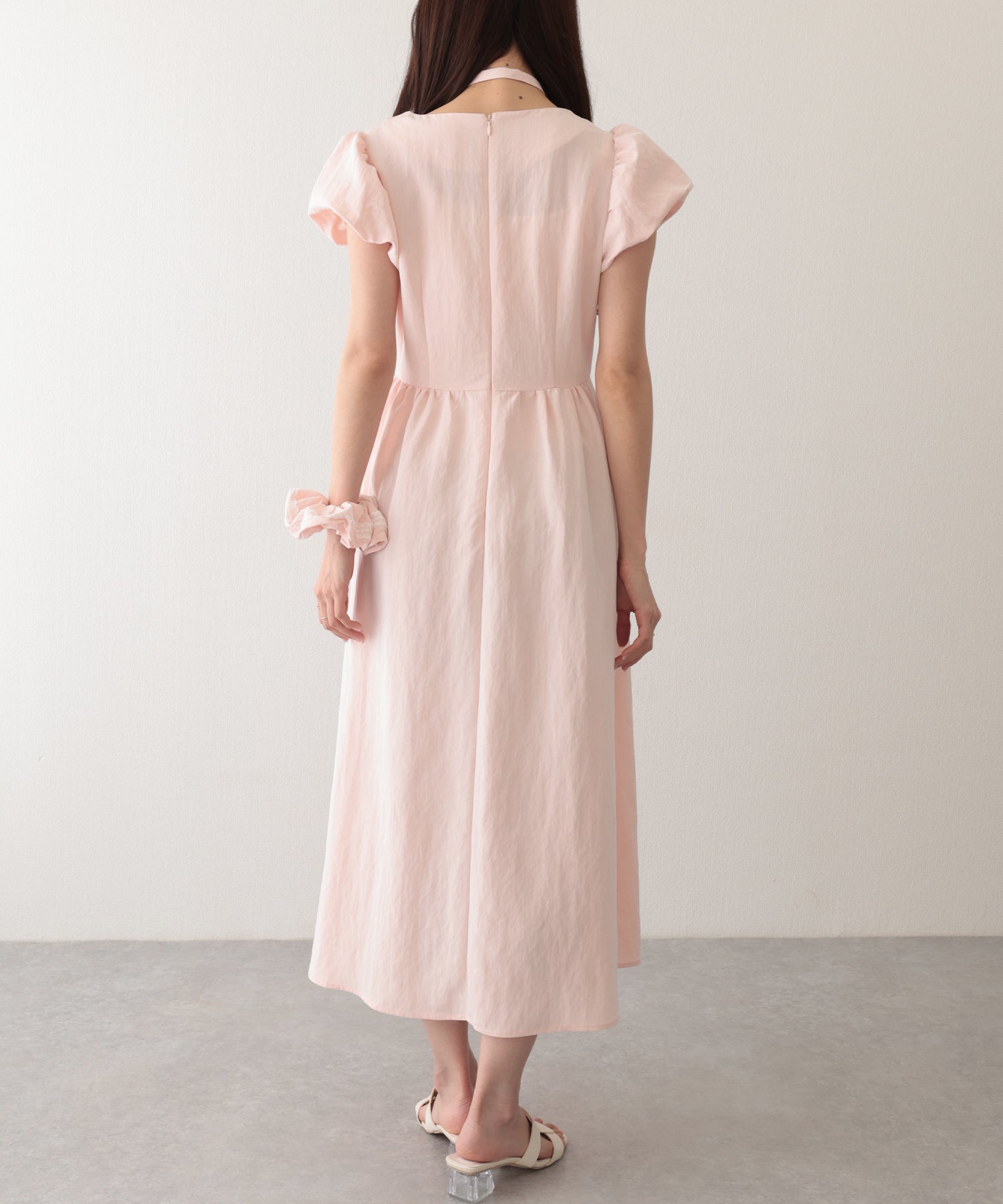 チョーカー付き クルーネック パフスリーブ ギャザー ロング ワンピース