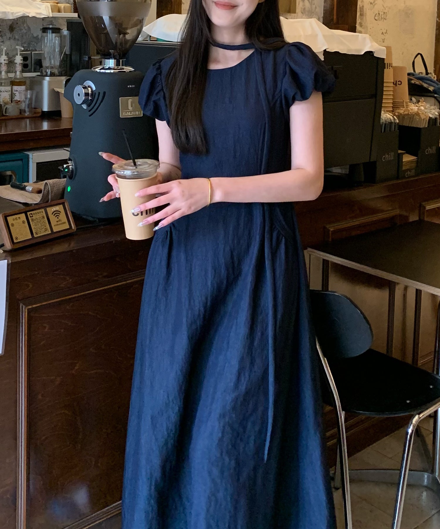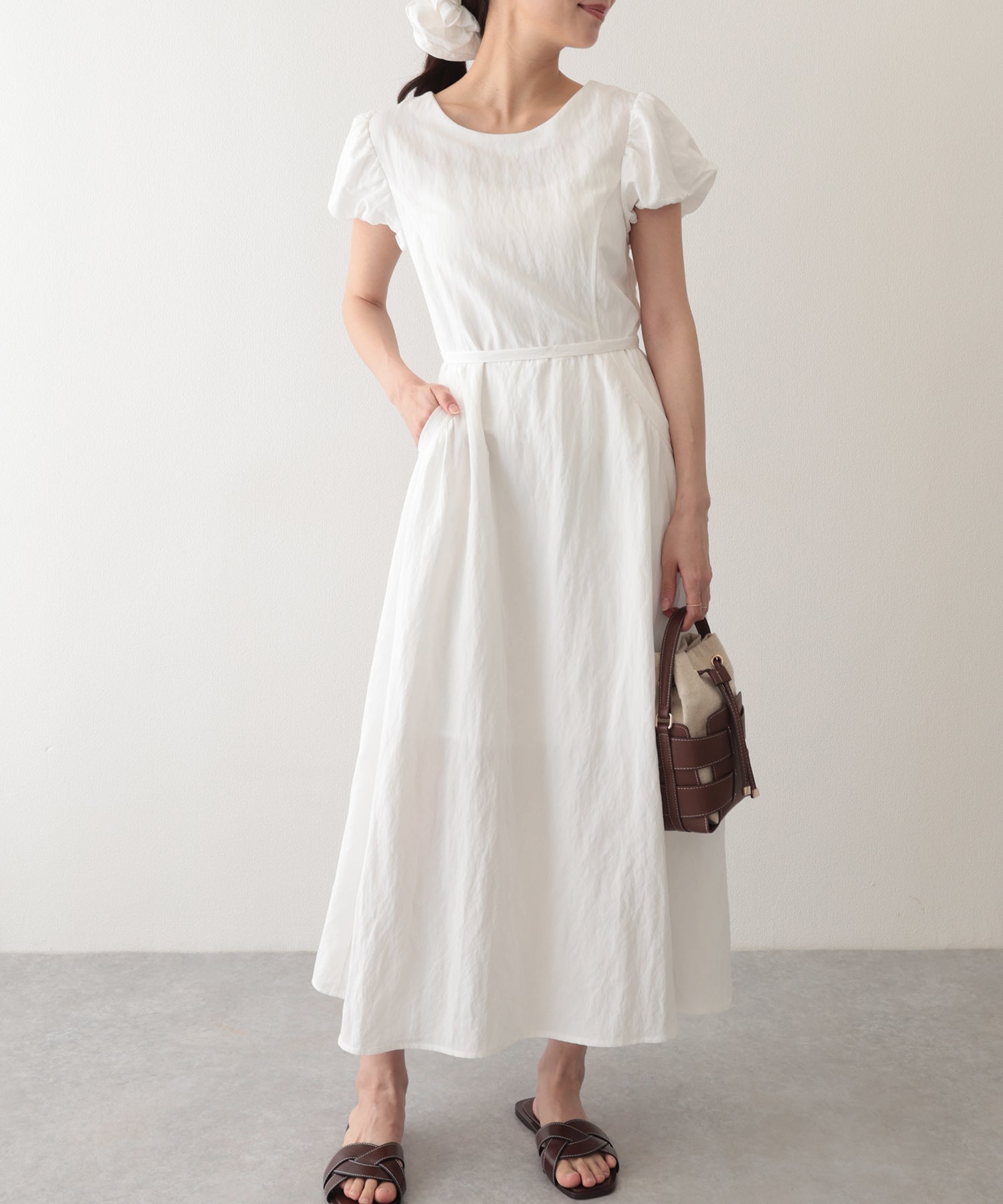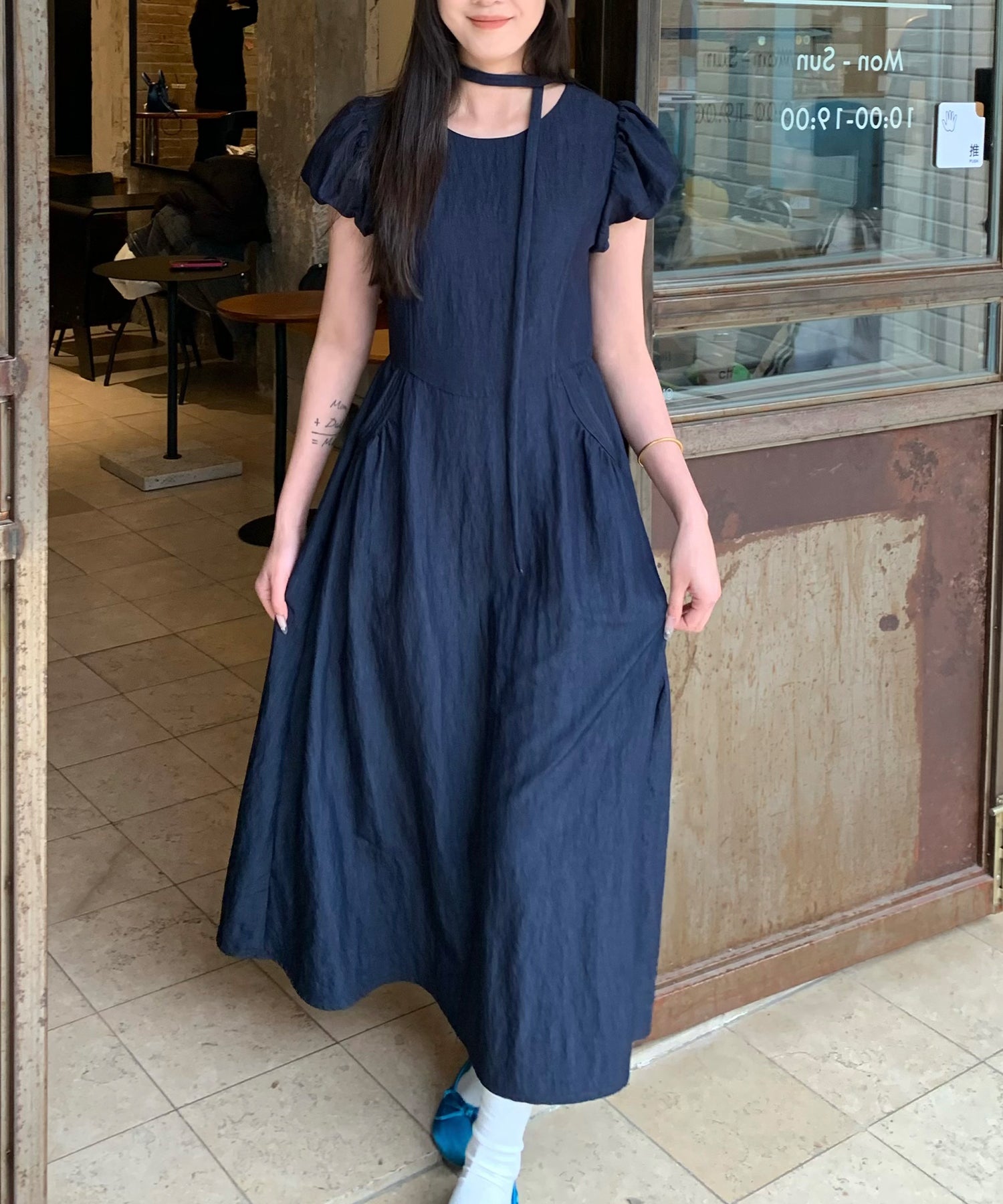 チョーカー付き クルーネック パフスリーブ ギャザー ロング ワンピース