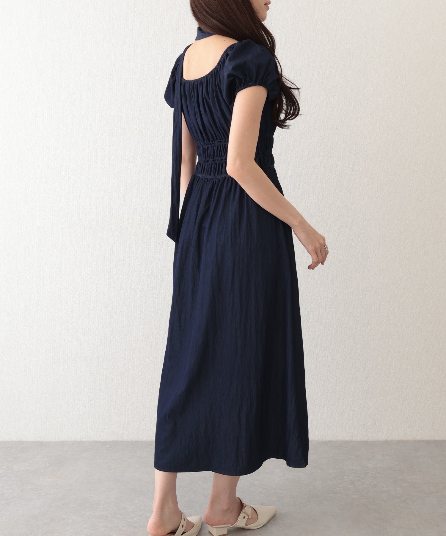 タイ付き パフスリーブ ギャザー ロング ワンピース