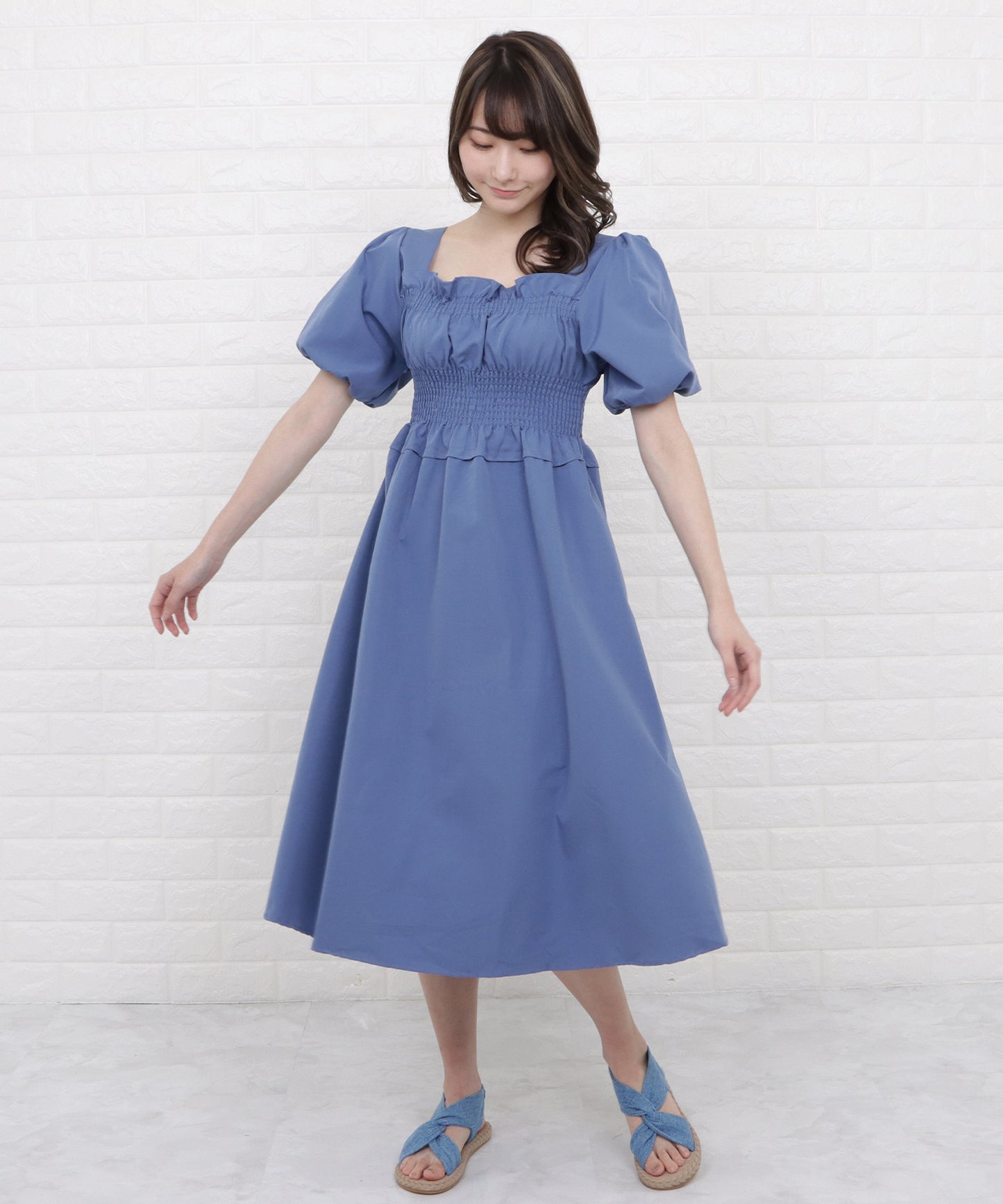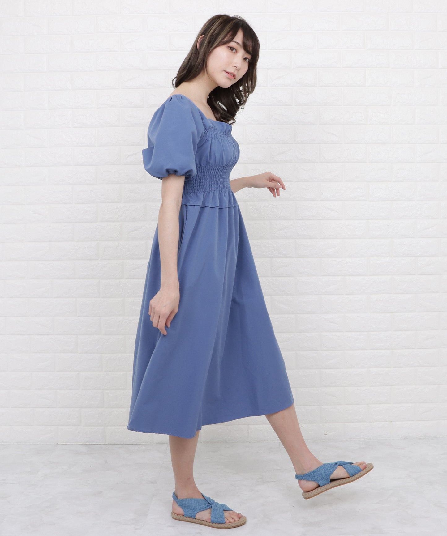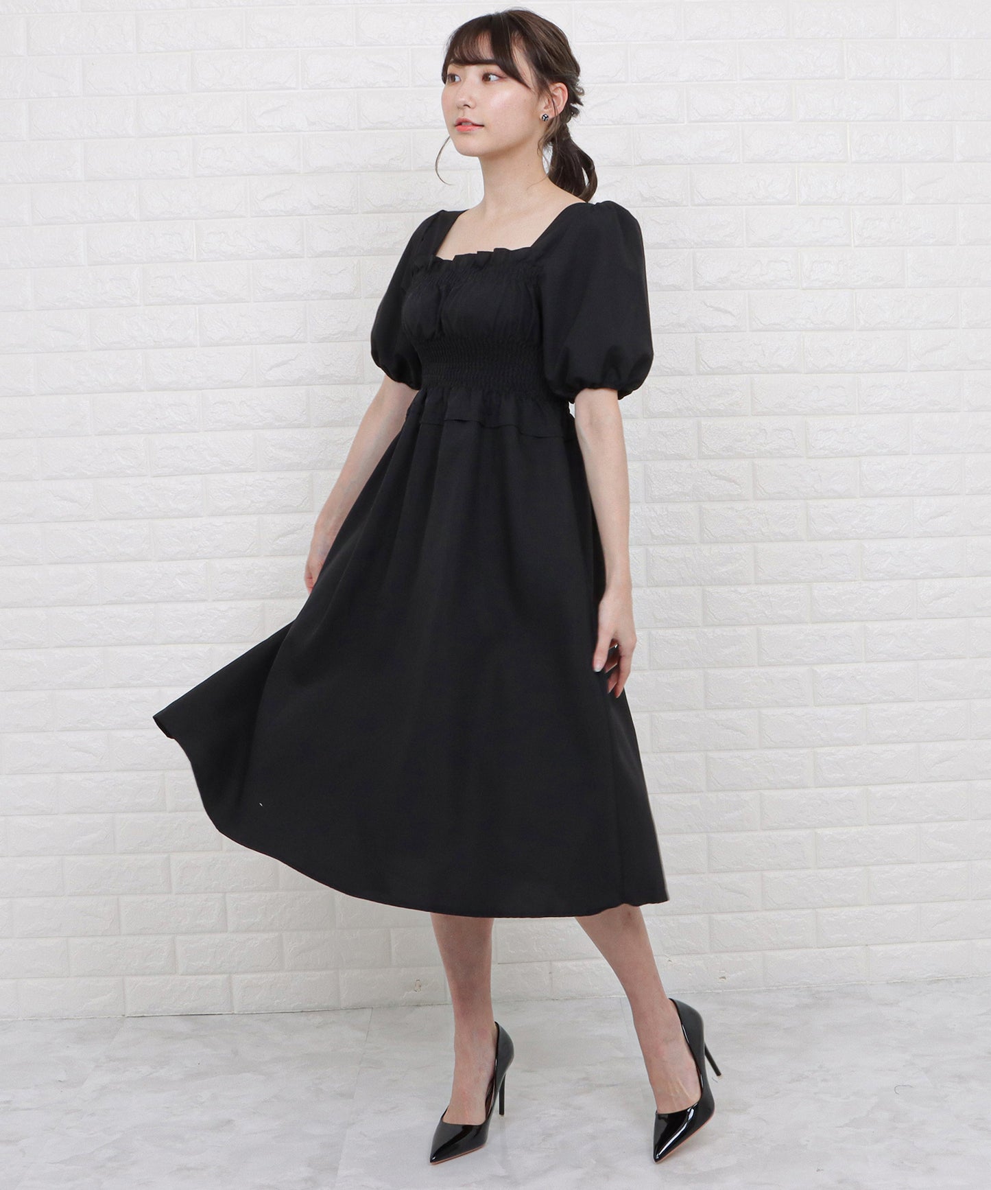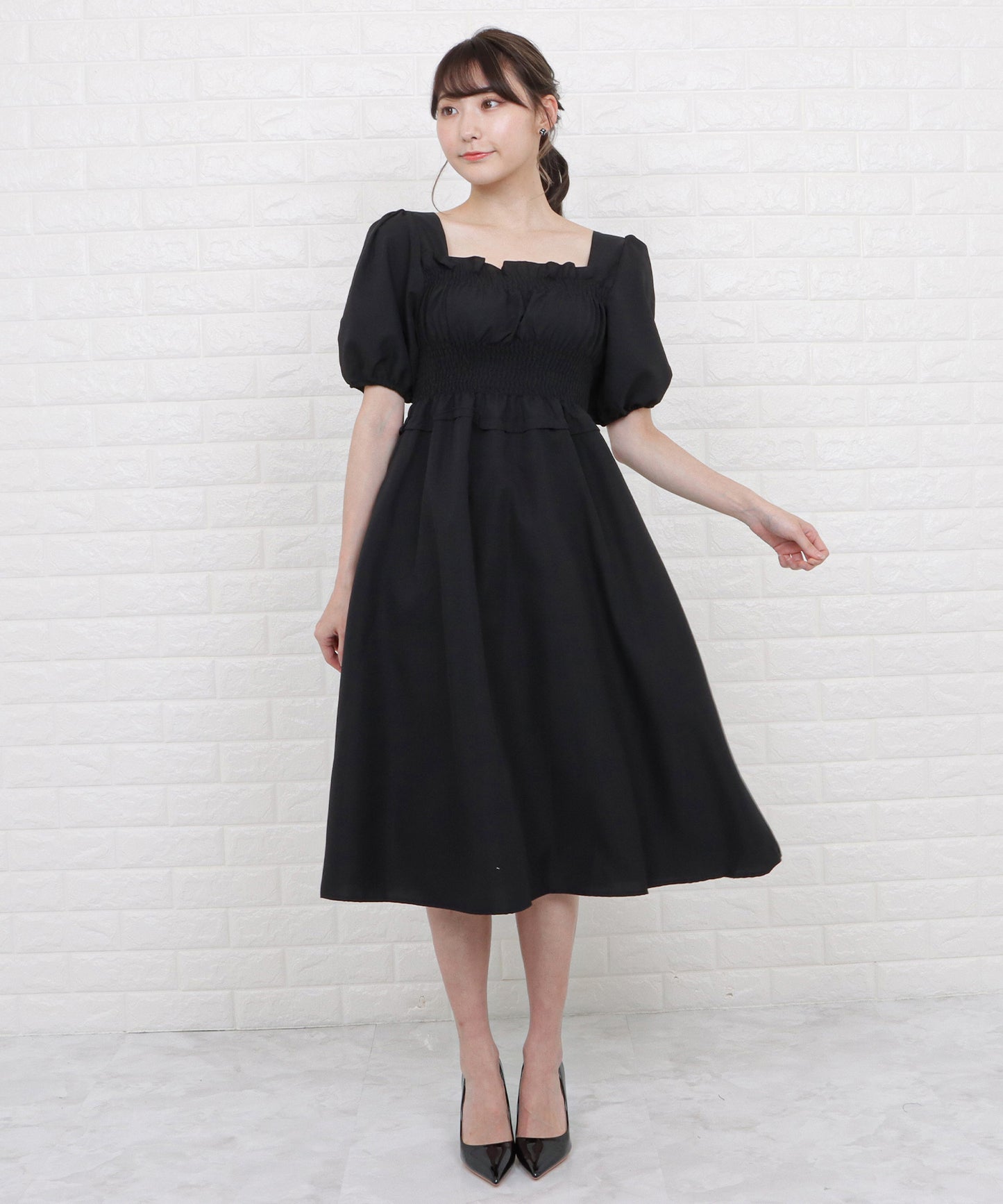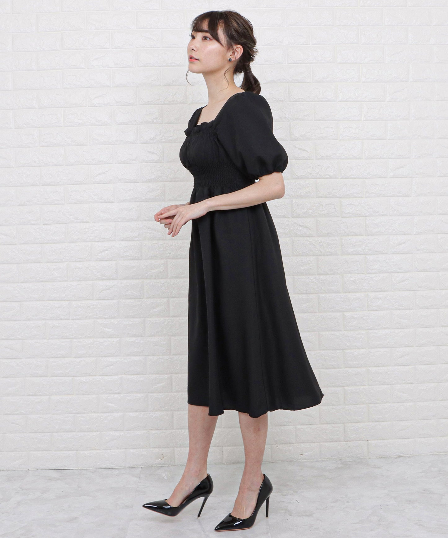 シャーリングデザインがが女性らしい、美シルエットのスクエアネックワンピース