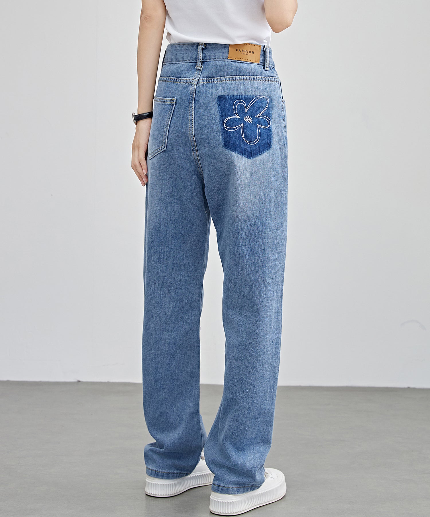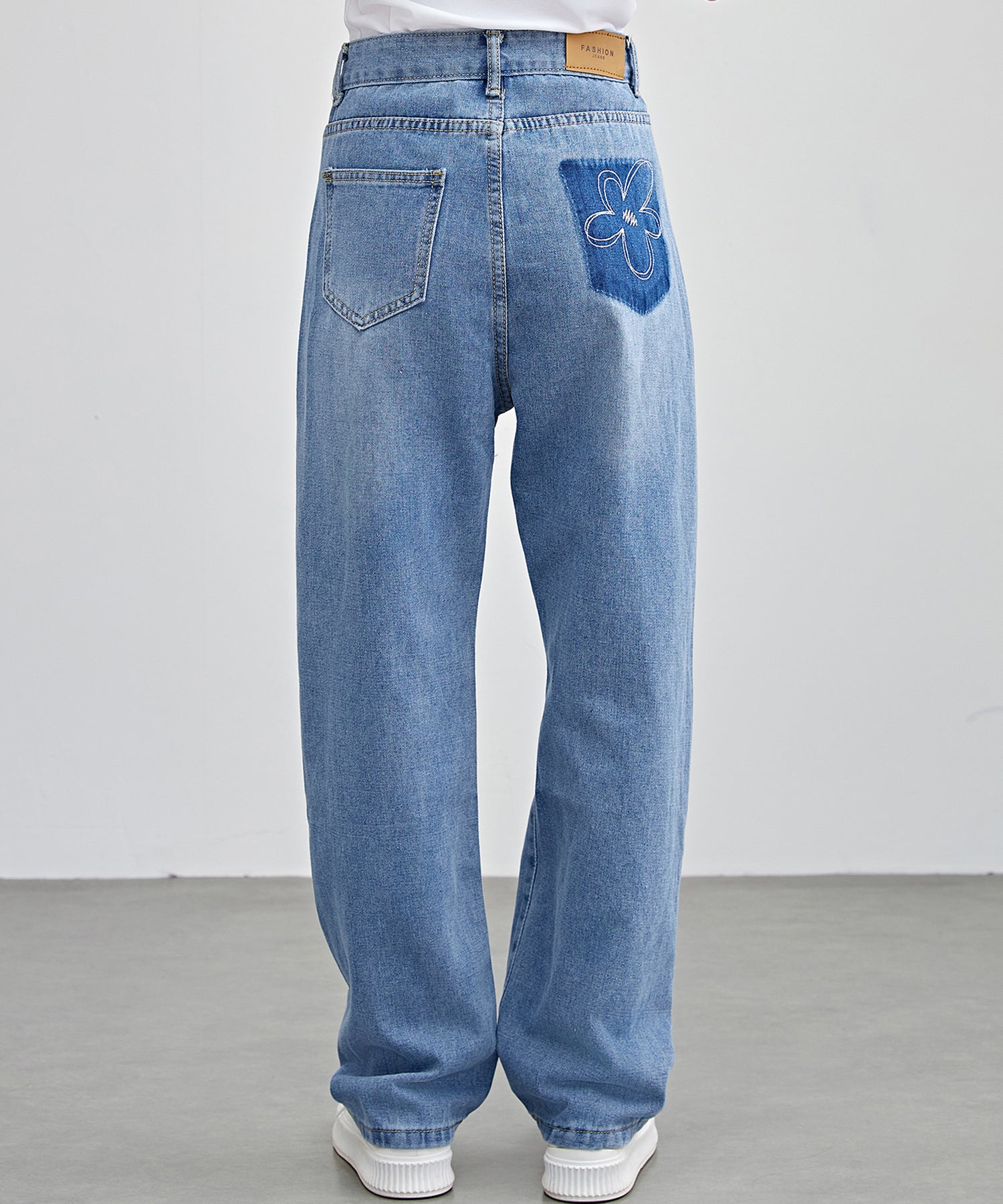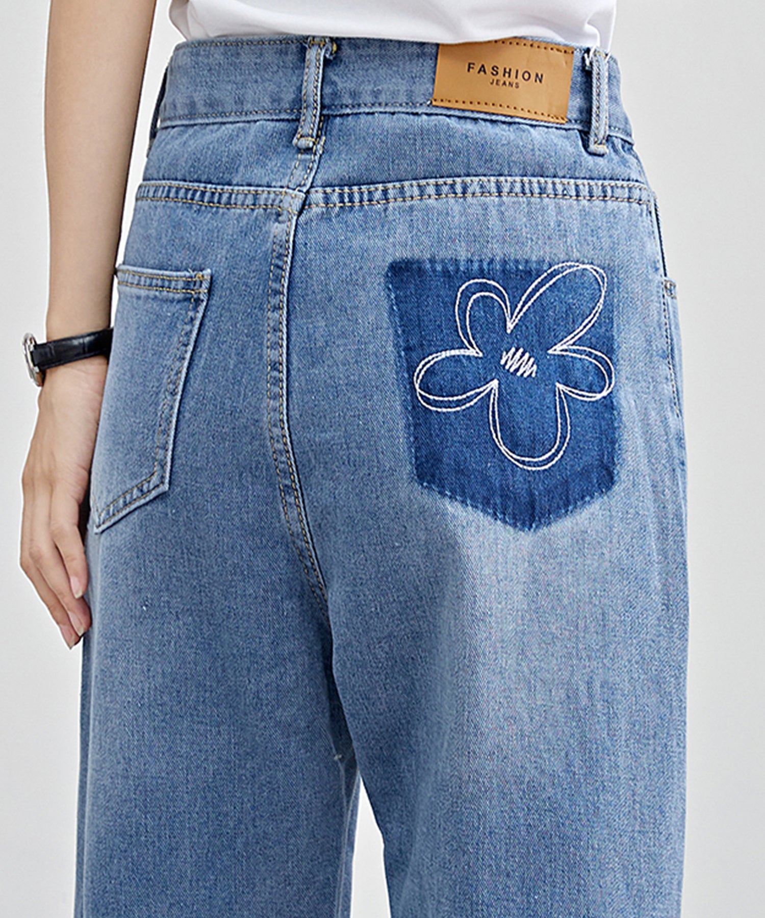 アクセントにはバックポケットに花柄のステッチをほどこし、さりげなく可愛らしい表情をプラスしました。